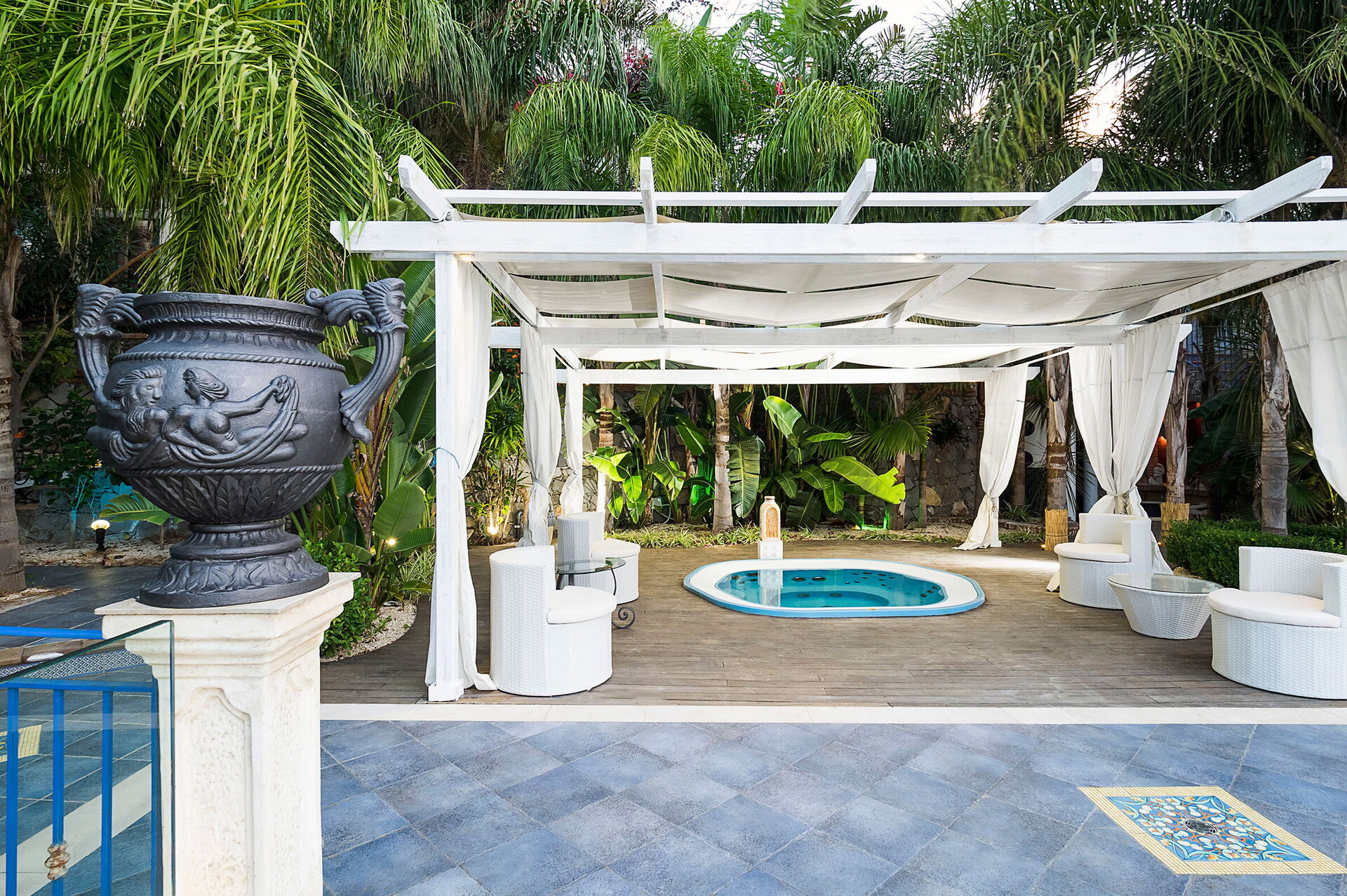 Le panoramiche zone esterne offrono numerose aree comuni e permettono agli ospiti di trascorrere un piacevole soggiorno in famiglia o tra amici, rilassandosi nella terrazza attrezzata per mangiare all’aperto o nell’ ampia zona piscina con vista mare ideale per trascorrere indimenticabili momenti sotto il sole della Sicilia.