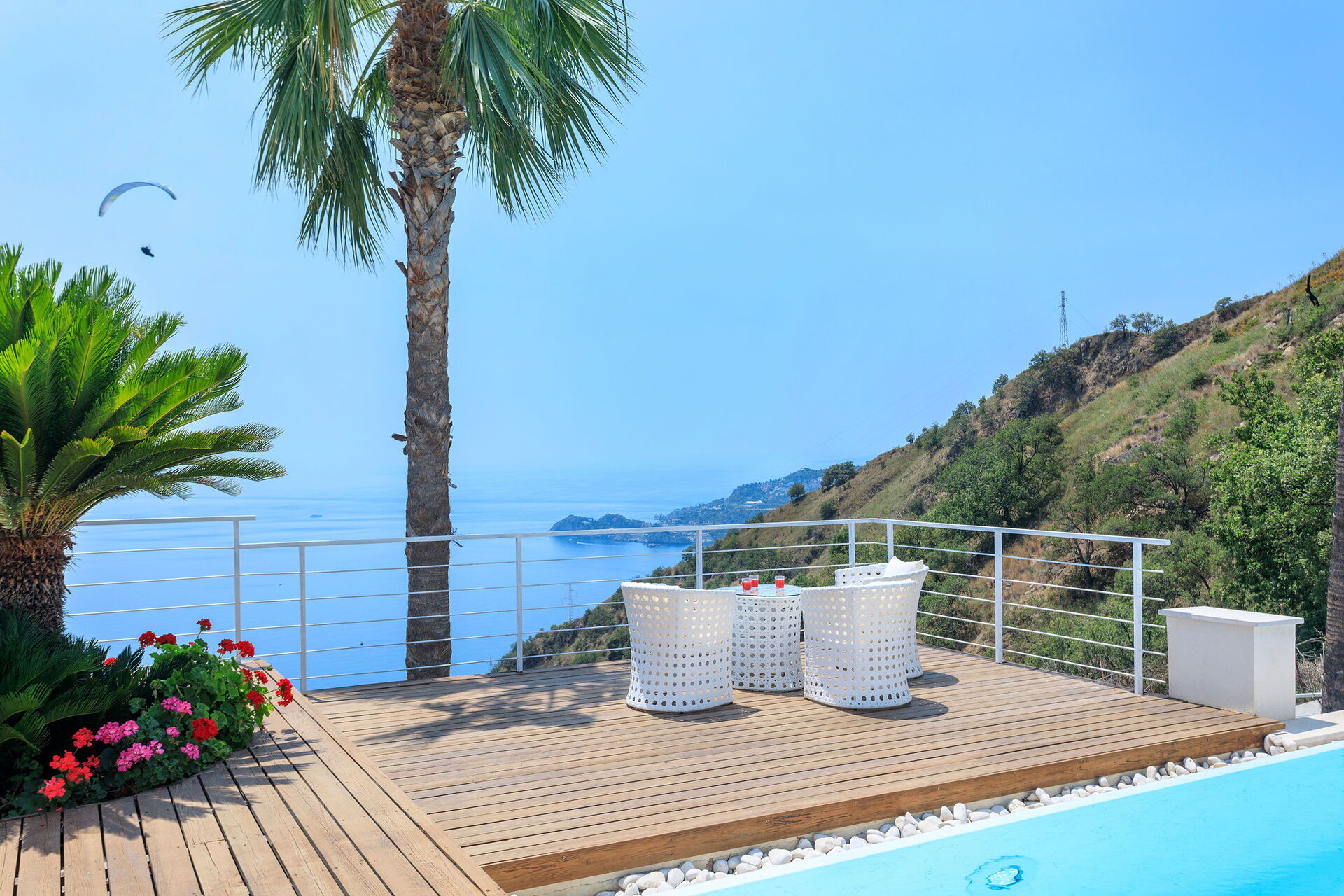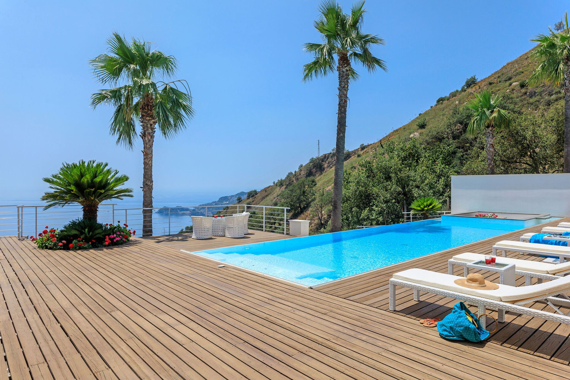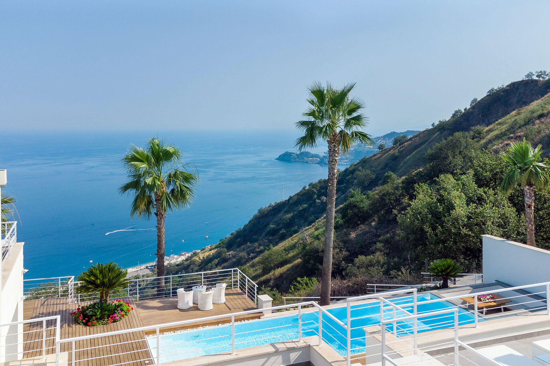 Moderna e luminosa, questa esclusiva villa per vacanze gode di una scenografica posizione panoramica con vista mozzafiato sul mare e sulla baia di Taormina, che è possibile ammirare sia dalla piscina a sfioro con zona idromassaggio che dalle sue ampie terrazze e dal giardino.