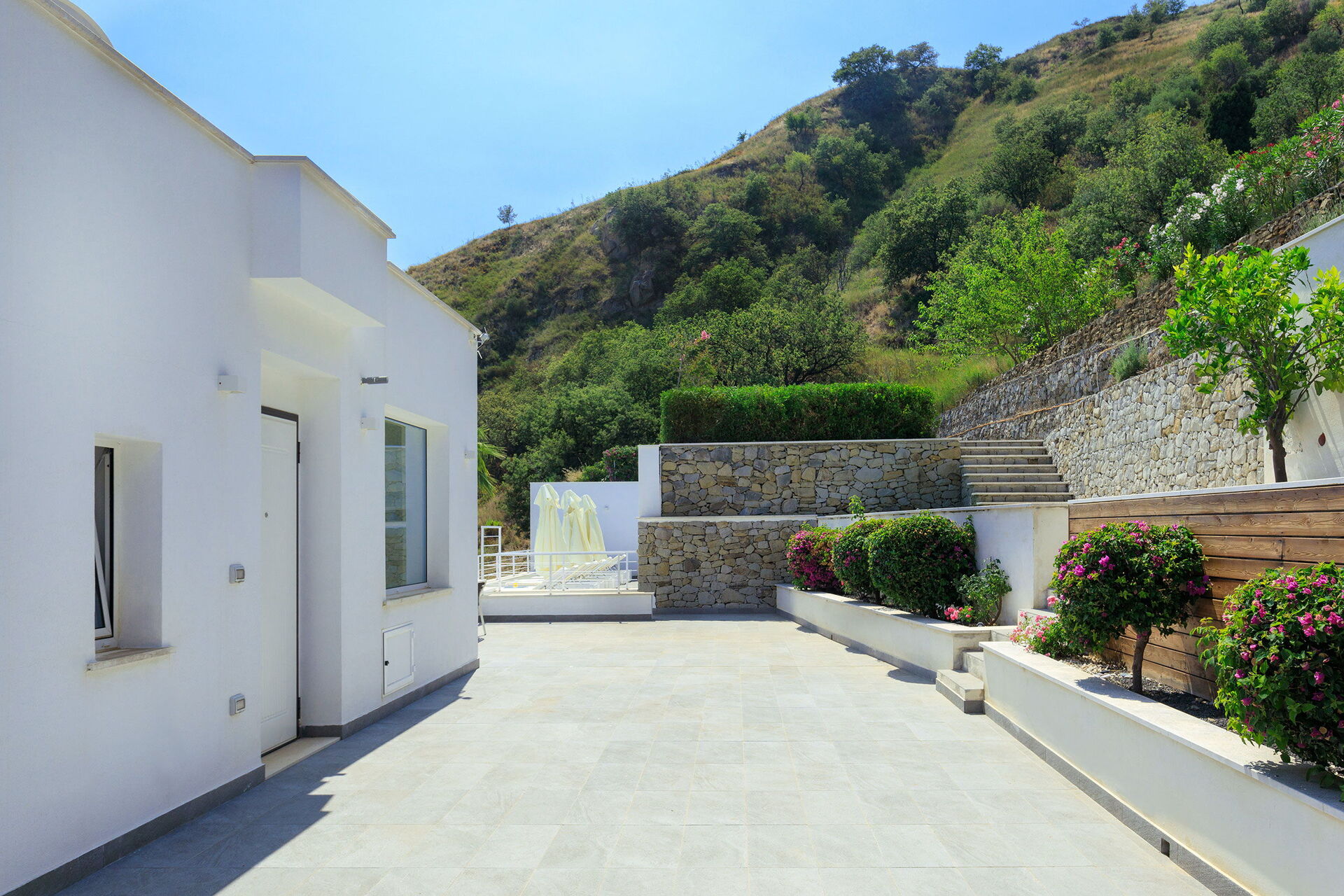 Le panoramiche zone esterne offrono numerose aree che permettono agli ospiti di trascorrere un piacevole soggiorno in famiglia o tra amici, rilassandosi nel patio attrezzato per mangiare all’aperto o nell’ ampia zona piscina con spettacolare vista mare ideale per trascorrere indimenticabili momenti sotto il sole della Sicilia.