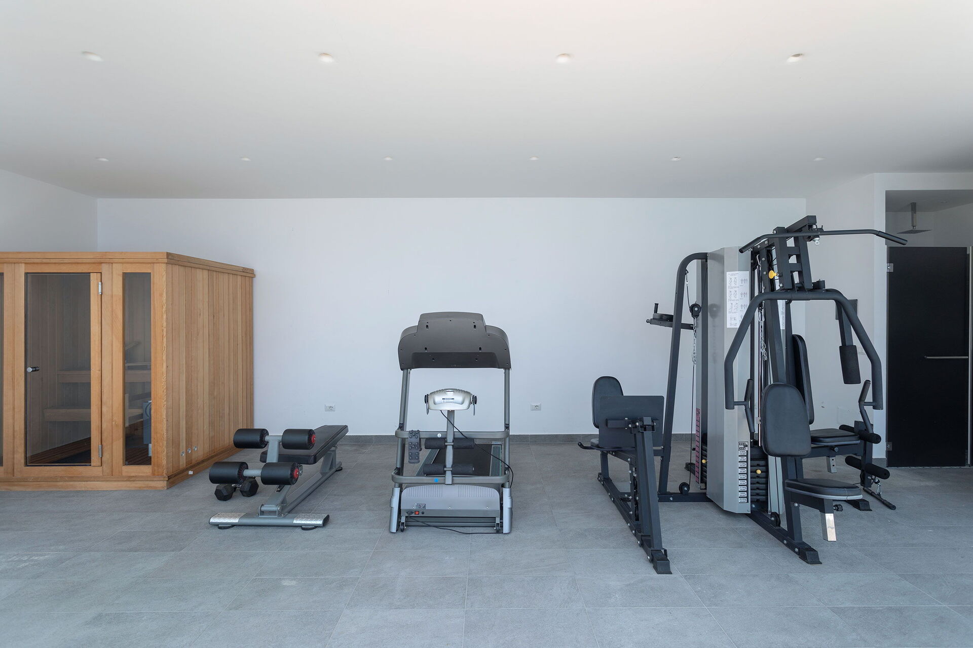 Piano terreno: ampio open-space con soggiorno e cucina (piano cottura, forno, frigorifero, freezer, lavastoviglie, microonde, tostapane, macchina da caffè espresso) con zona pranzo e accesso a panoramico patio attrezzato per mangiare all’aperto, WC, palestra con sauna e bagno con doccia, lavanderia, camera matrimoniale (aria condizionata) con bagno privato con doccia.