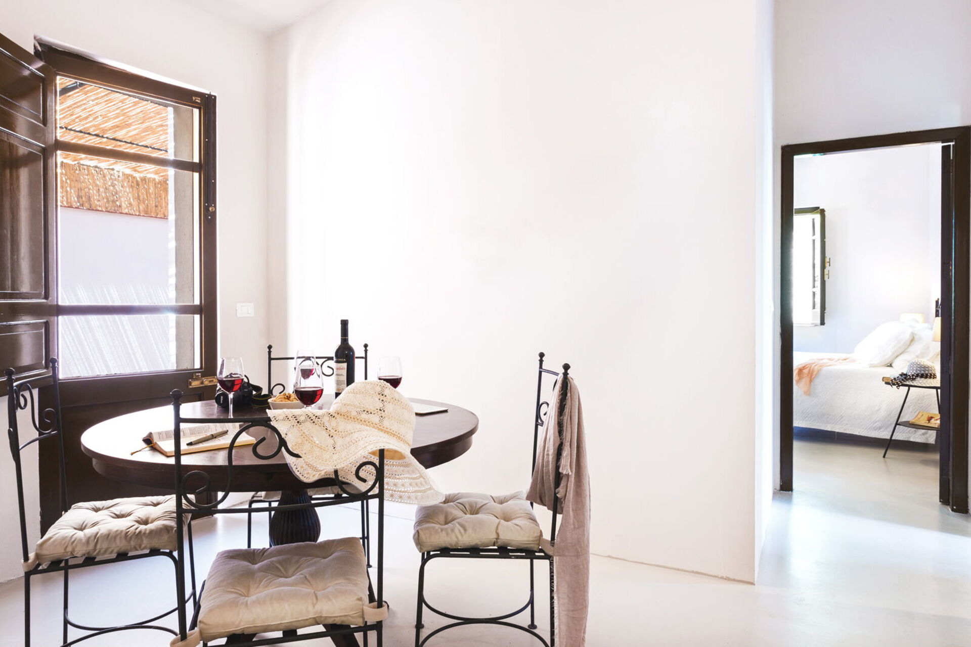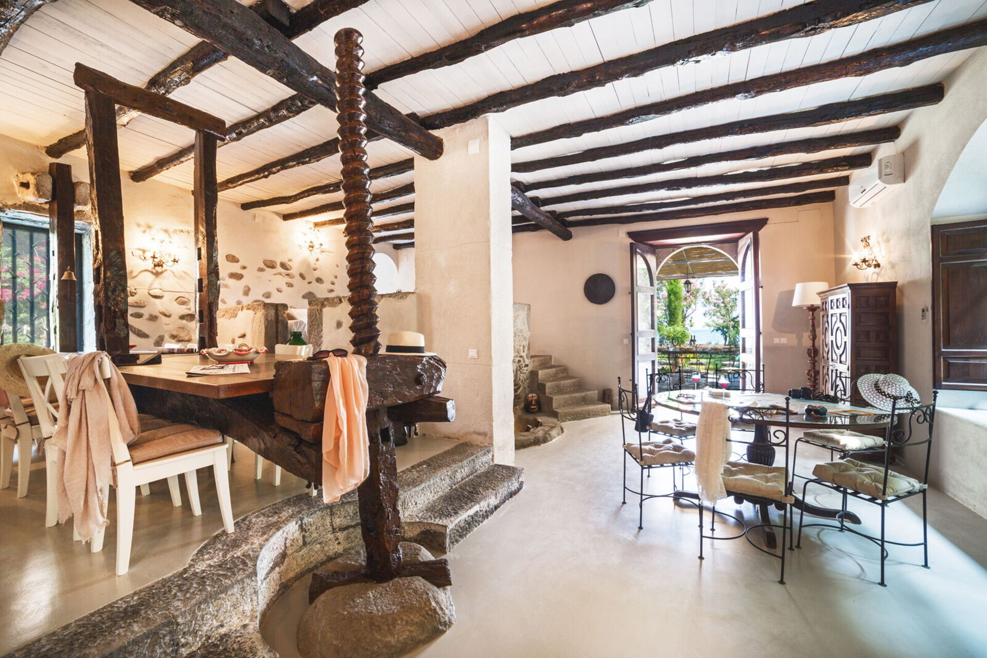 Circondata da un esteso e rigoglioso giardino di palme e ulivi secolari dispone di accoglienti ambienti interni arredati con cura e conservando alcuni elementi davvero unici nel suo genere come il torchio che sorregge il tavolo da pranzo, chiaro riferimento al passato agricolo della villa.