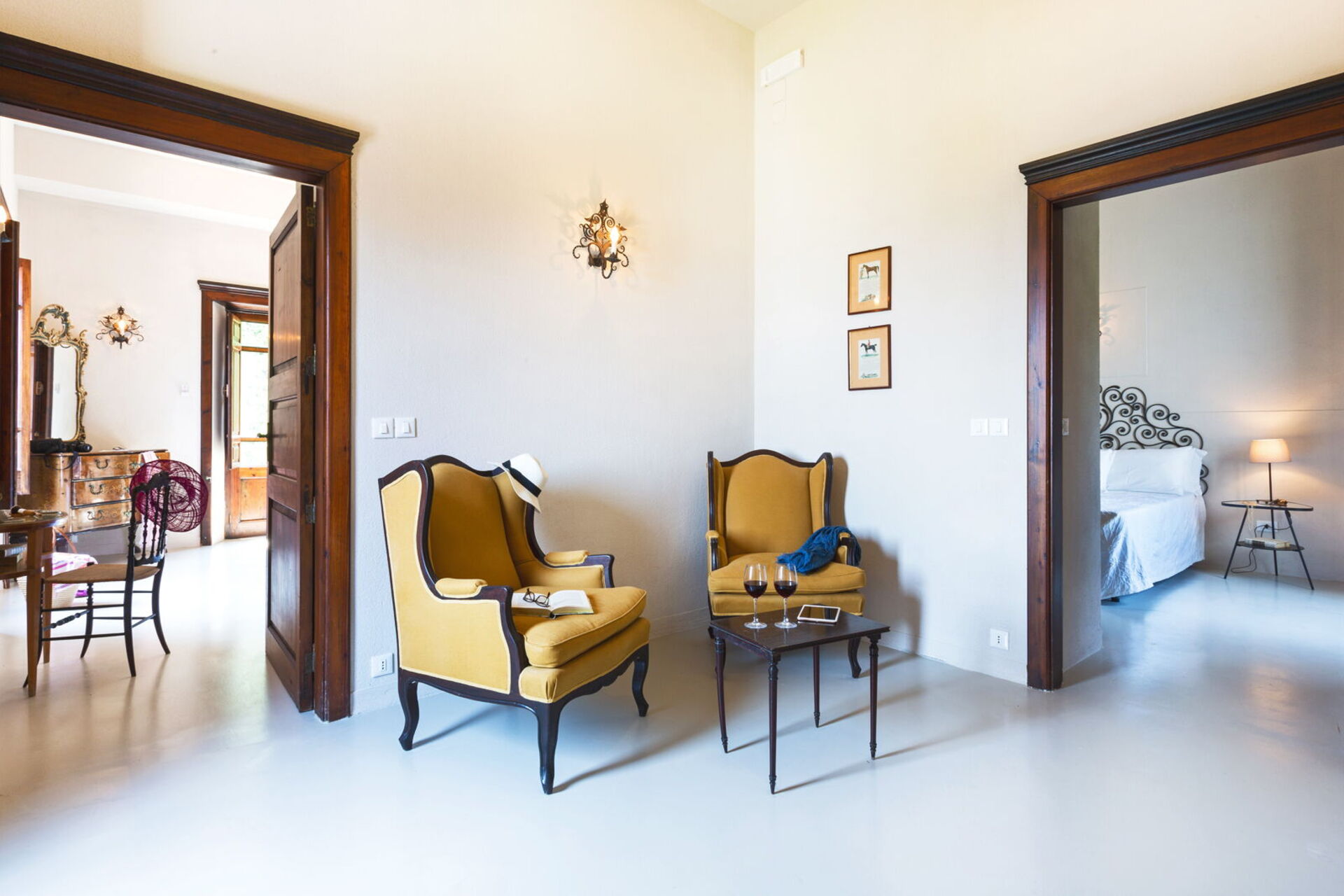 Piano primo: ingresso (tavolo e sedie, macchina per il caffè), camera matrimoniale (aria condizionata) con bagno privato con doccia, 2 camere matrimoniali (aria condizionata), bagno con doccia.