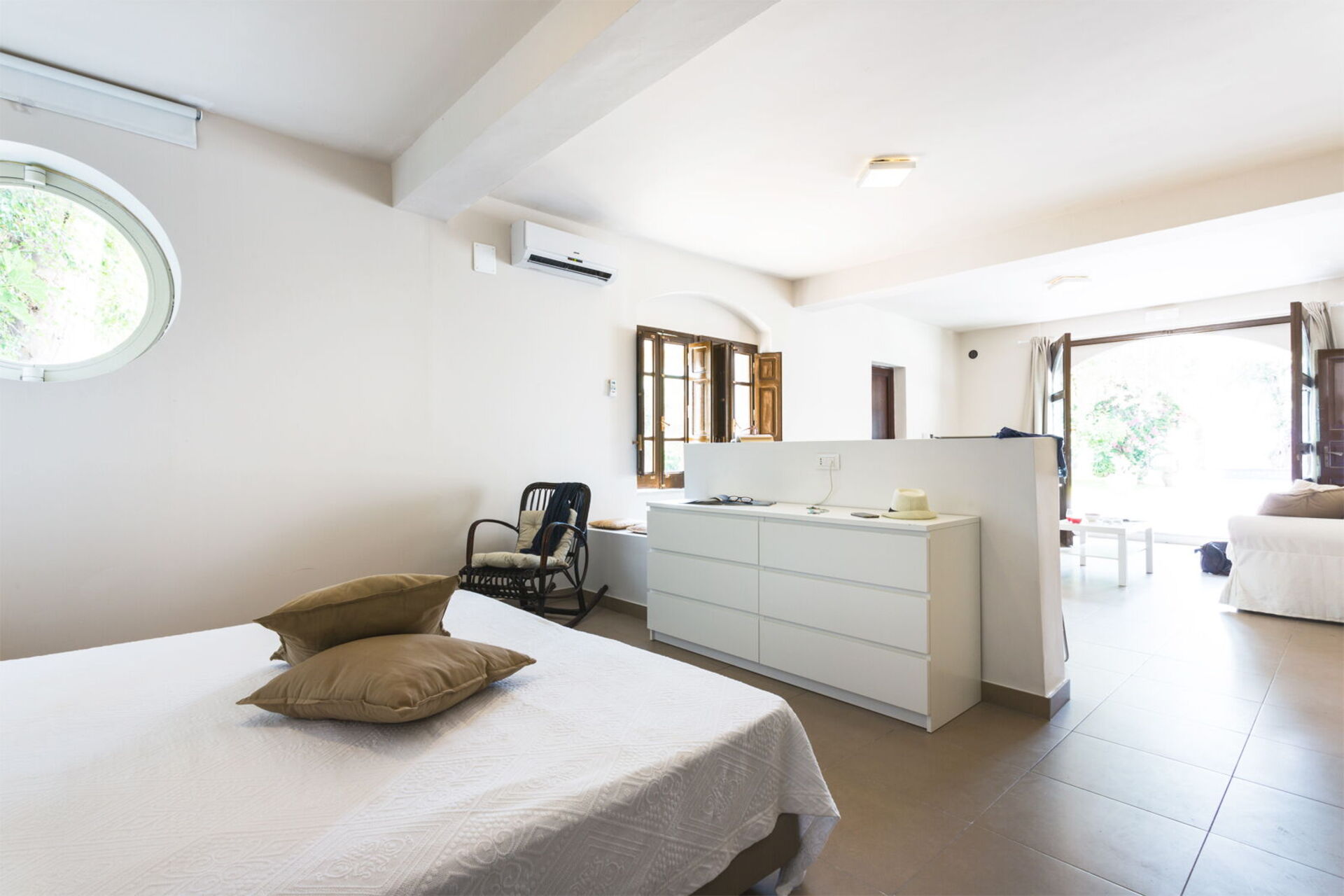 Piano terreno: (accessibile solo dall’esterno e non collegata internamente al resto della dependance): open space con soggiorno e angolo cottura, letto matrimoniale e bagno privato con doccia.