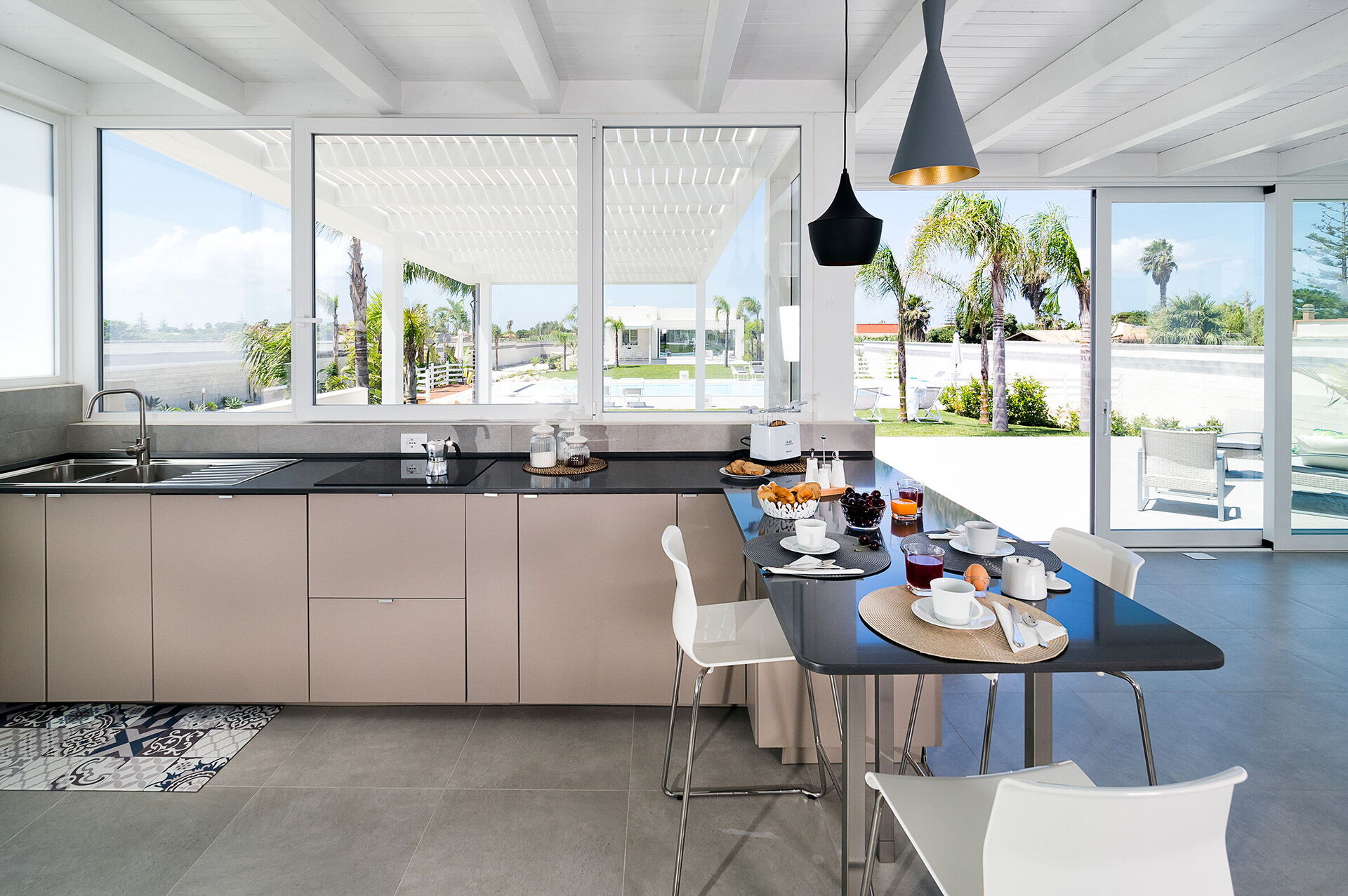 Piano inferiore: (accessibile solo dall’esterno e non collegata internamente al resto della villa): soggiorno (aria condizionata, smart-tv) con zona pranzo e cucina (piano cottura, forno, frigorifero, freezer, lavastoviglie), camera matrimoniale (aria condizionata), camera con 2 letti singoli (aria condizionata), 2 bagni con doccia.