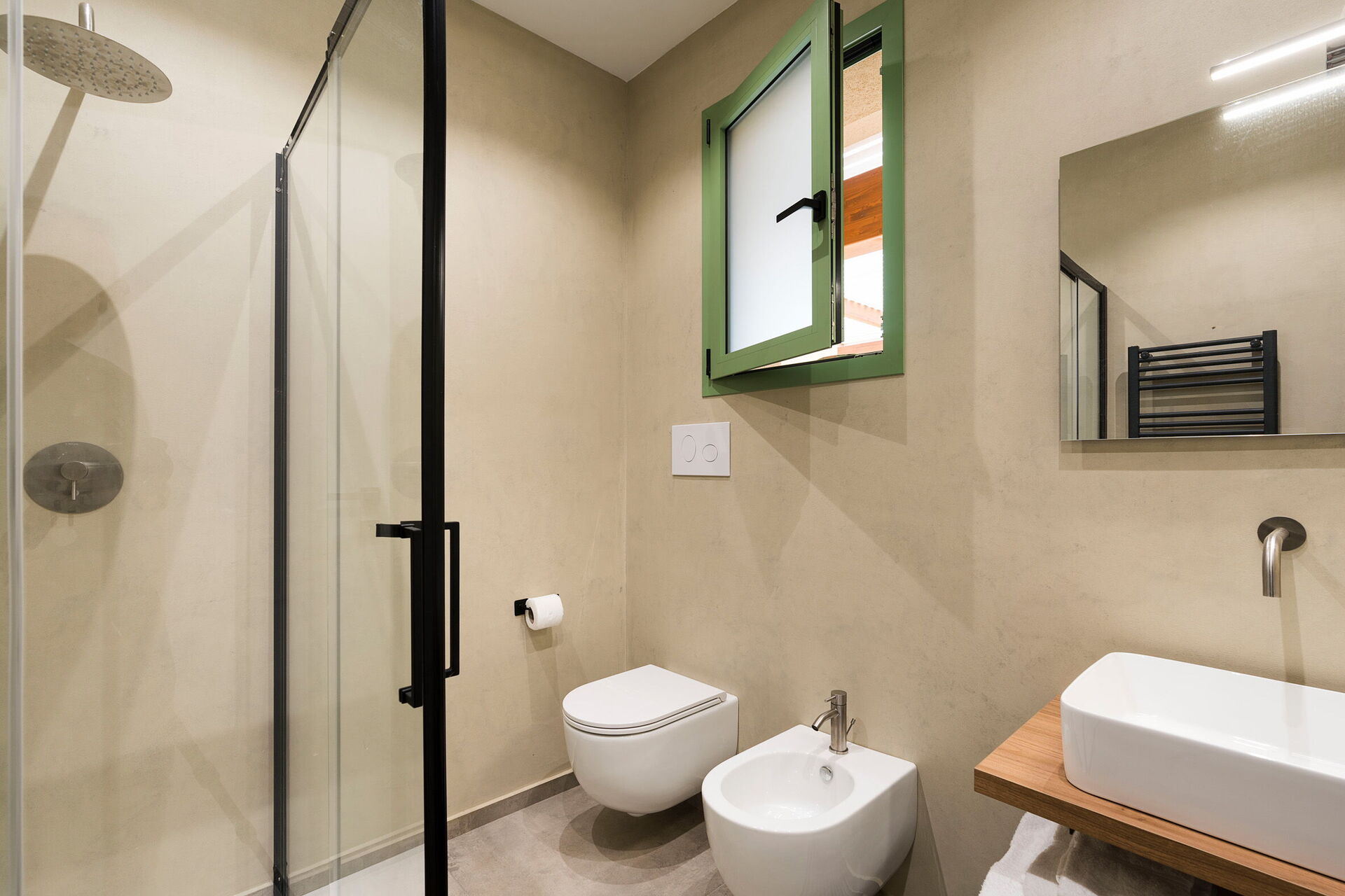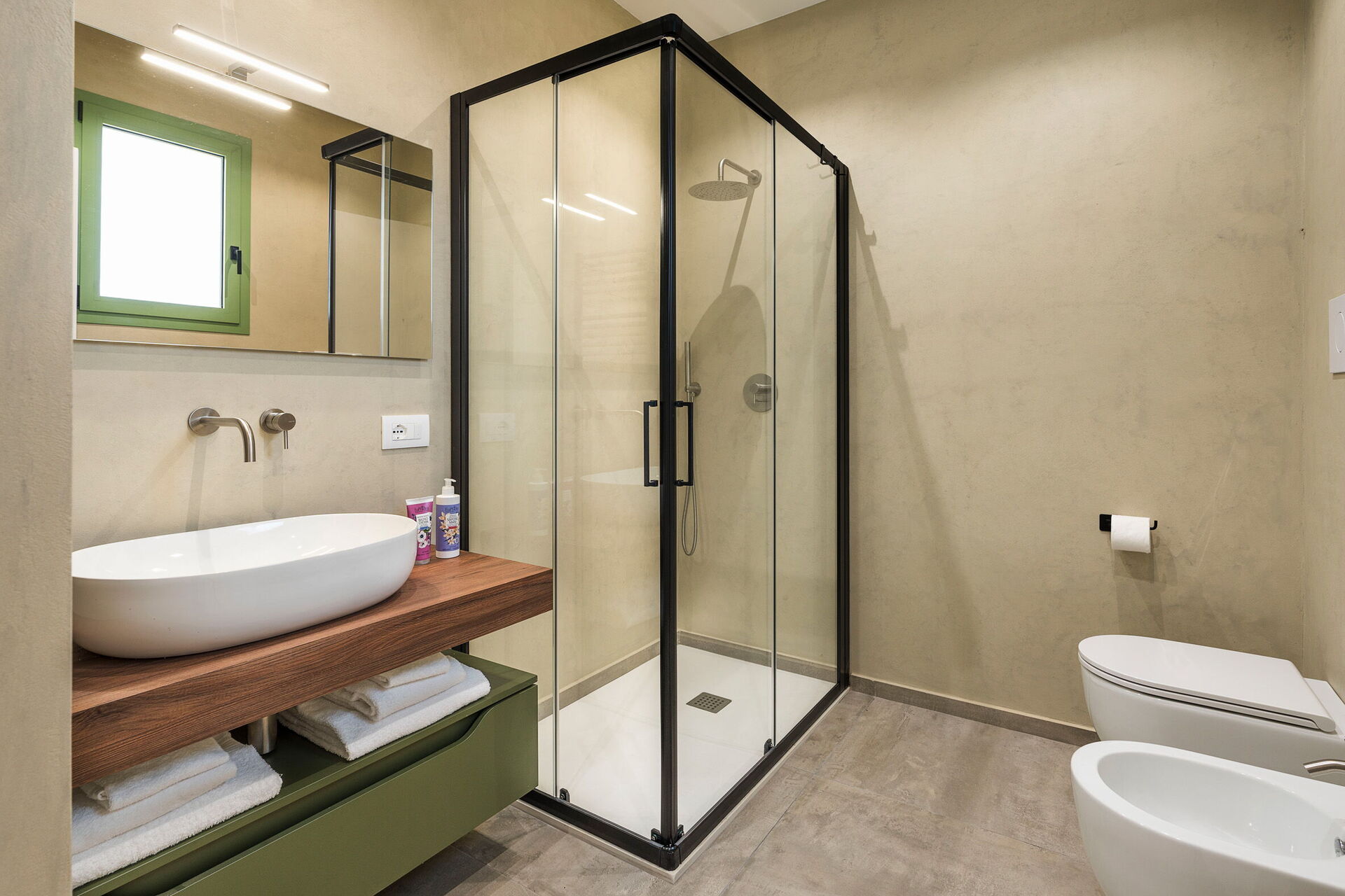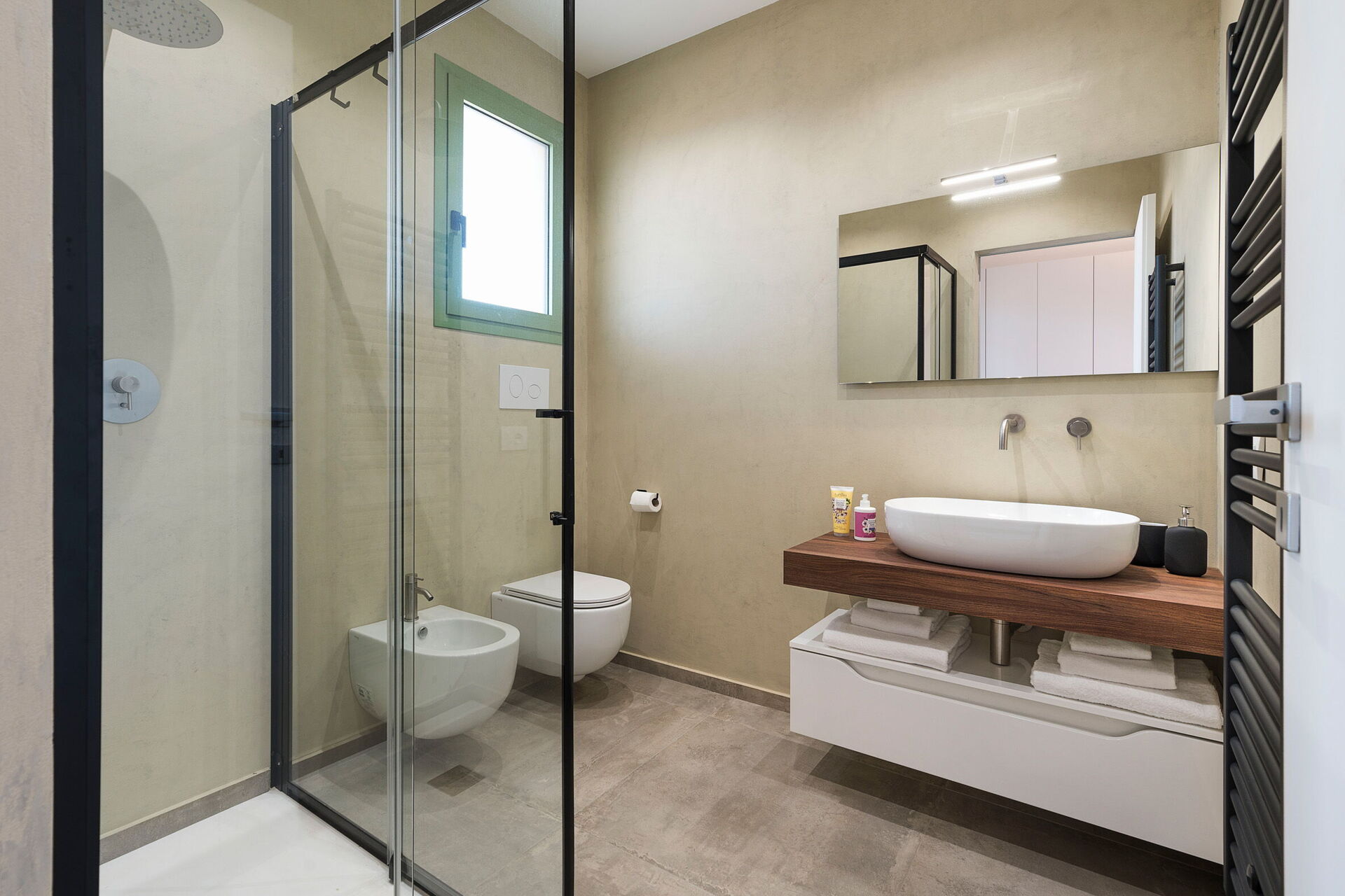 Piano terreno: soggiorno (aria condizionata, tv) con zona pranzo e cucina (piano cottura, forno, frigorifero, freezer, lavastoviglie, microonde, tostapane, macchina da caffè espresso, macchina da caffè americano), wc, 3 camere matrimoniali (aria condizionata) ognuna con bagno privato con doccia.
