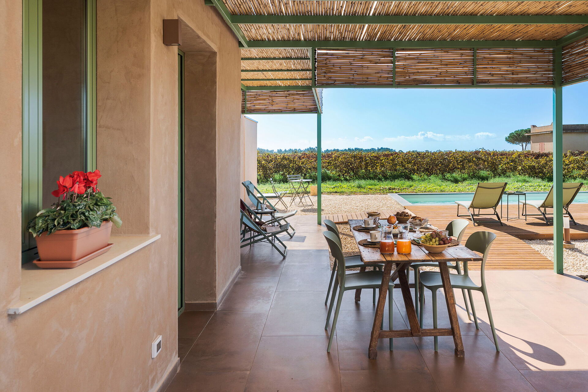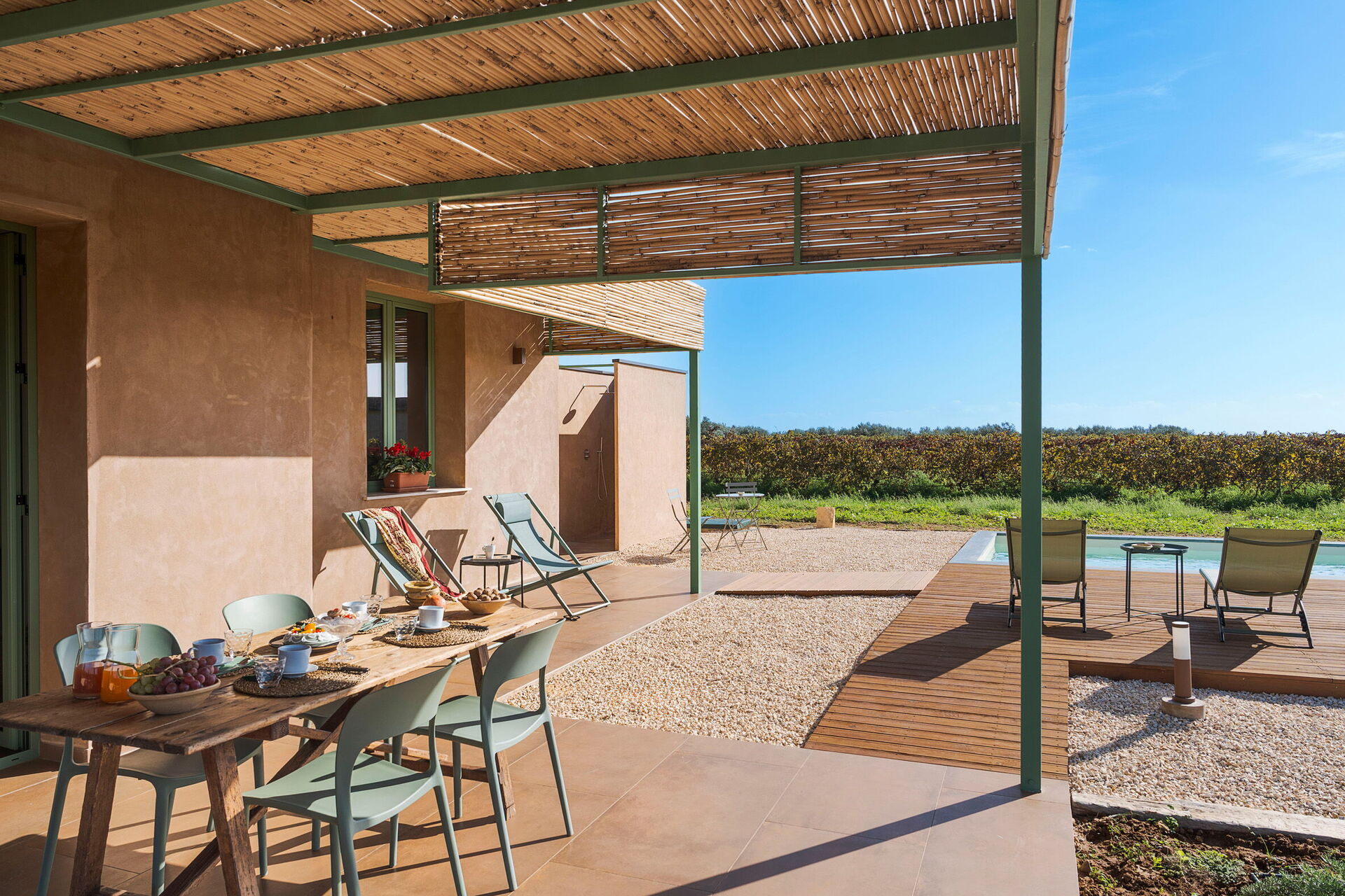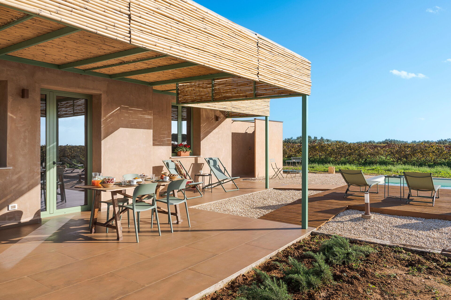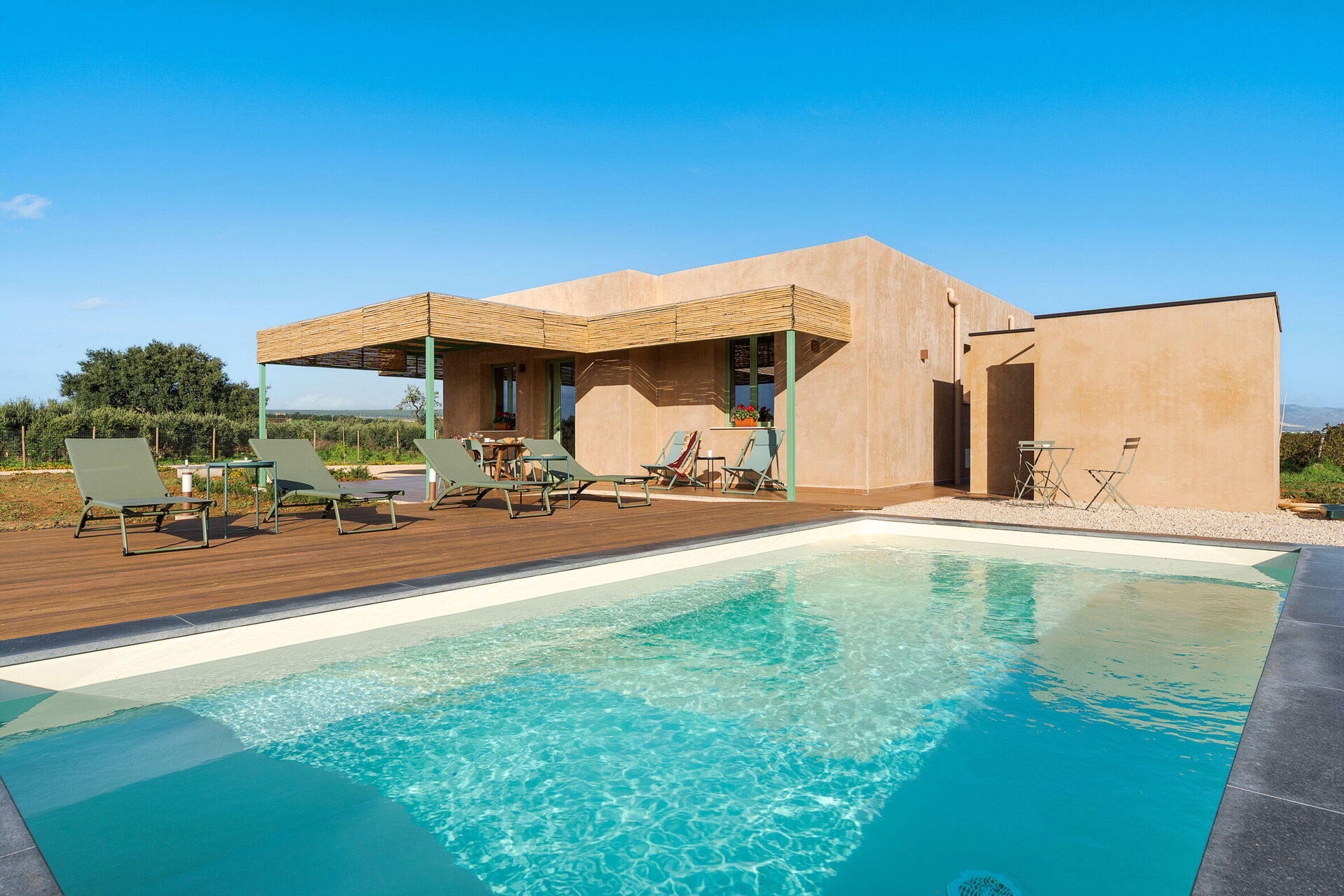 Gli esterni della villa sono progettati per massimizzare la vita all'aria aperta. La proprietà dispone di una piscina privata depurata a sale, circondata da una terrazza solarium pavimentata e attrezzata con lettini. Adiacente all'abitazione si trova una grande veranda ombreggiata da una pergola, dotata di tavolo per i pasti all'aperto e servita da una pratica area barbecue in muratura. L'assenza di strutture confinanti garantisce silenzio e totale riservatezza nella campagna siciliana.
