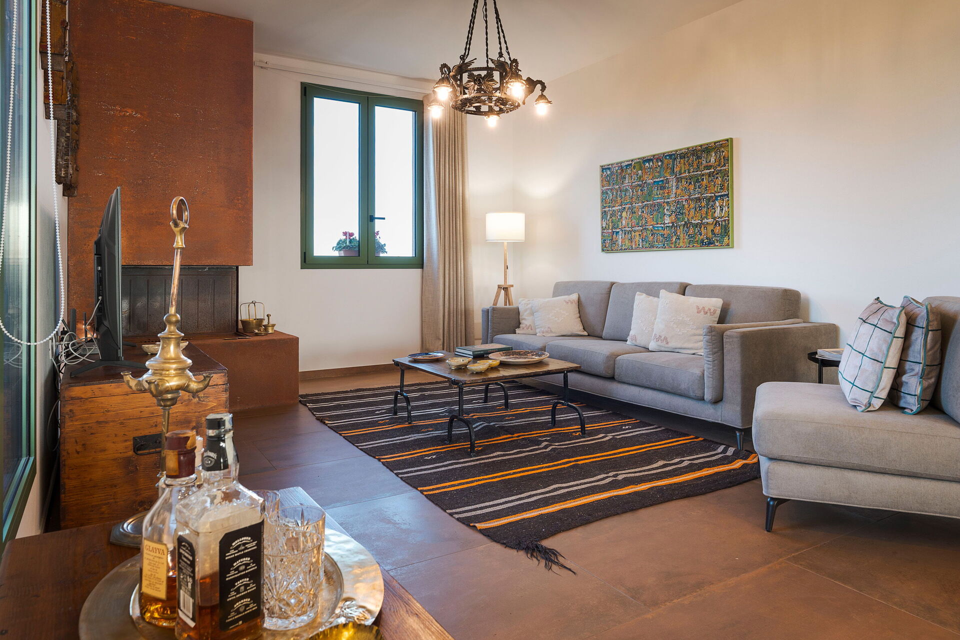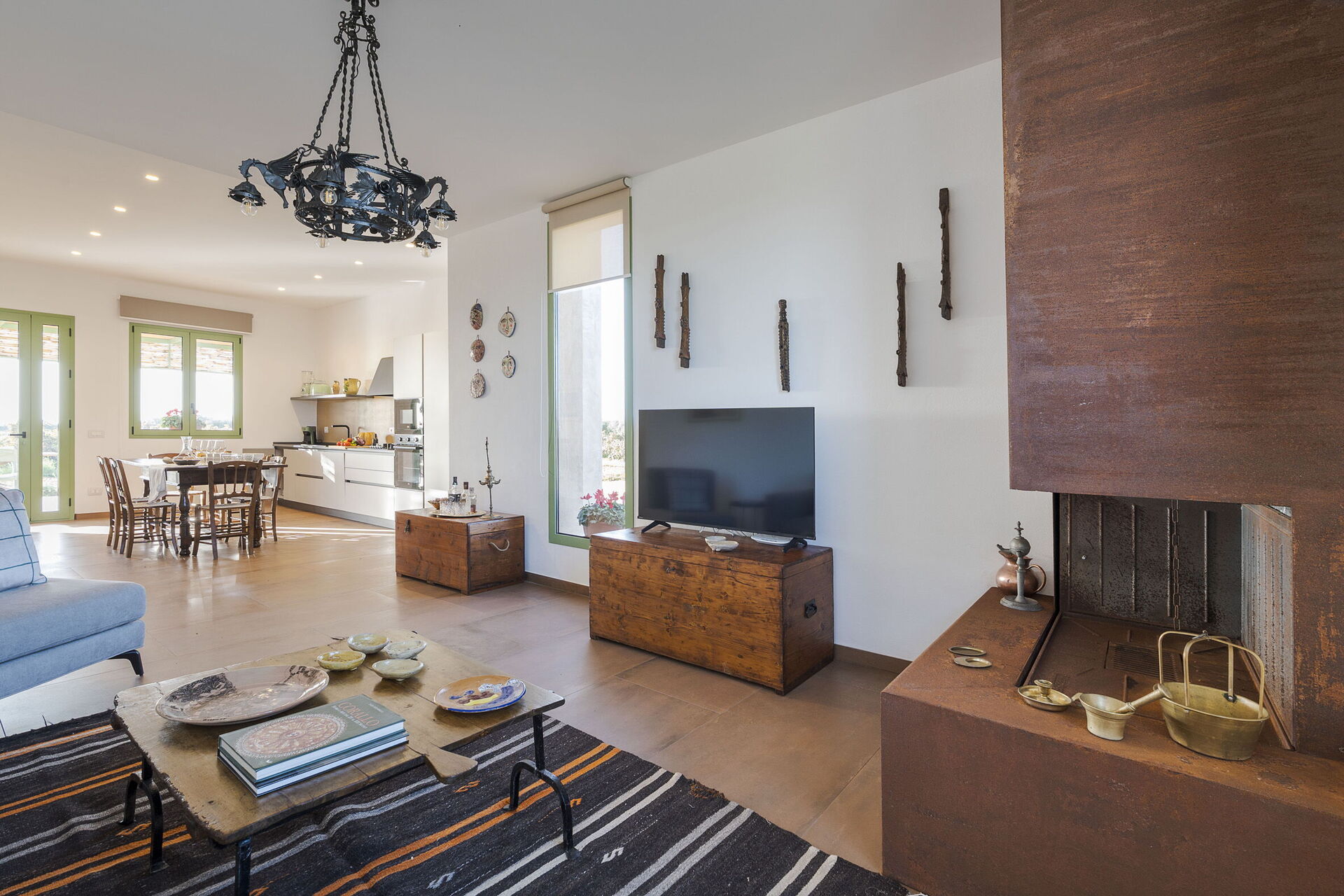 - Piano Terreno: L'ingresso si apre su una luminosa zona giorno composta da un soggiorno con camino e TV, e da una zona pranzo con angolo cottura. La cucina è moderna e completamente equipaggiata con piano cottura, forno, frigorifero, freezer, lavastoviglie, microonde, tostapane, macchina da caffè espresso e macchina da caffè americano. La zona notte è composta da una camera matrimoniale principale dotata di letto king size (180 x 200 cm), una seconda camera matrimoniale con letto standard (160 x 200 cm) e un bagno completo provvisto di doccia.