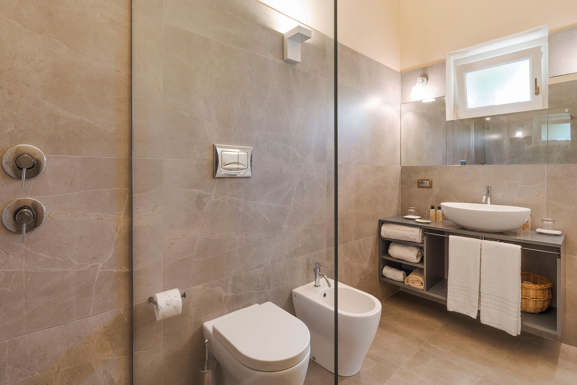 Piano terreno (accessibile solo dal cortile esterno e non collegata internamente al resto della villa): camera con letto matrimoniale (trasformabile su richiesta in 2 letti singoli misure del letto: 200/100 x 200 cm) con angolo cottura e frigobar, e con bagno privato con doccia.