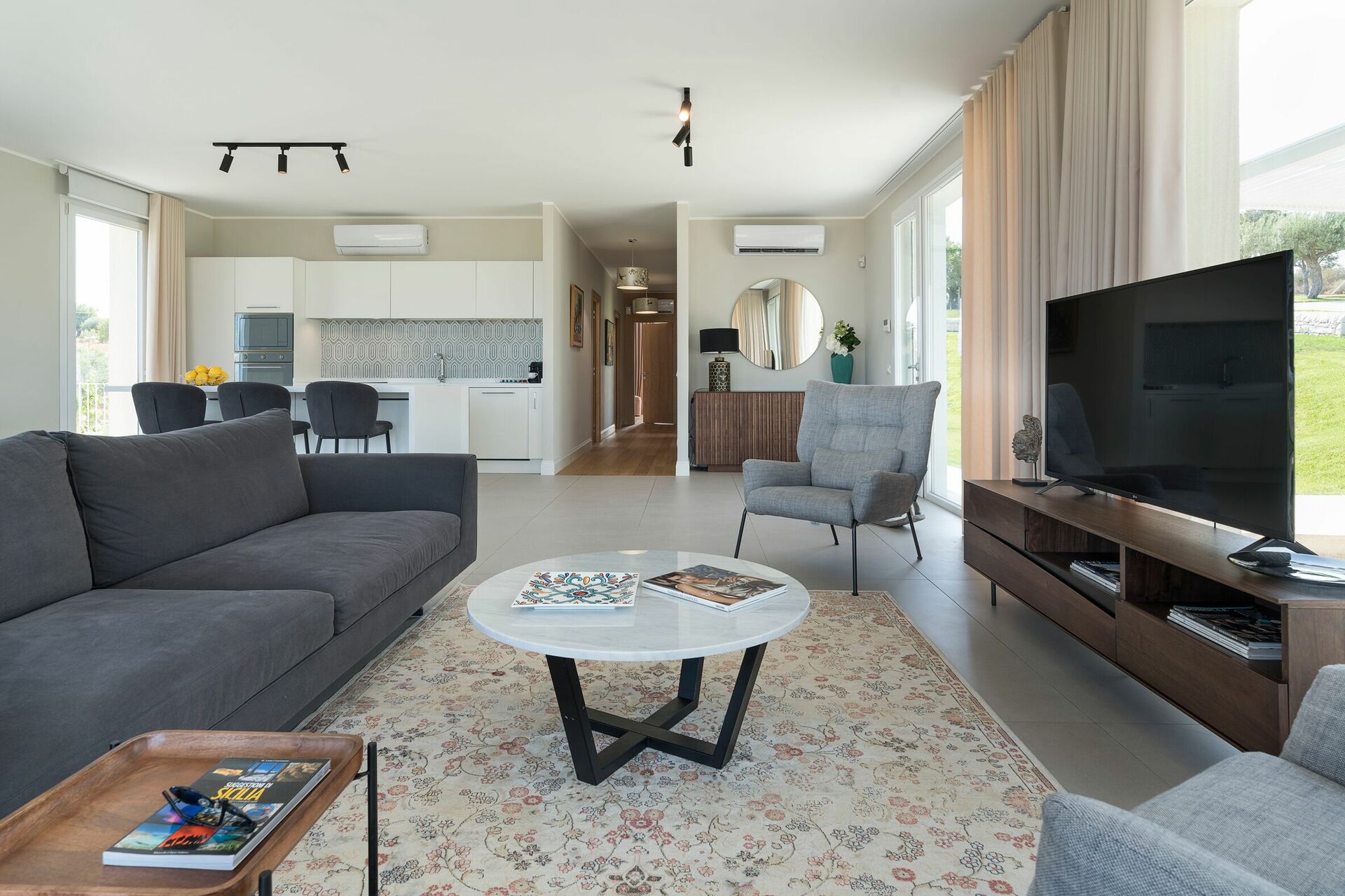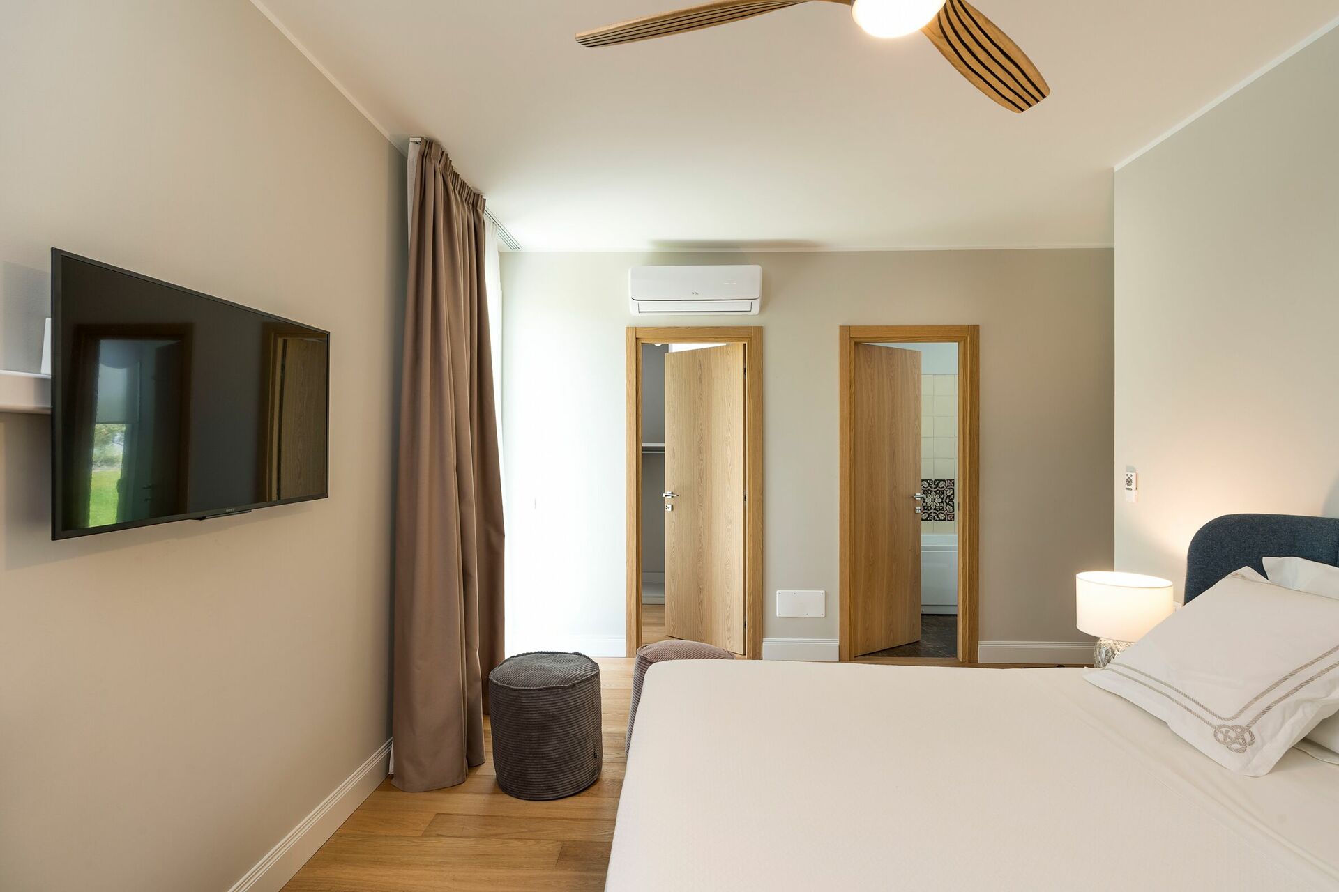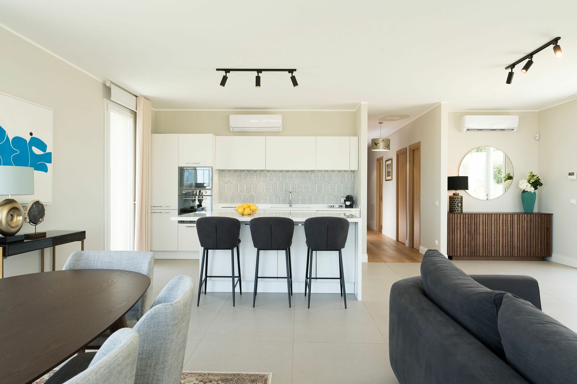Piano terreno: soggiorno con zona pranzo e cucina (forno, freezer, microonde, macchine da caffè, lavastoviglie), lavanderia, 1 bagno (lavabo e wc), 1 camera matrimoniale (letto king size) con bagno privato con vasca, 2 camere matrimoniali ognuna con bagno privato con doccia.
