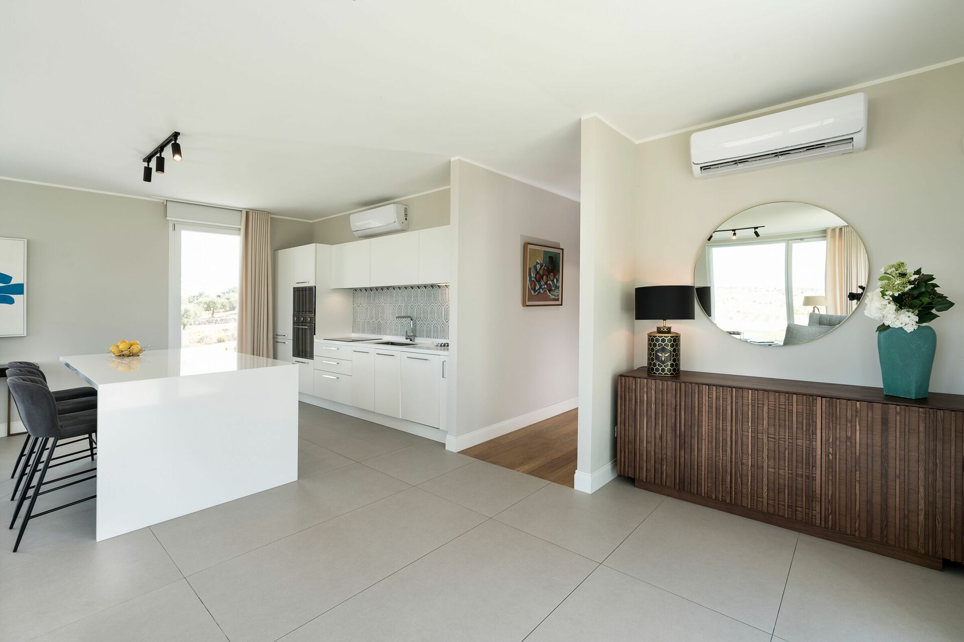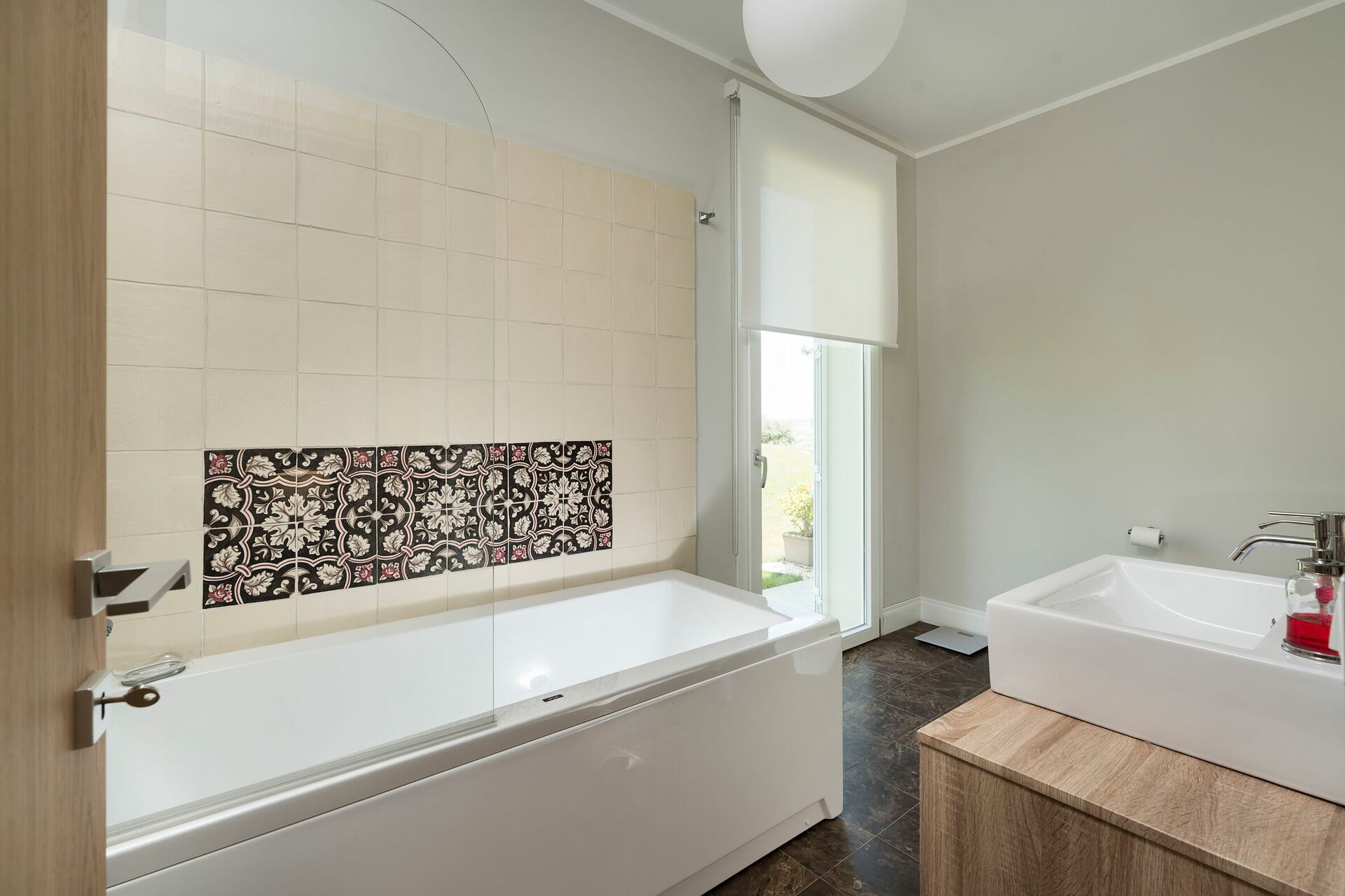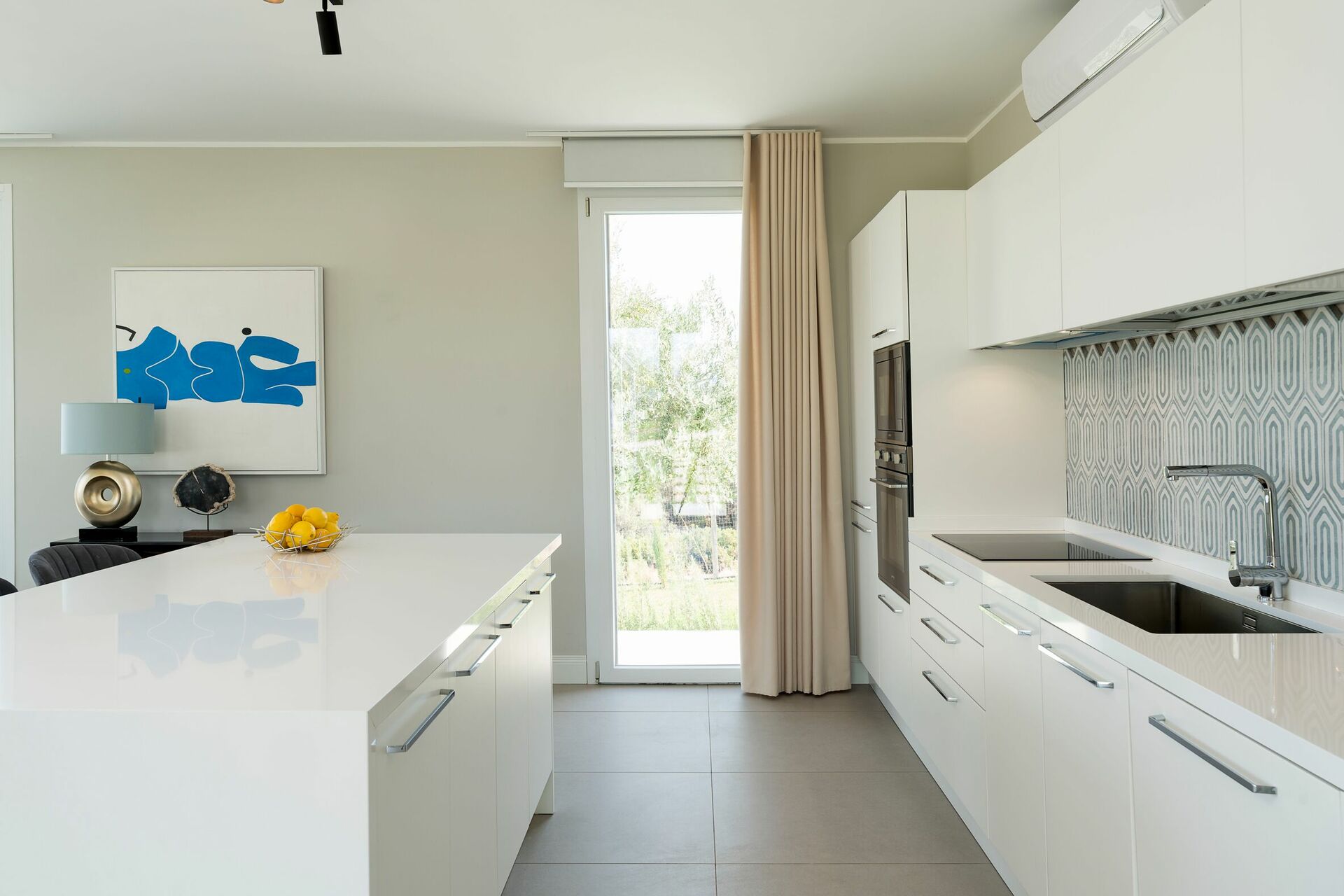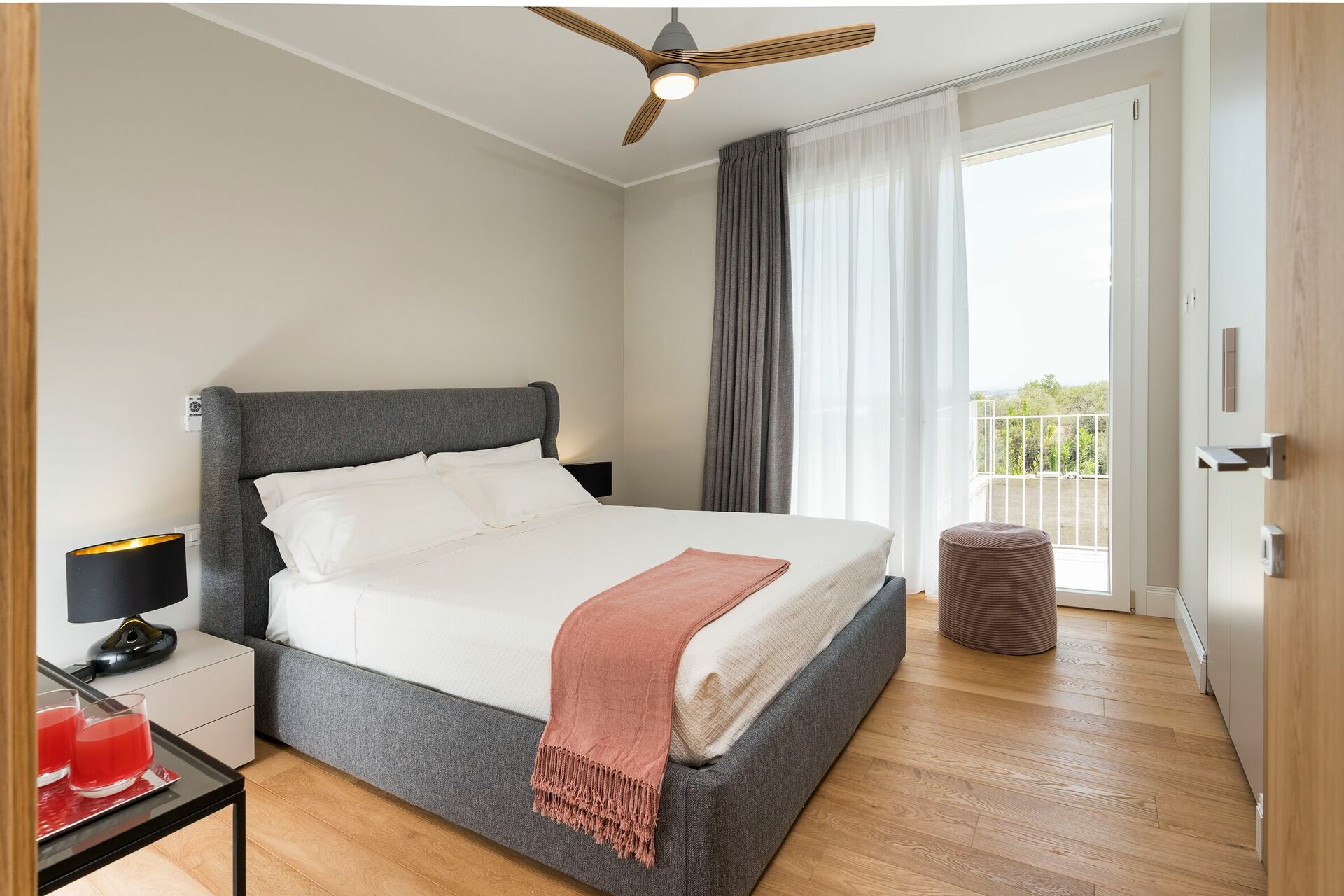 Piano terreno: soggiorno con zona pranzo e cucina (forno, freezer, microonde, macchine da caffè, lavastoviglie), lavanderia, 1 bagno (lavabo e wc), 1 camera matrimoniale (letto king size) con bagno privato con vasca, 2 camere matrimoniali ognuna con bagno privato con doccia.