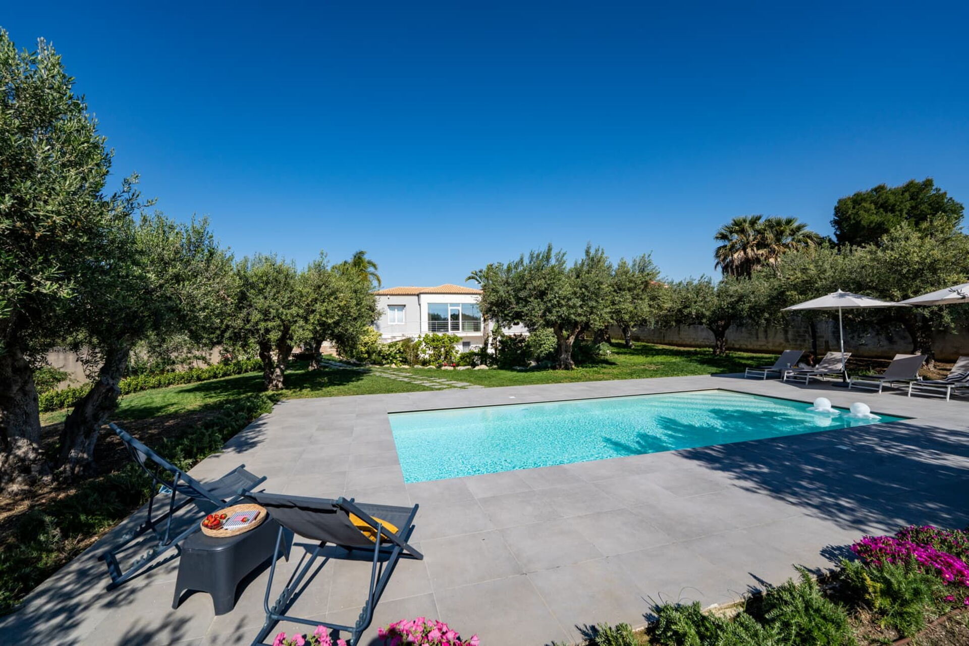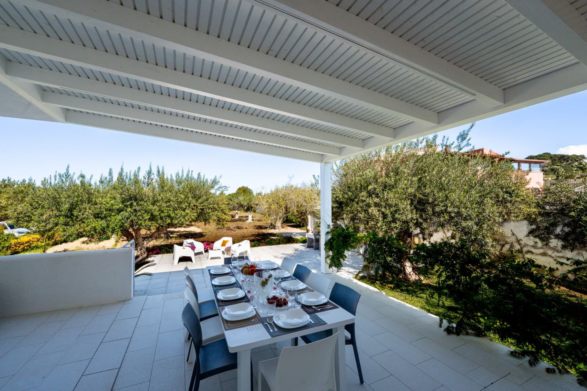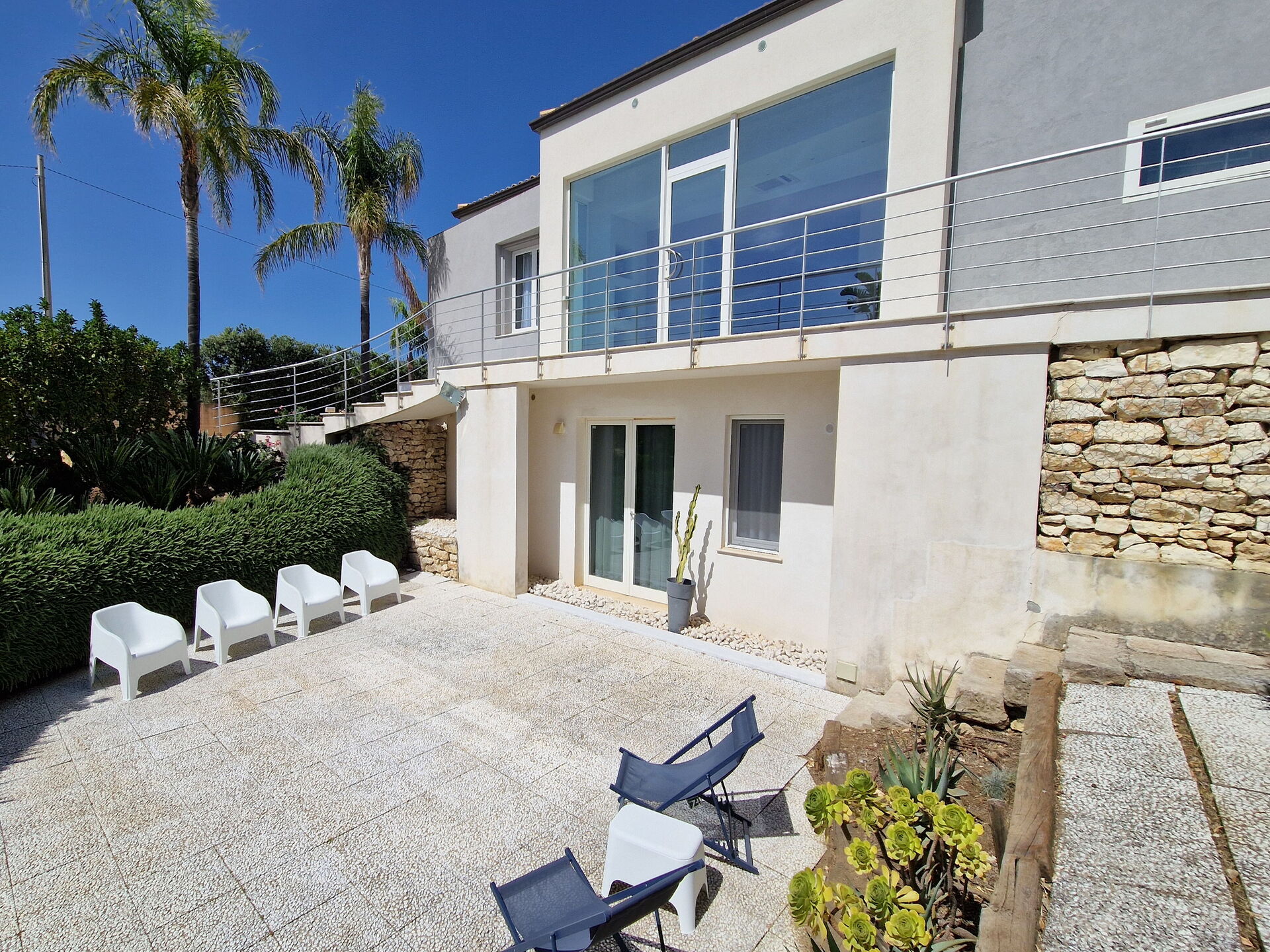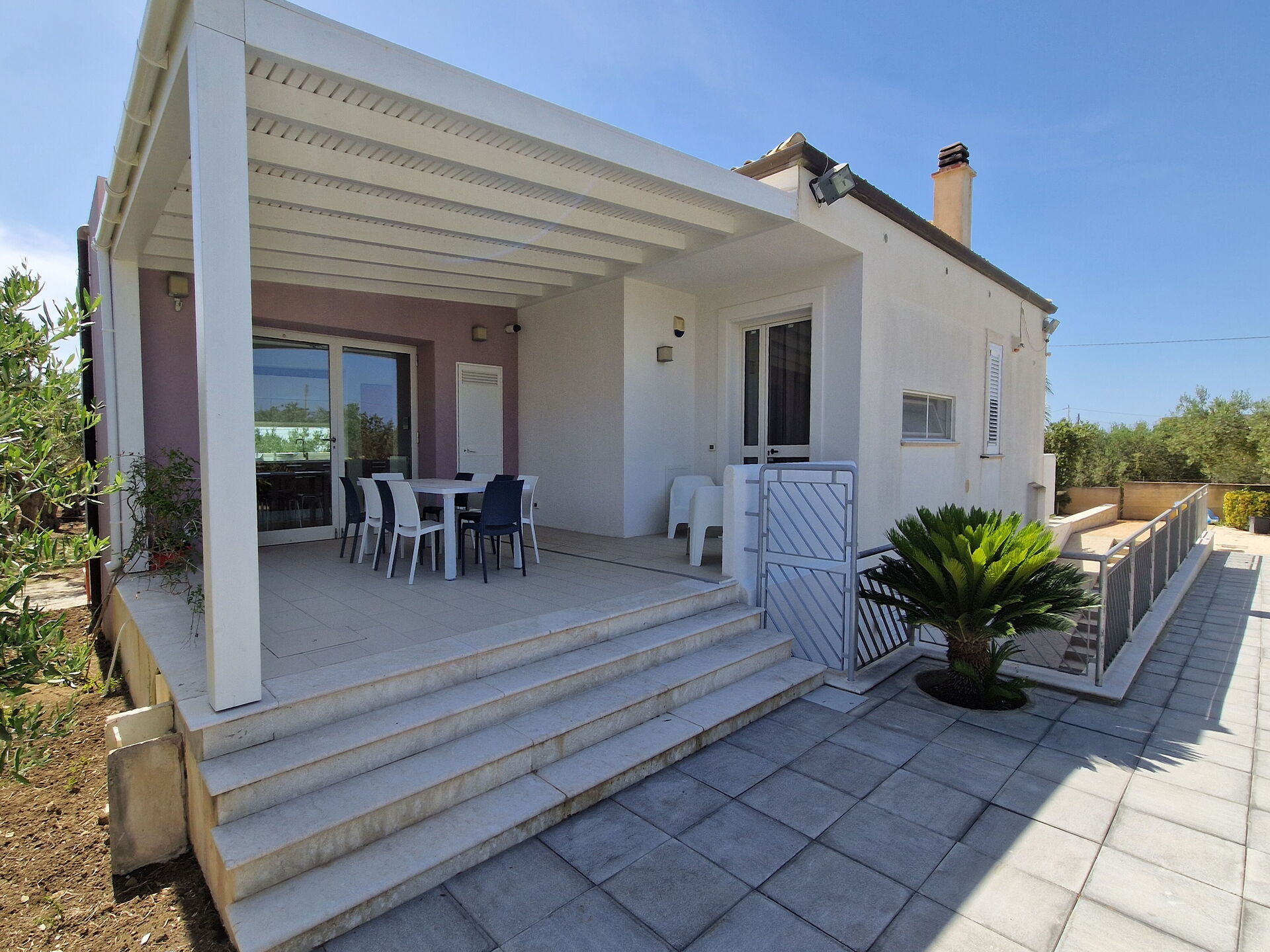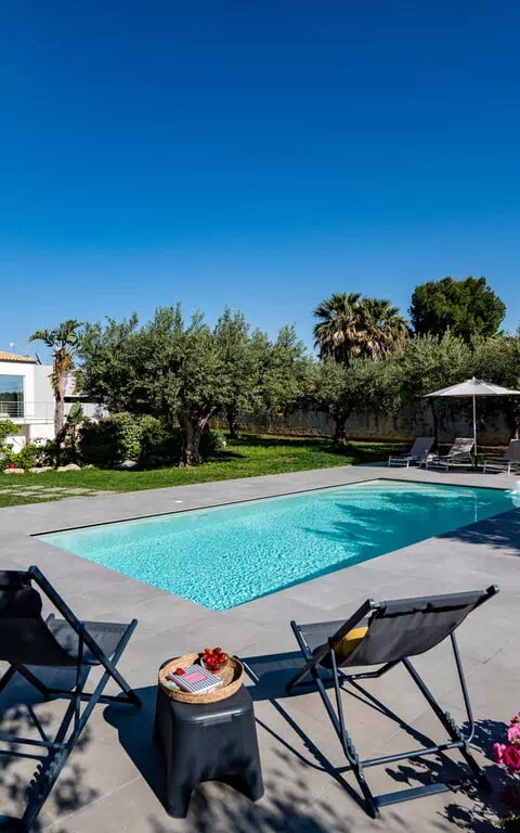 All’esterno questa moderna dimora offre numerose aree comuni che permettono agli ospiti di trascorrere un piacevole soggiorno in famiglia o tra amici rilassandosi nella veranda attrezzata per mangiare all’aperto o nell’ ampia zona piscina, ideale per trascorrere indimenticabili momenti sotto il sole della Sicilia.