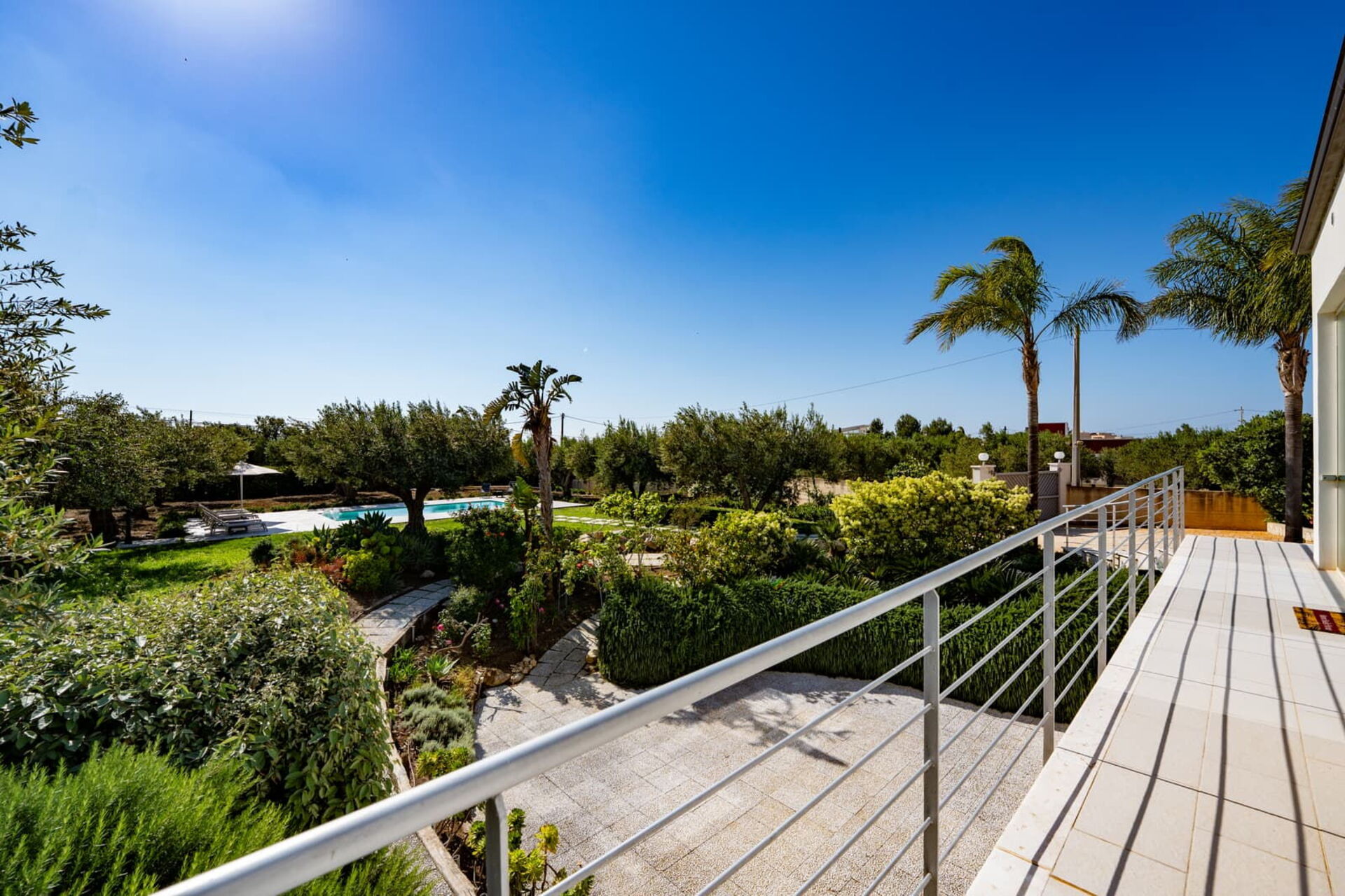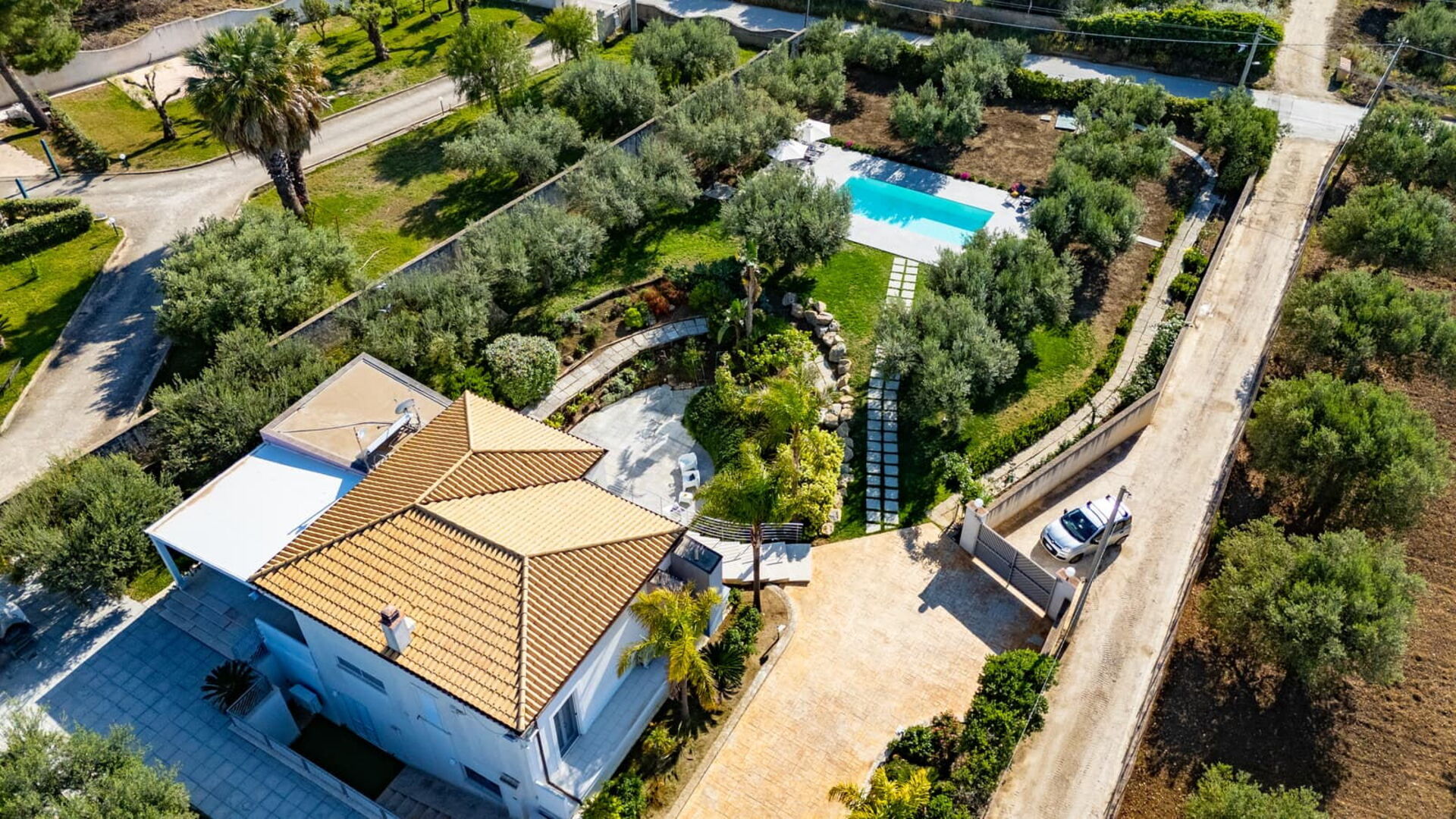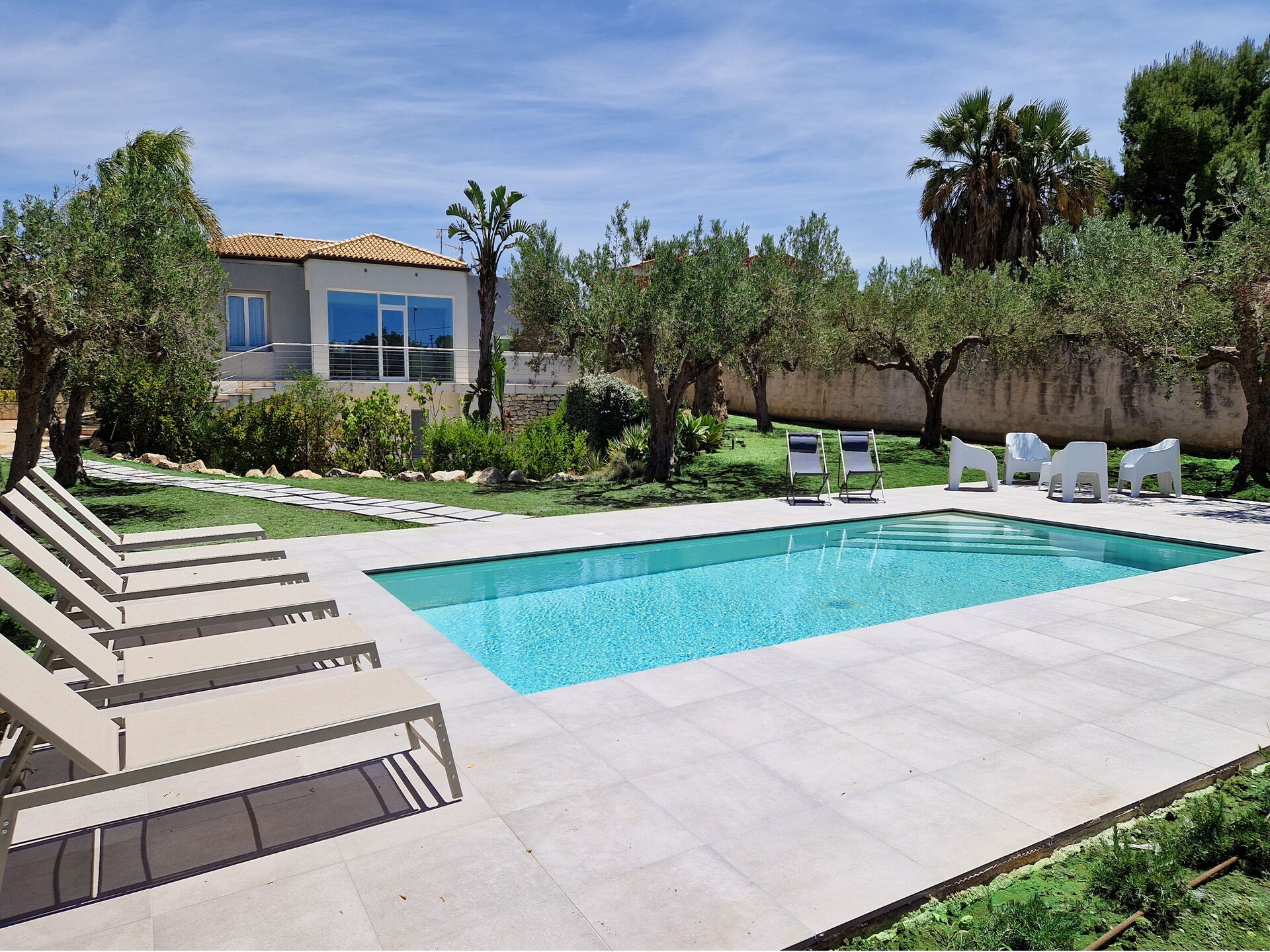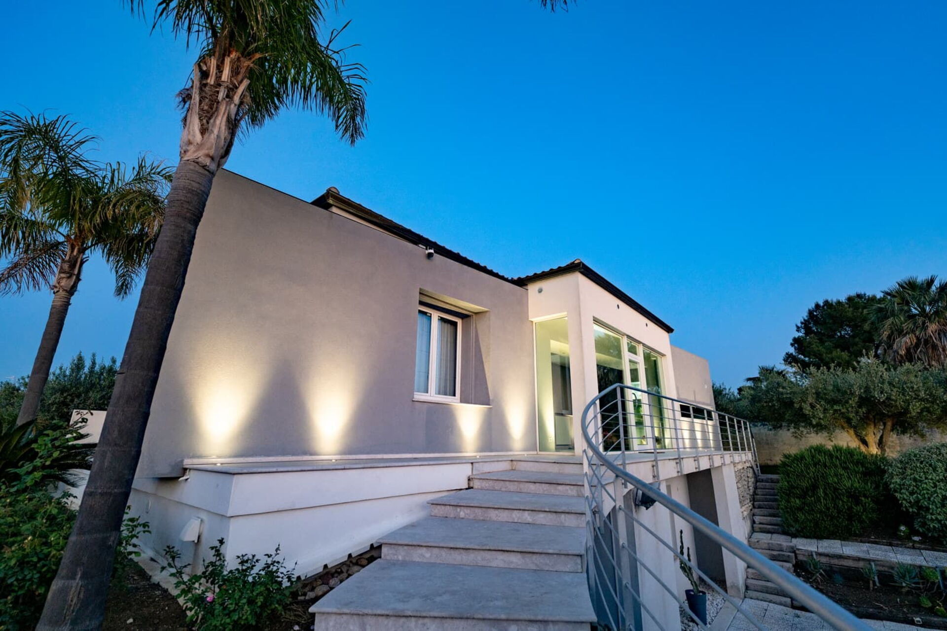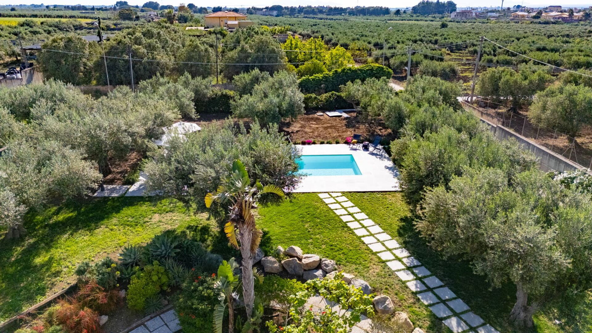 All’esterno questa moderna dimora offre numerose aree comuni che permettono agli ospiti di trascorrere un piacevole soggiorno in famiglia o tra amici rilassandosi nella veranda attrezzata per mangiare all’aperto o nell’ ampia zona piscina, ideale per trascorrere indimenticabili momenti sotto il sole della Sicilia.