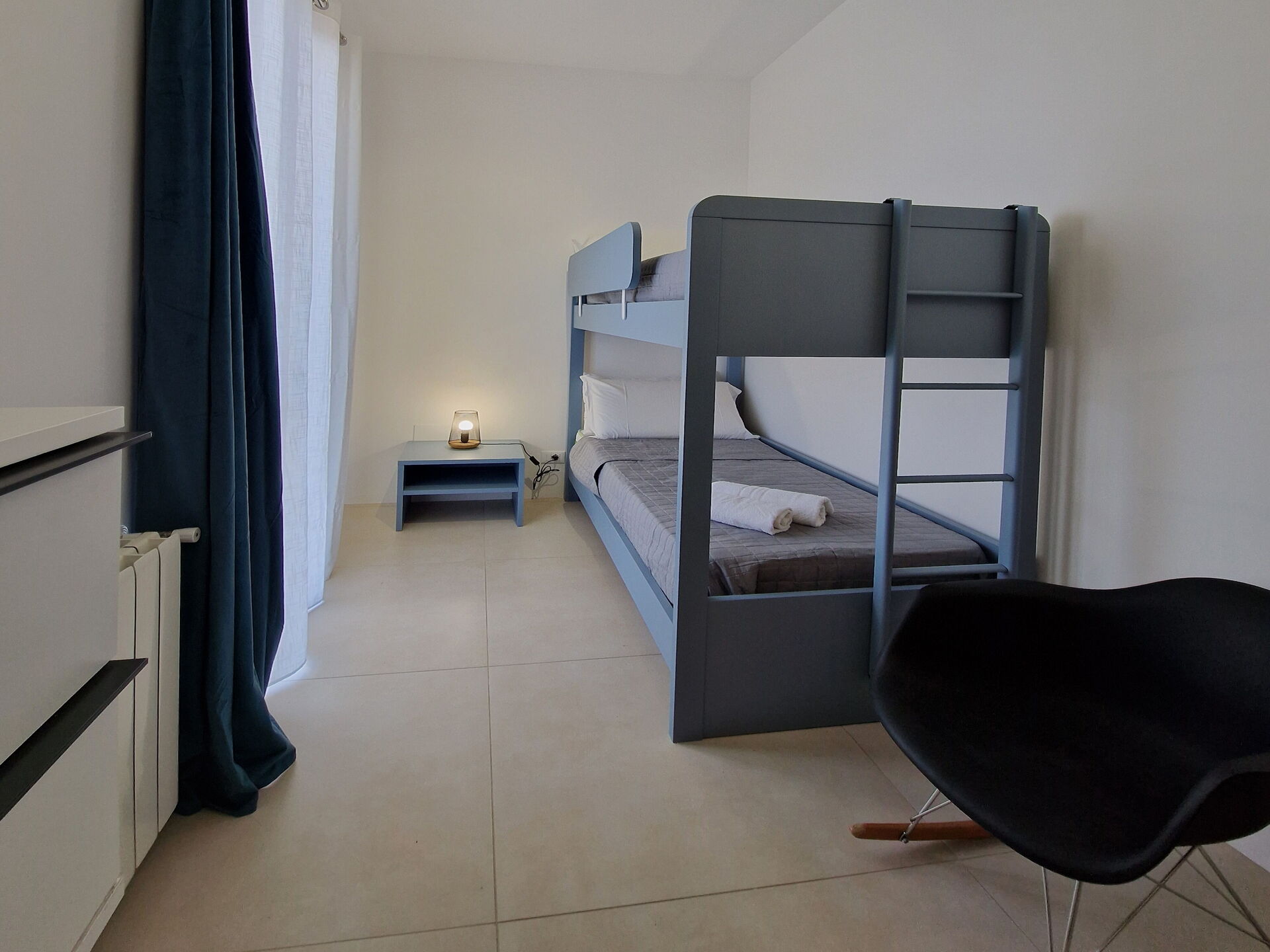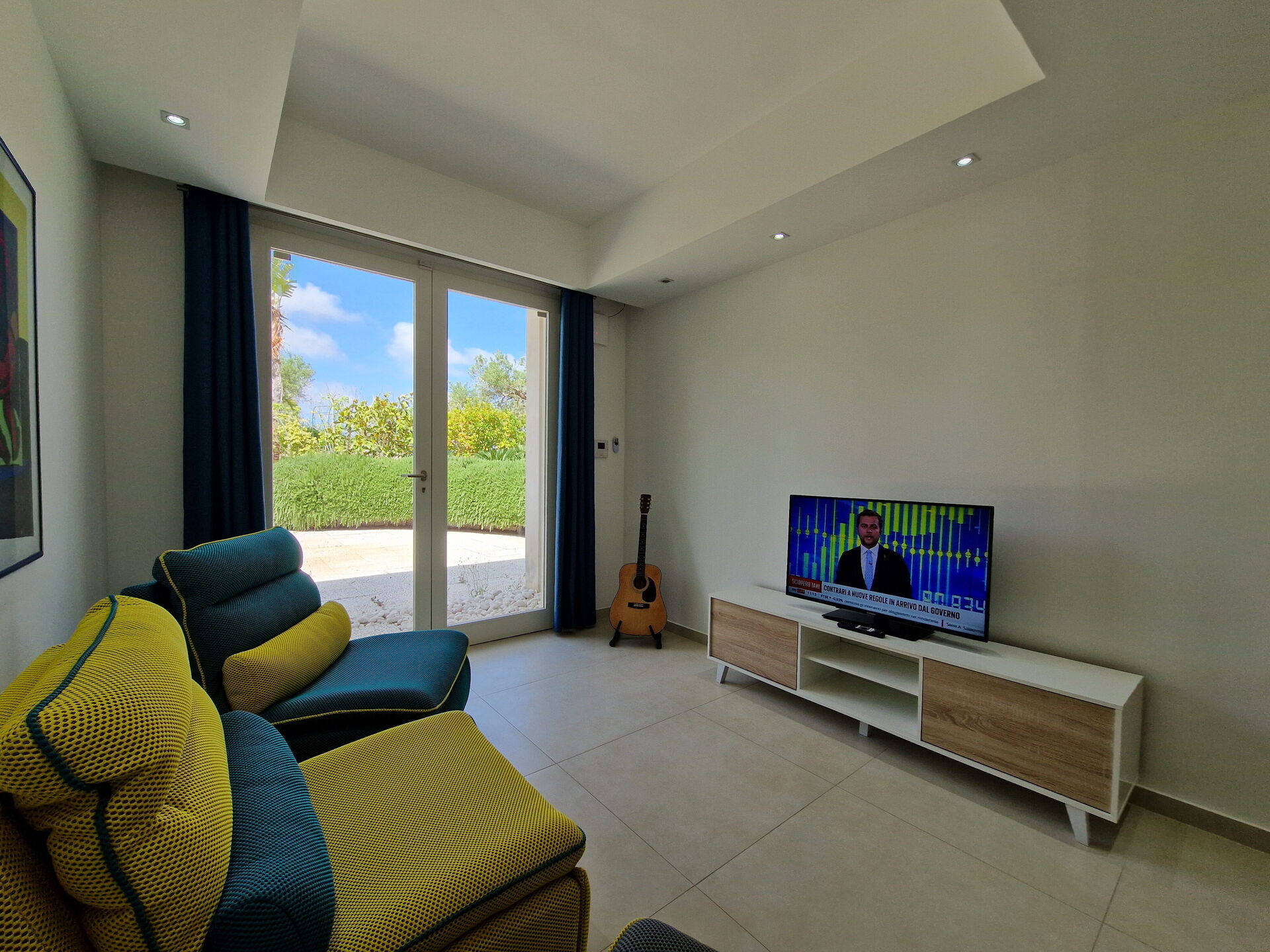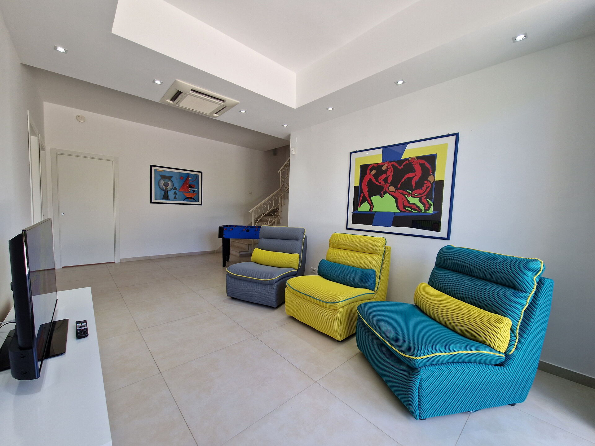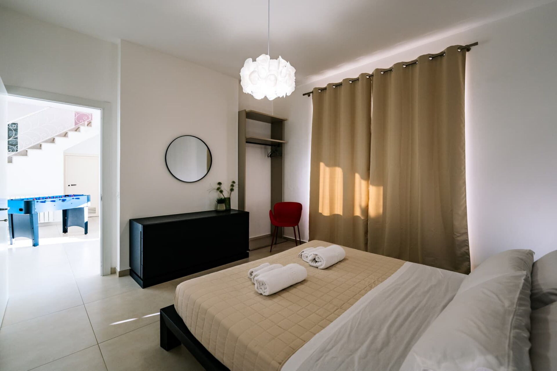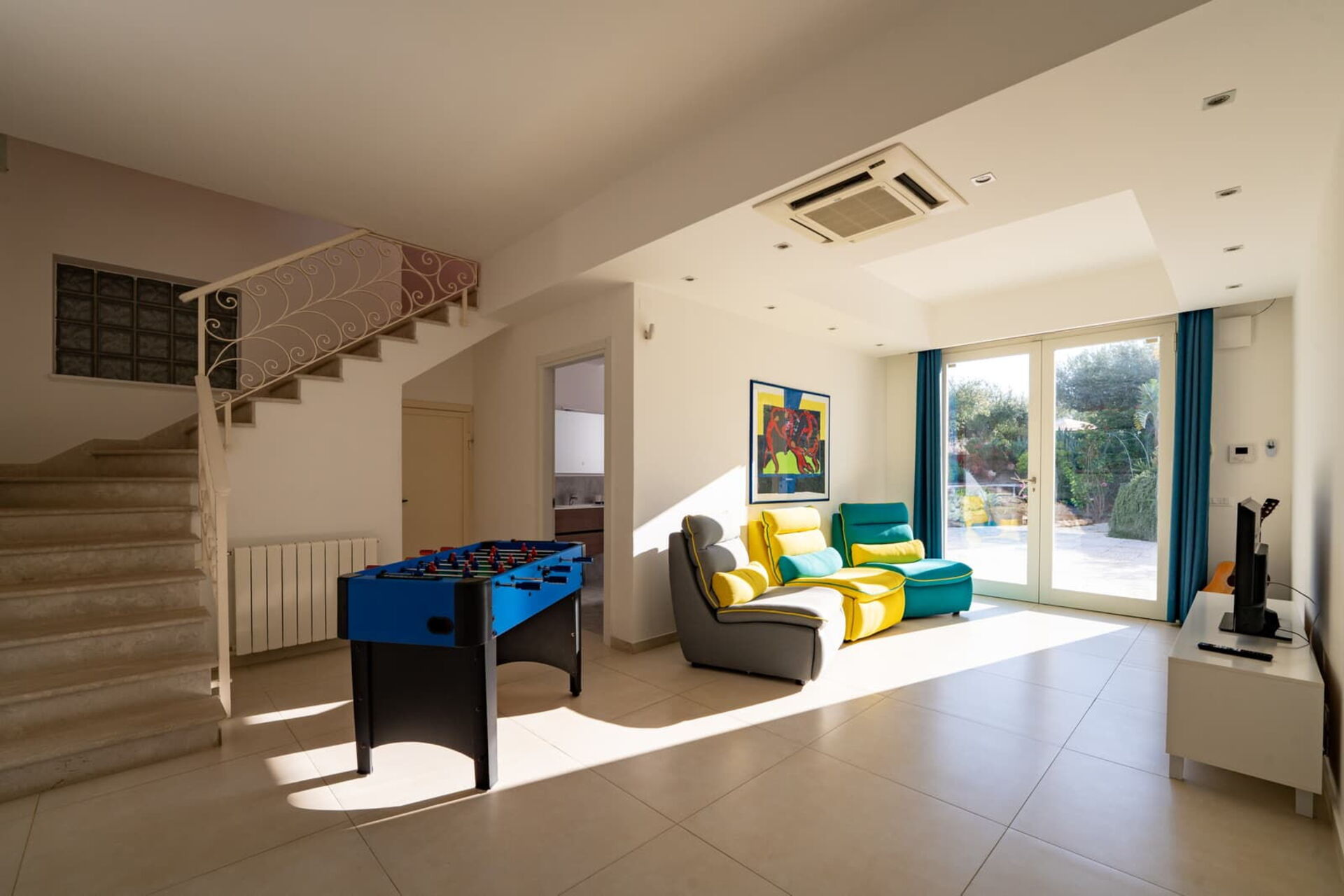 Piano inferiore: soggiorno con area relax (aria condizionata, tv, calcio balilla) con uscita su patio, 2 camere matrimoniali (aria condizionata), camera con 2 letti singoli, bagno con doccia.