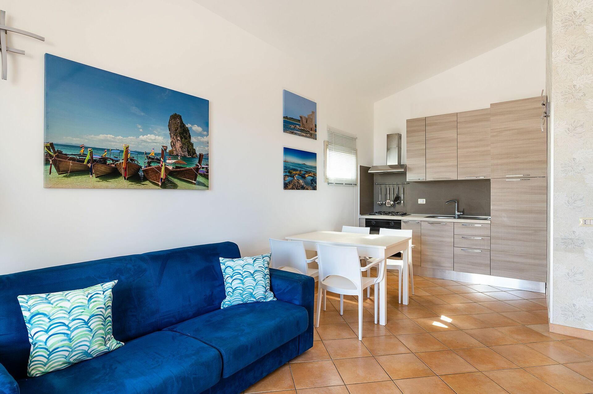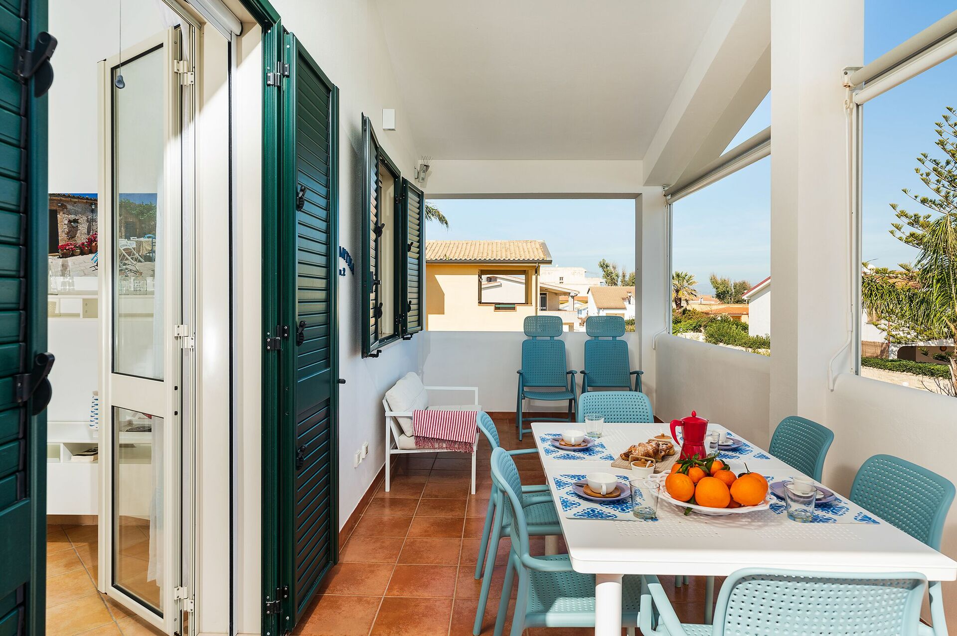 Primo piano: soggiorno con cucina con divano letto singolo, 2 camere matrimoniali, 1 bagno con doccia, veranda.