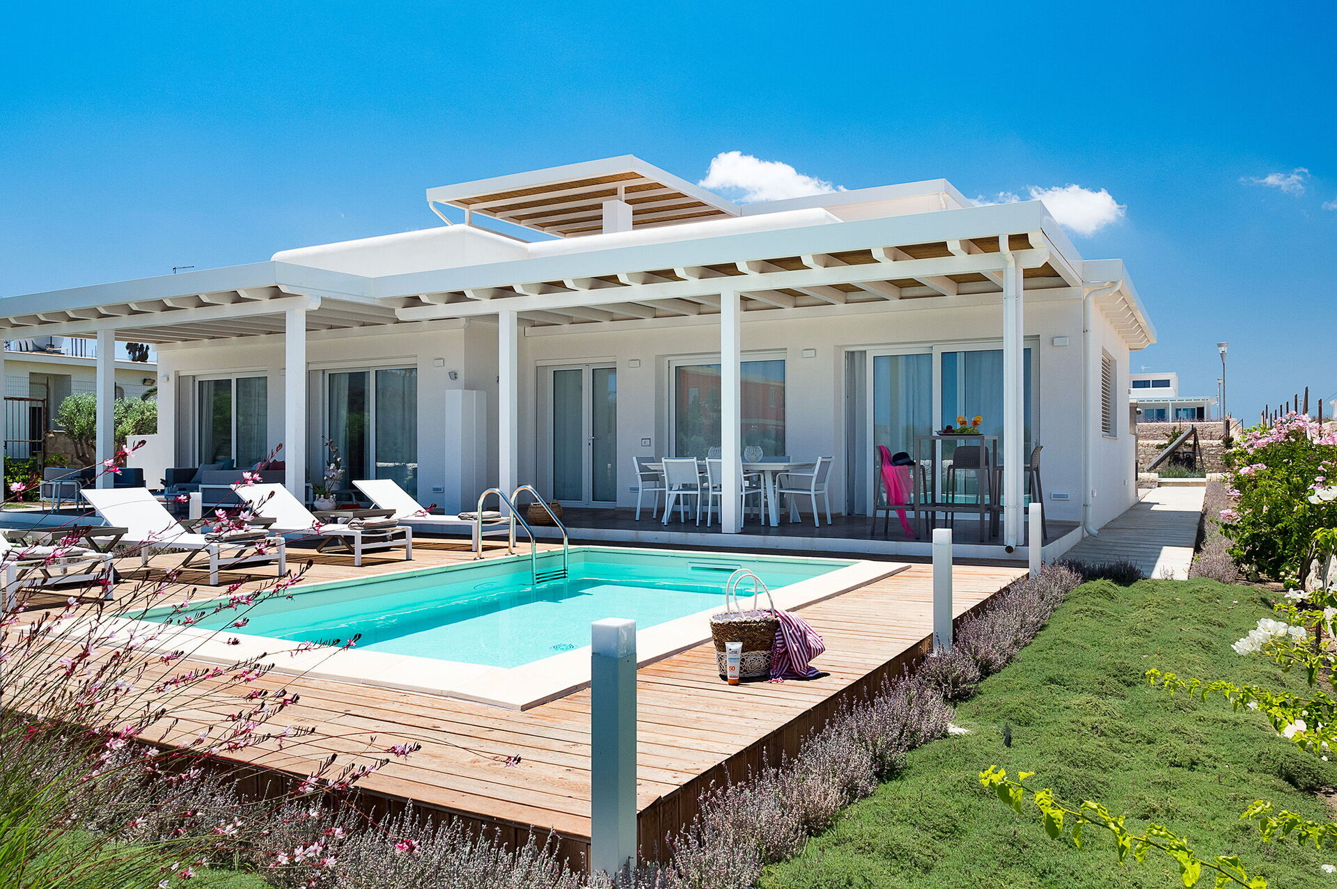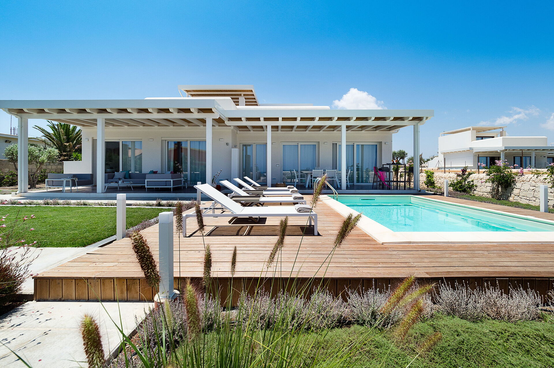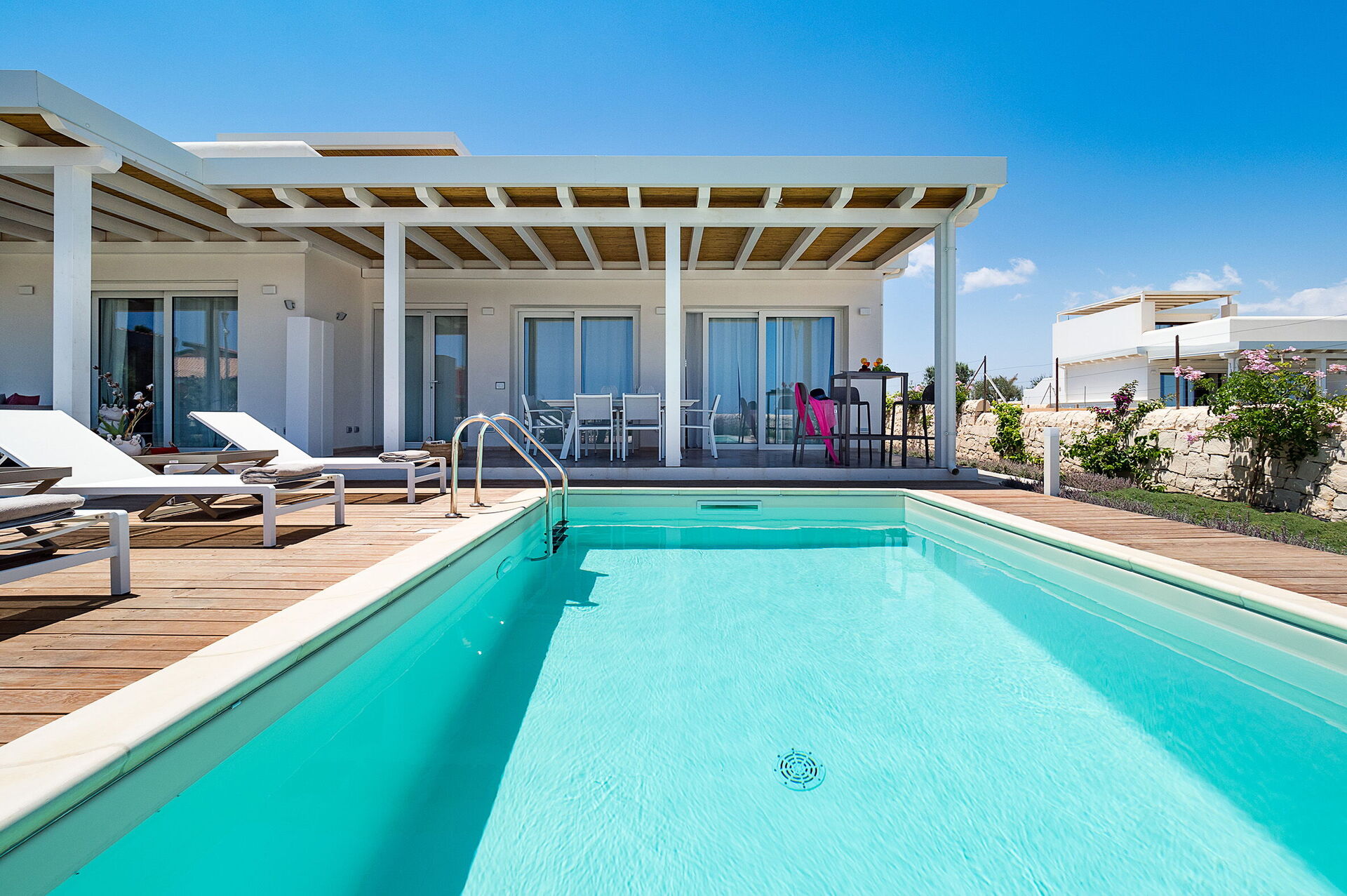 Di recente costruzione, la villa offre luminosi ed accoglienti ambienti interni arredati con gusto e funzionalità. La villa in affitto può ospitare fino a 8 persone in 4 camere da letto e interni dotati di ogni comfort.