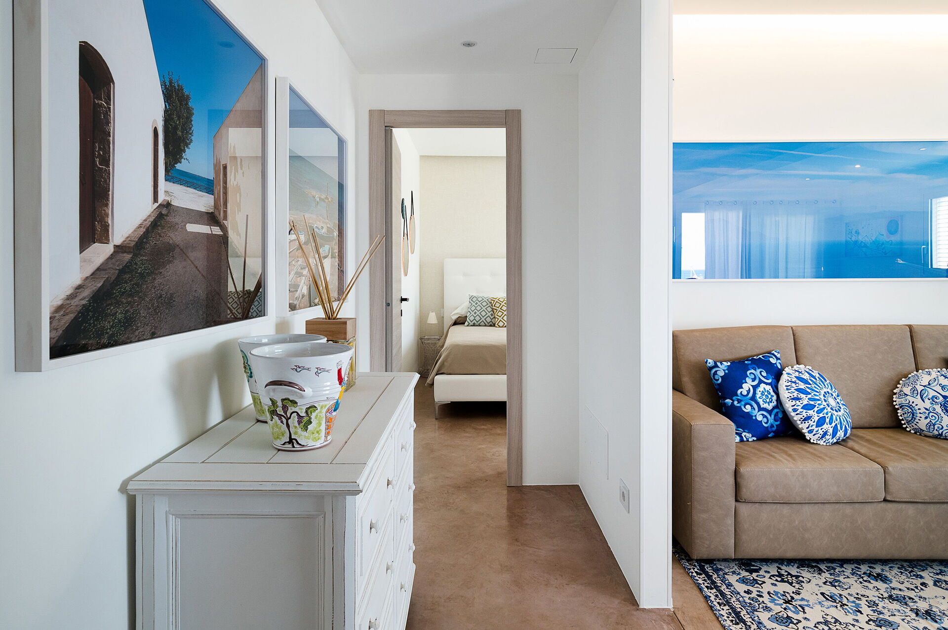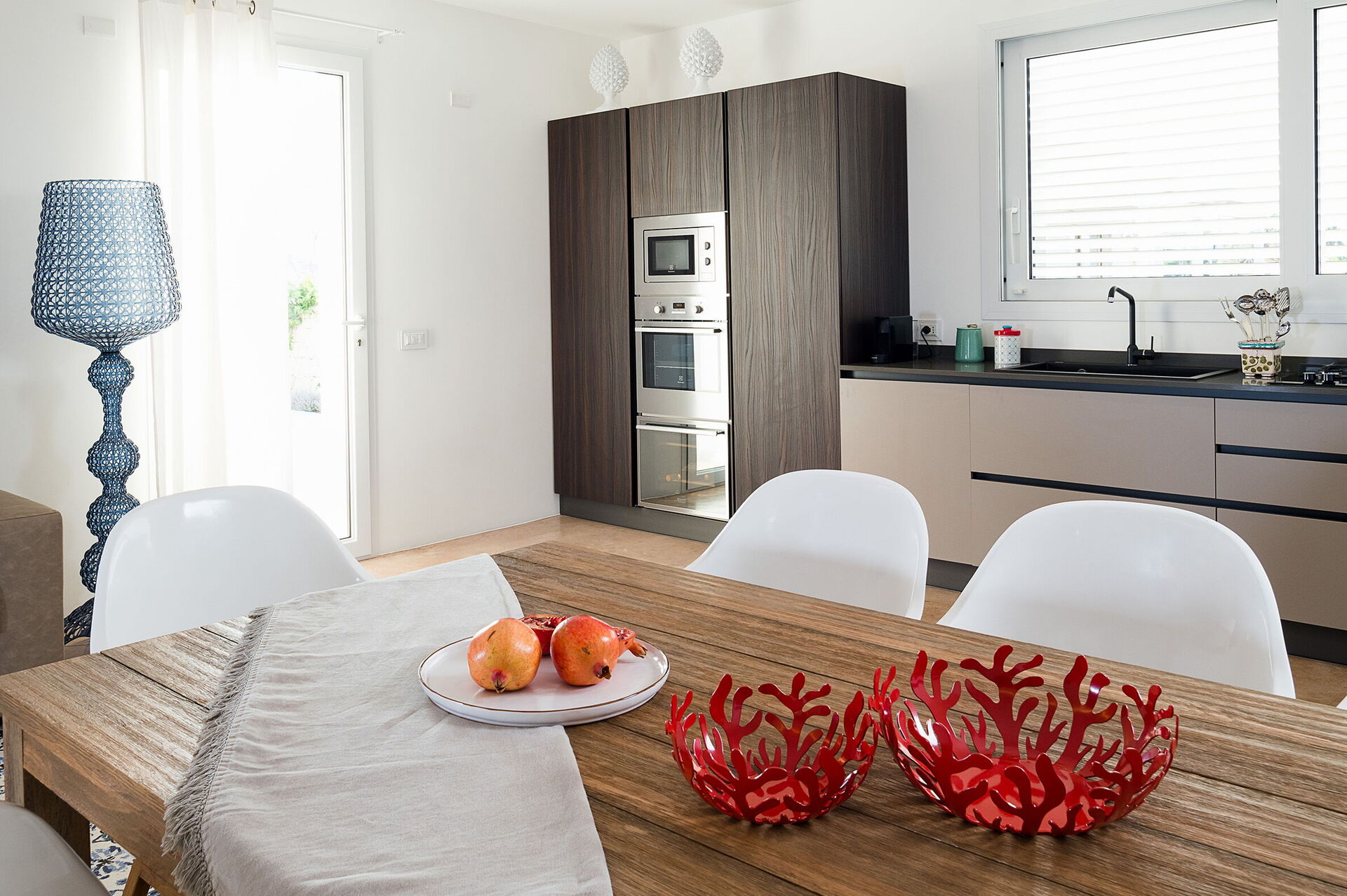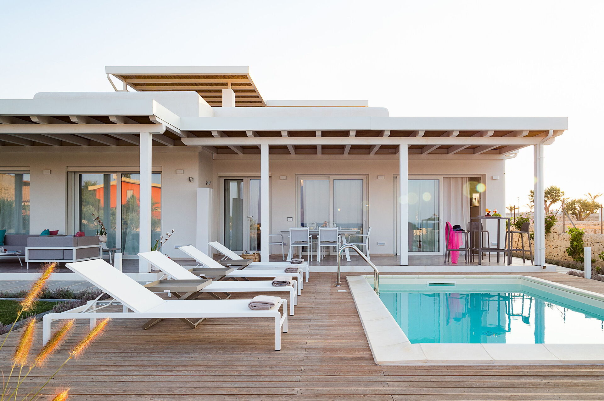Di recente costruzione, la villa offre luminosi ed accoglienti ambienti interni arredati con gusto e funzionalità. La villa in affitto può ospitare fino a 8 persone in 4 camere da letto e interni dotati di ogni comfort.