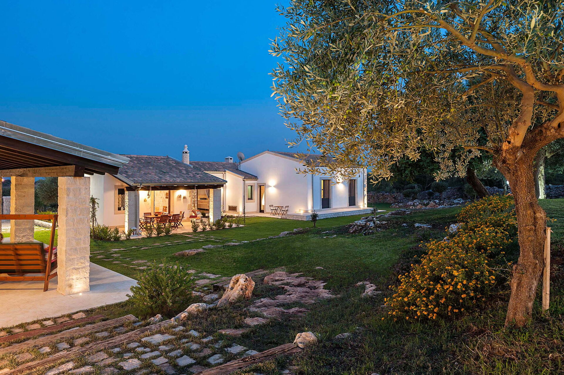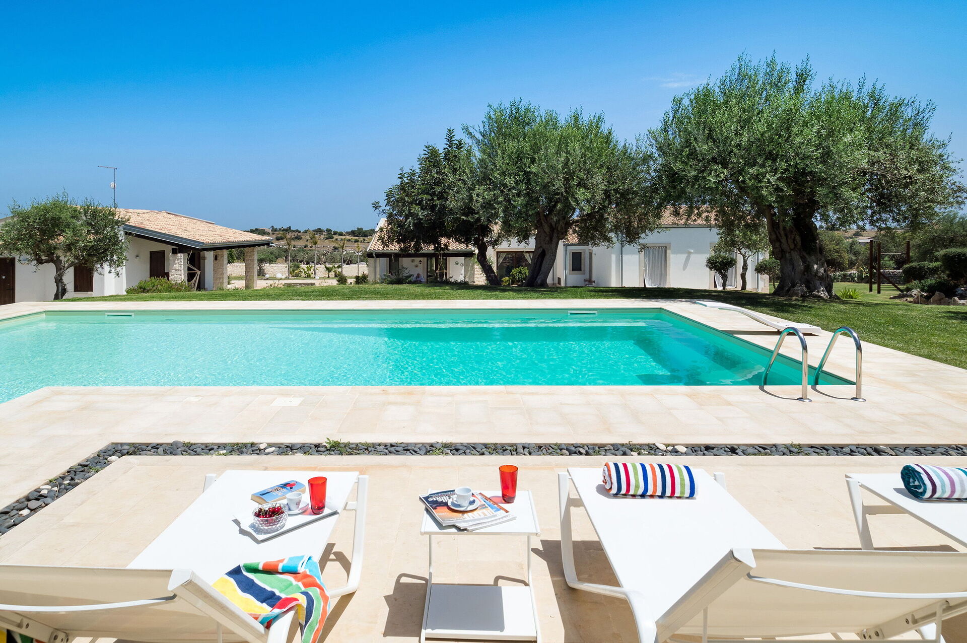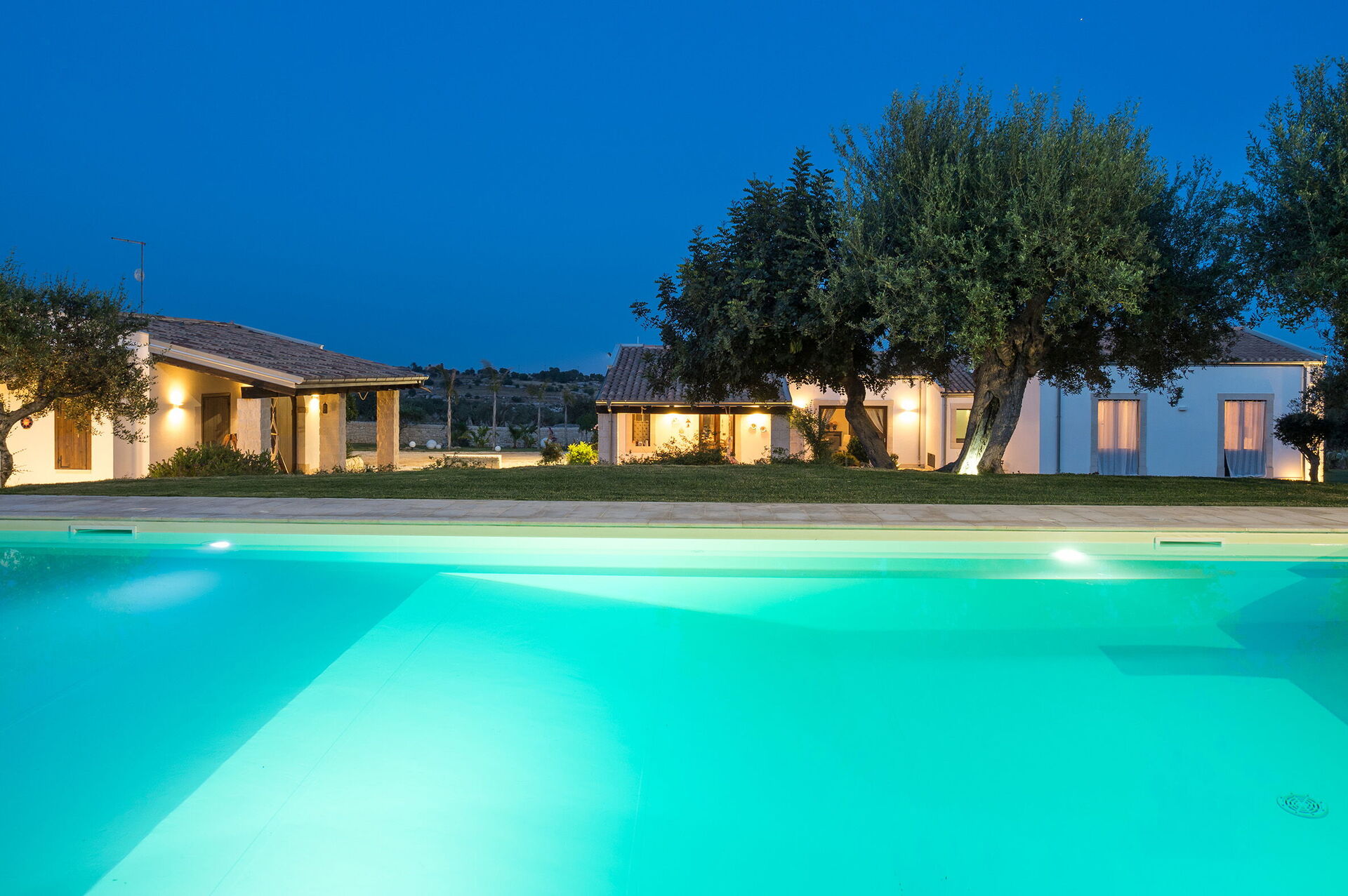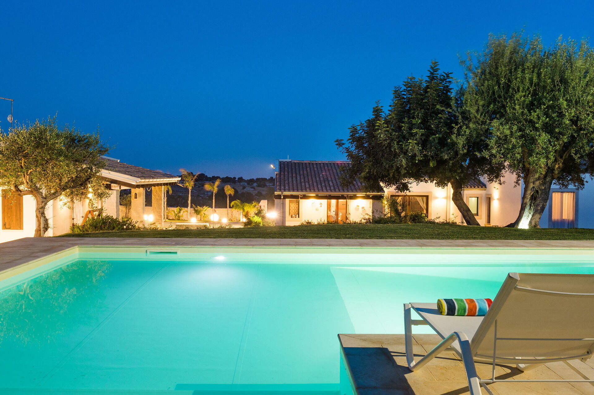 Armoniosamente inserita nel caratteristico paesaggio agreste della campagna siciliana che la ospita, Corte Moscata è circondata da un curato giardino e dispone di una bella piscina esclusiva, di ampie zone attrezzate come un portico e una loggia con angolo bar, perfette per vivere all’aperto momenti in pieno relax.