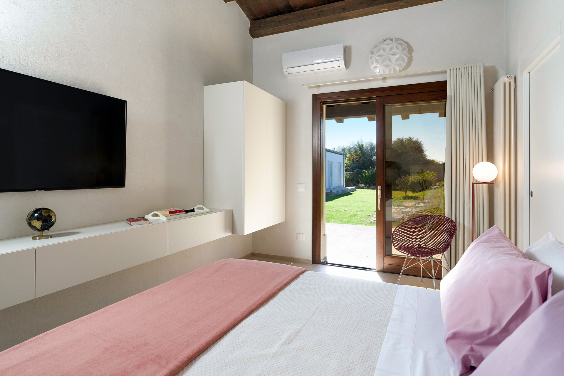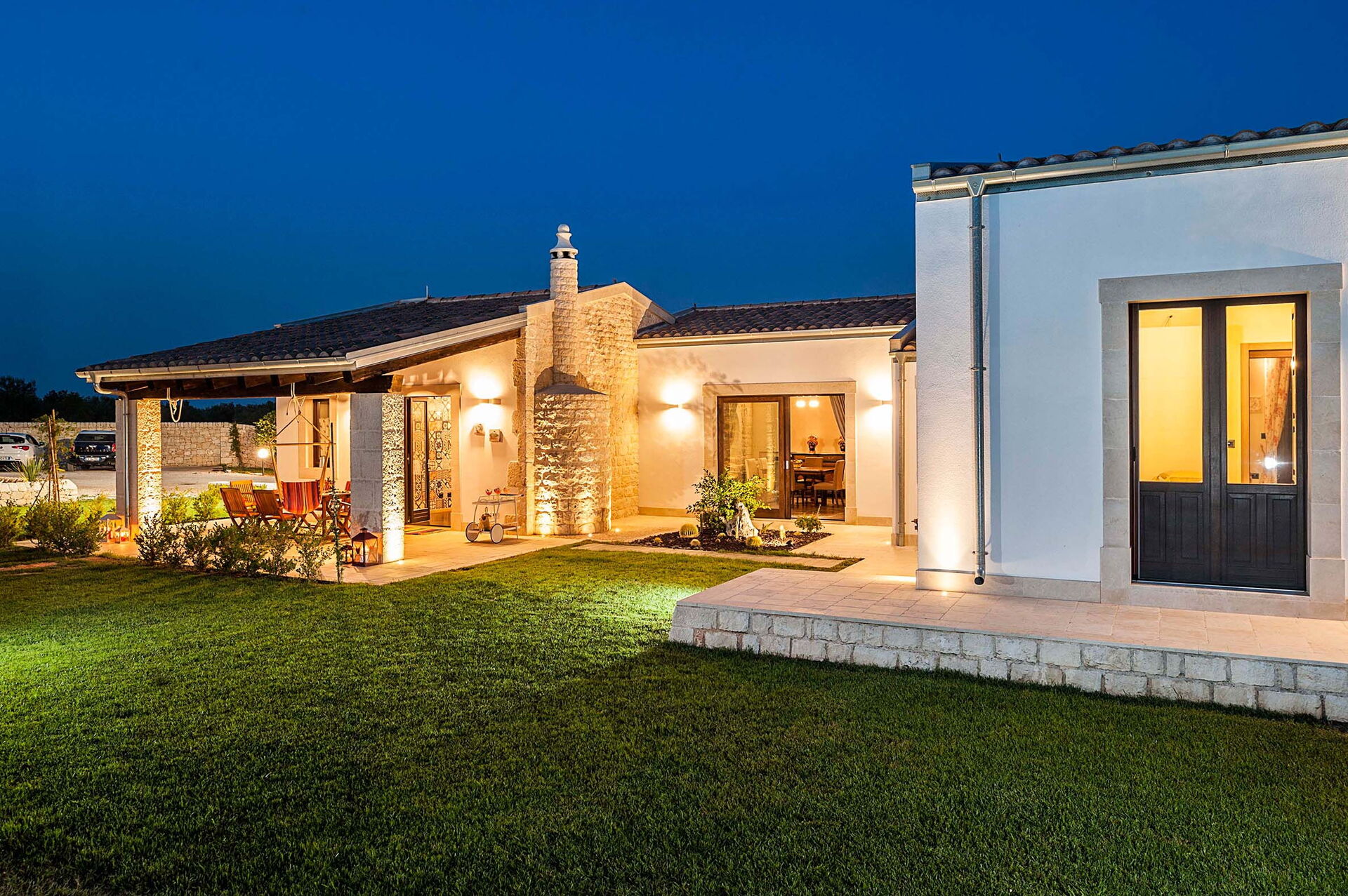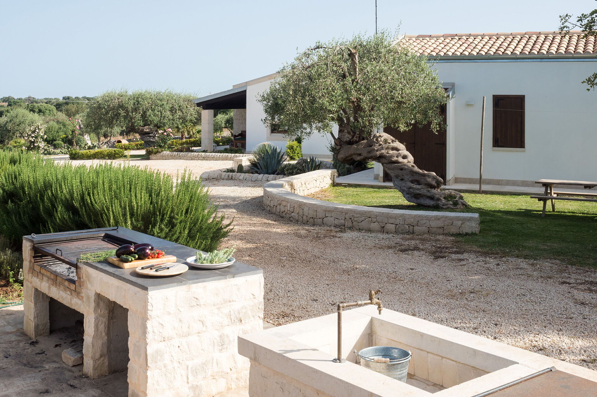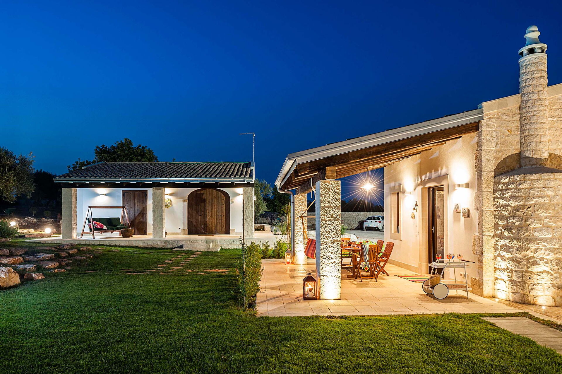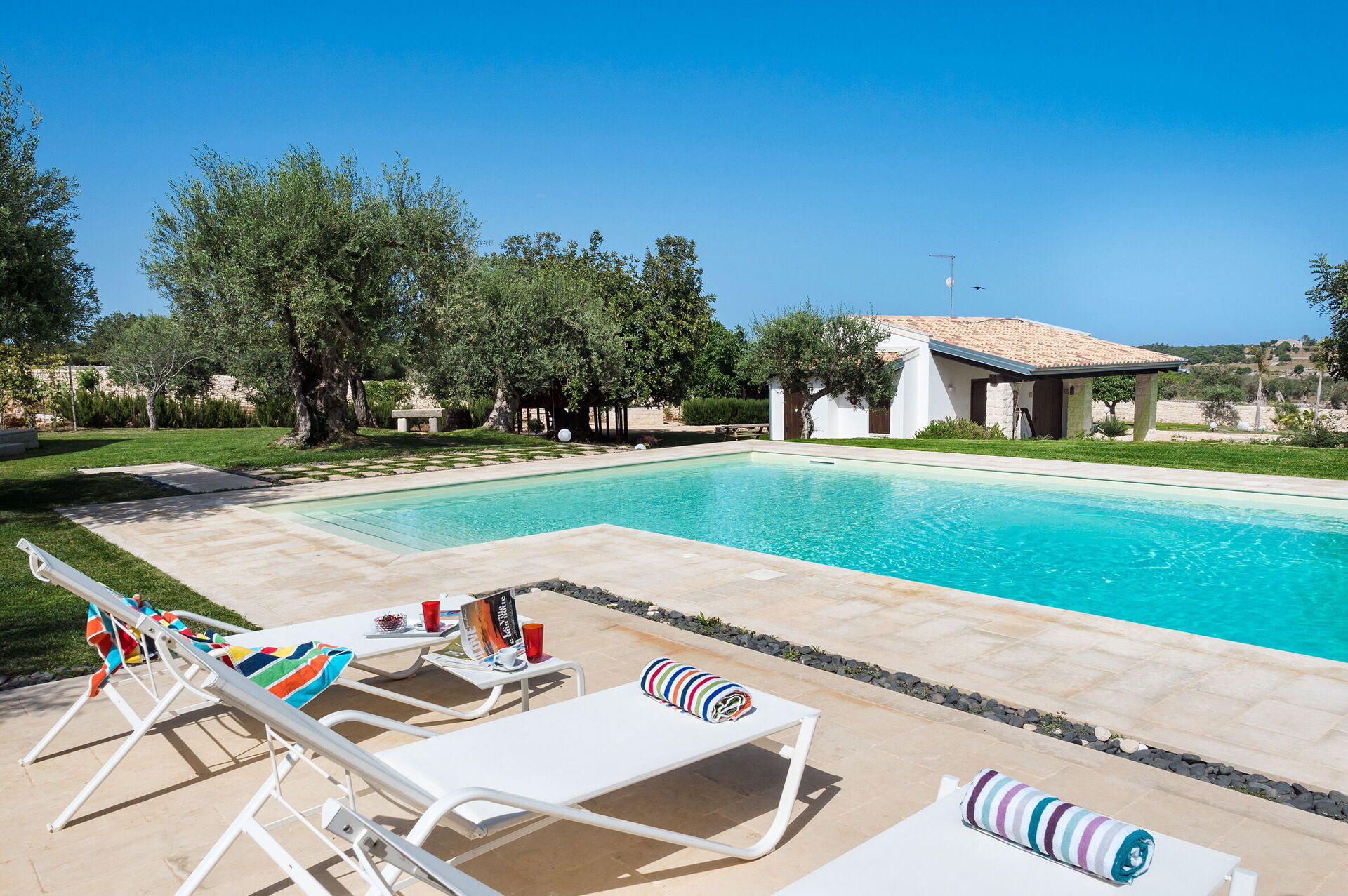 Armoniosamente inserita nel caratteristico paesaggio agreste della campagna siciliana che la ospita, Corte Moscata è circondata da un curato giardino e dispone di una bella piscina esclusiva, di ampie zone attrezzate come un portico e una loggia con angolo bar, perfette per vivere all’aperto momenti in pieno relax.