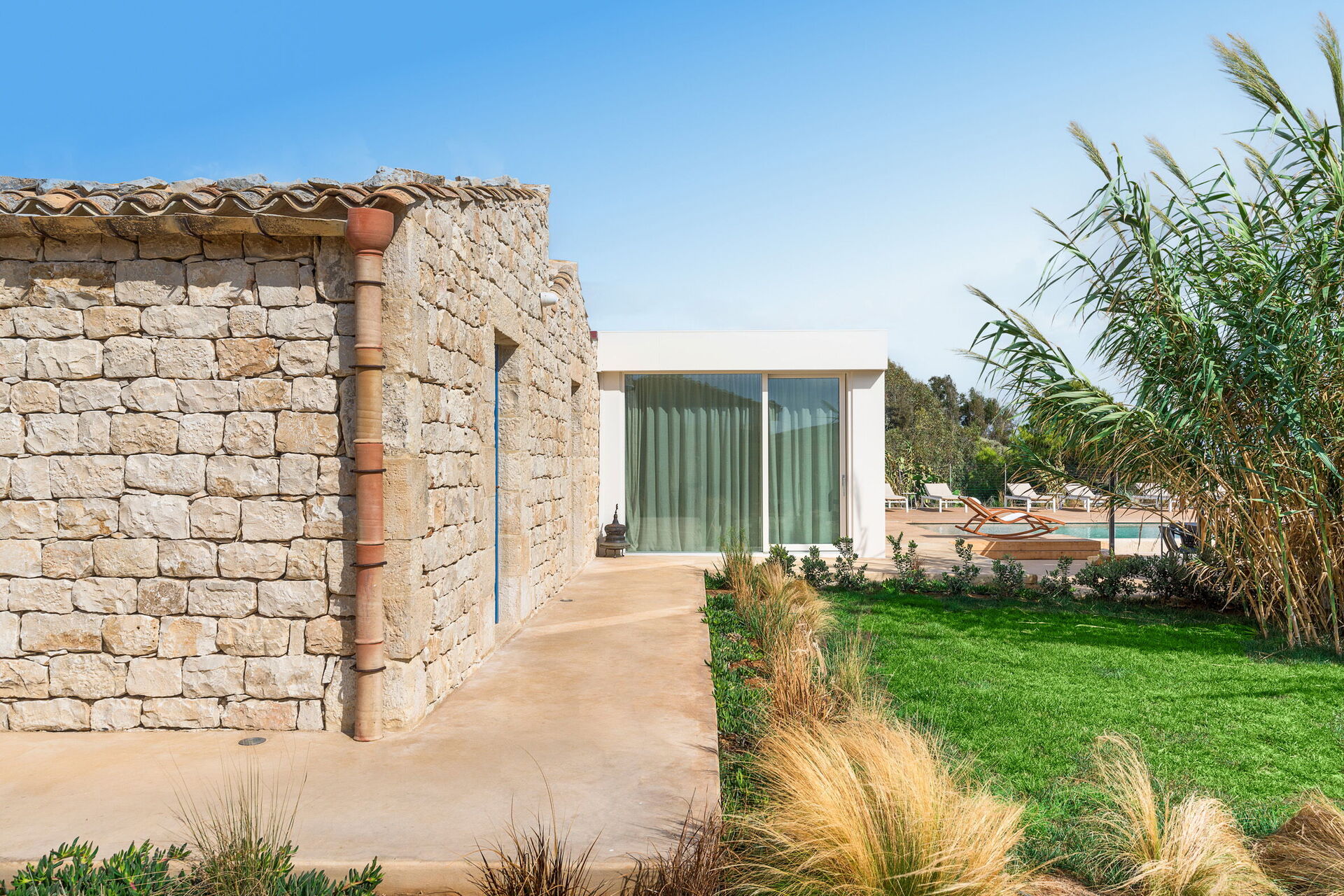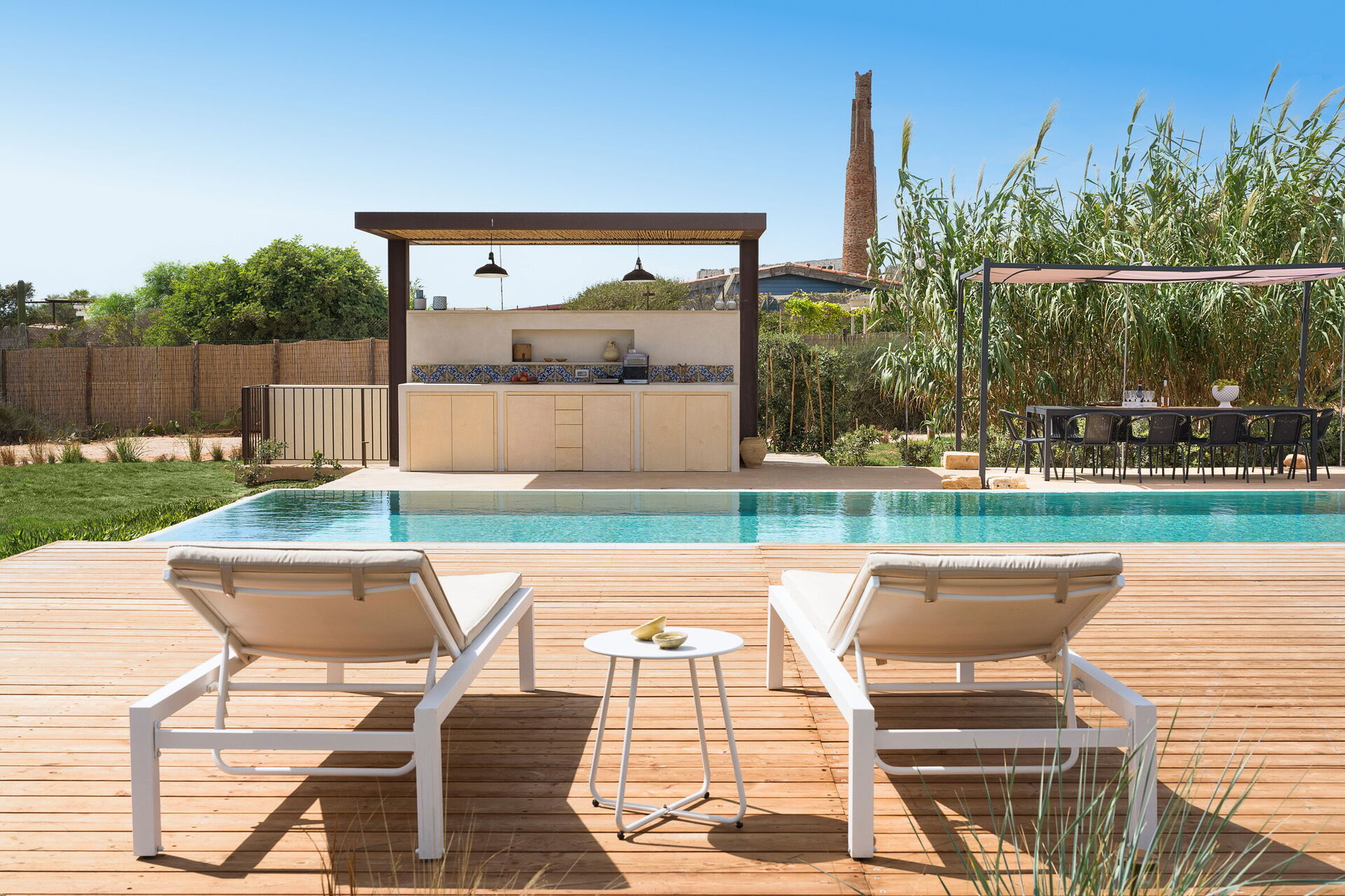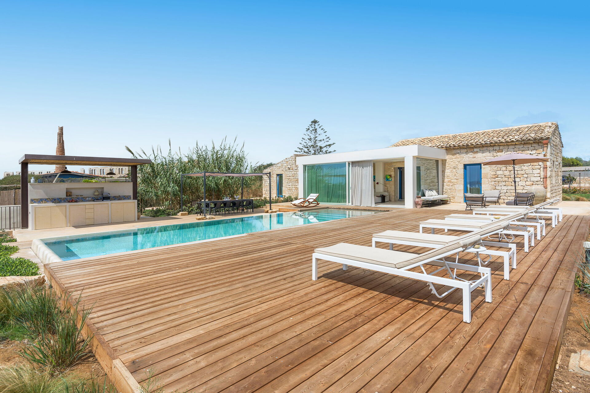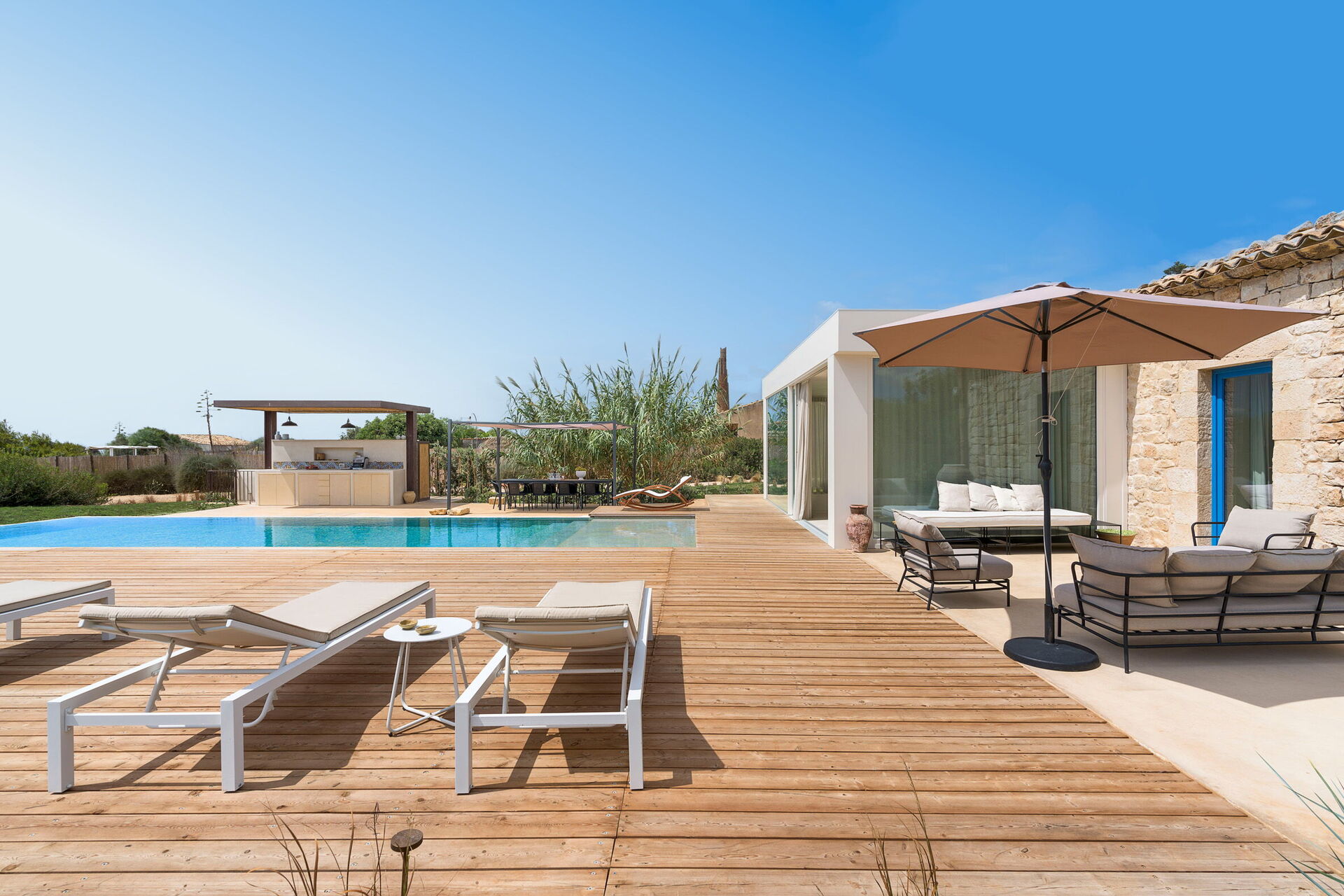 La residenza è circondata da una grande giardino e dispone di una grande zona solarium e di una piscina privata ad uso esclusivo degli ospiti; sempre all'esterno un gazebo con barbecue, sedie e tavoli per mangiare all'aperto garantisce momenti di relax per rendere unica la vostra vacanza in Sicilia.