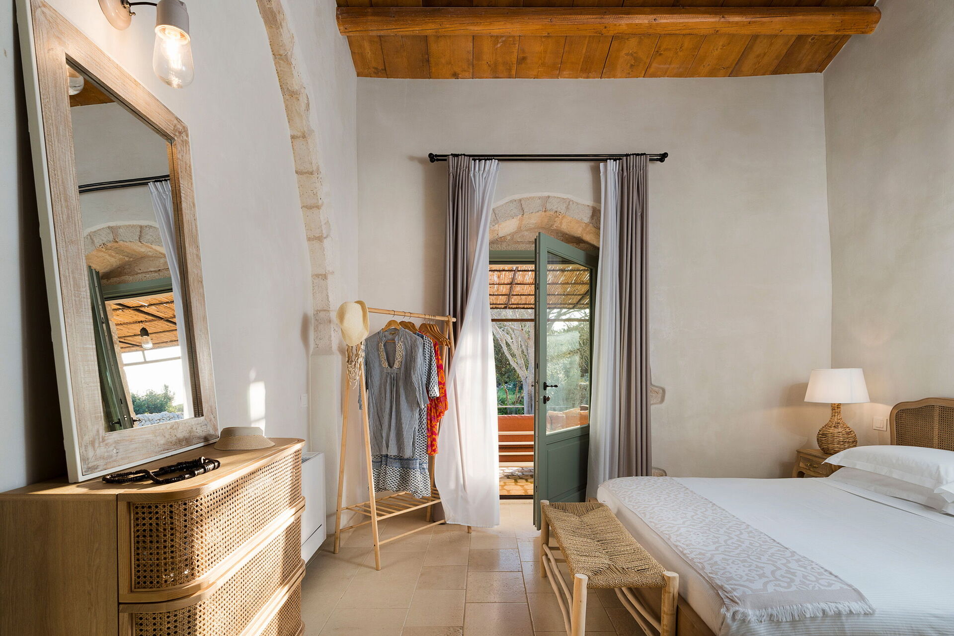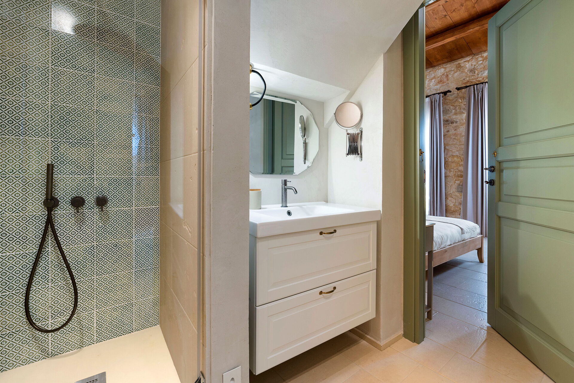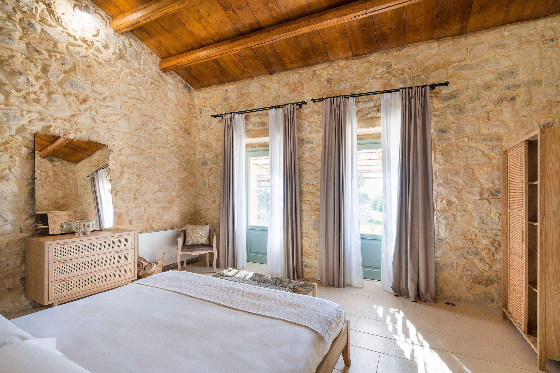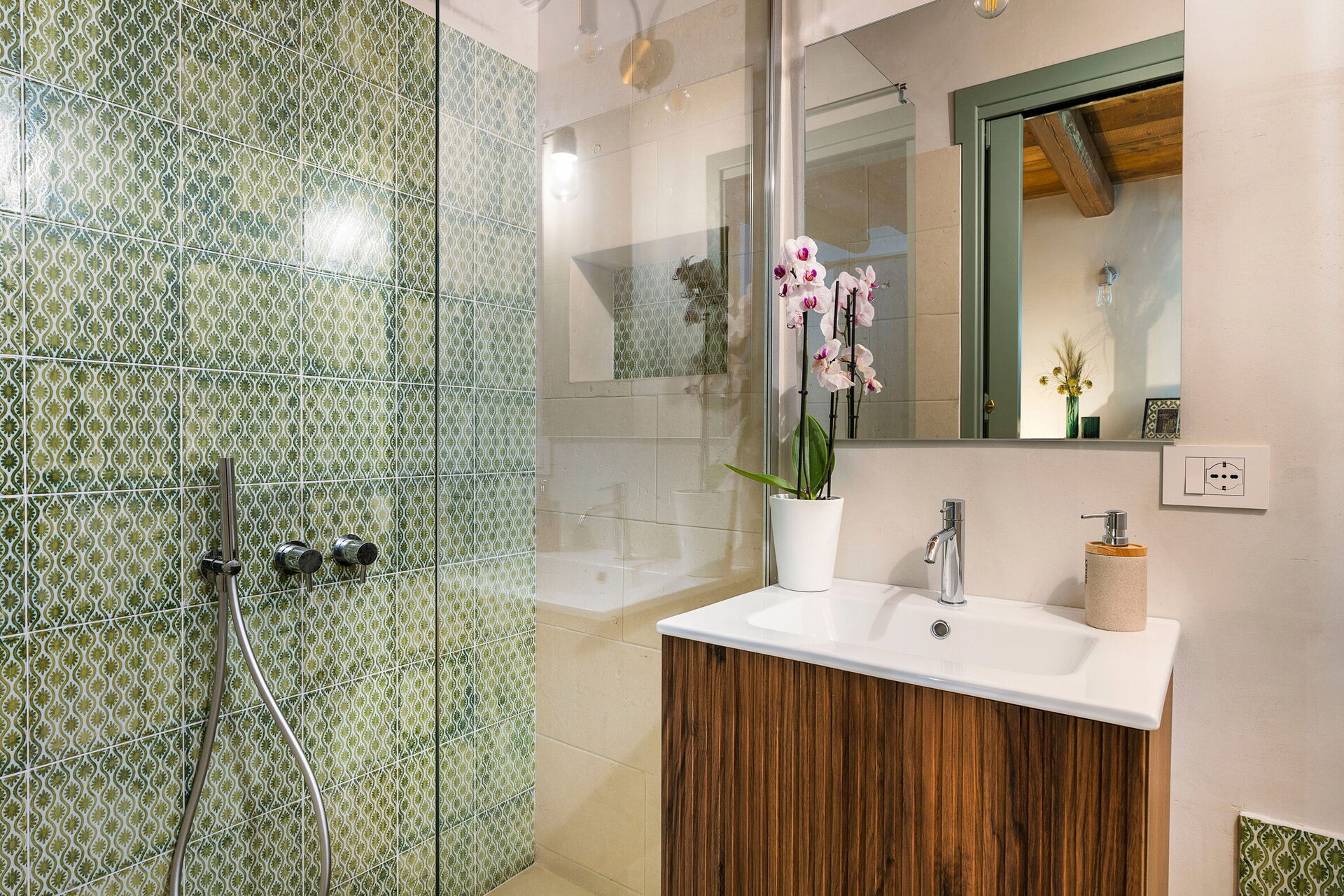 Piano terreno (accessibile solo dall’esterno e non collegata internamente al resto della villa): 2 camere matrimoniali (misure del letto: 180 x 200 cm) ognuna con bagno privato con doccia; camera con letto matrimoniale (misure del letto: 160 x 200 cm) e con letto singolo e bagno privato con doccia; lavanderia.