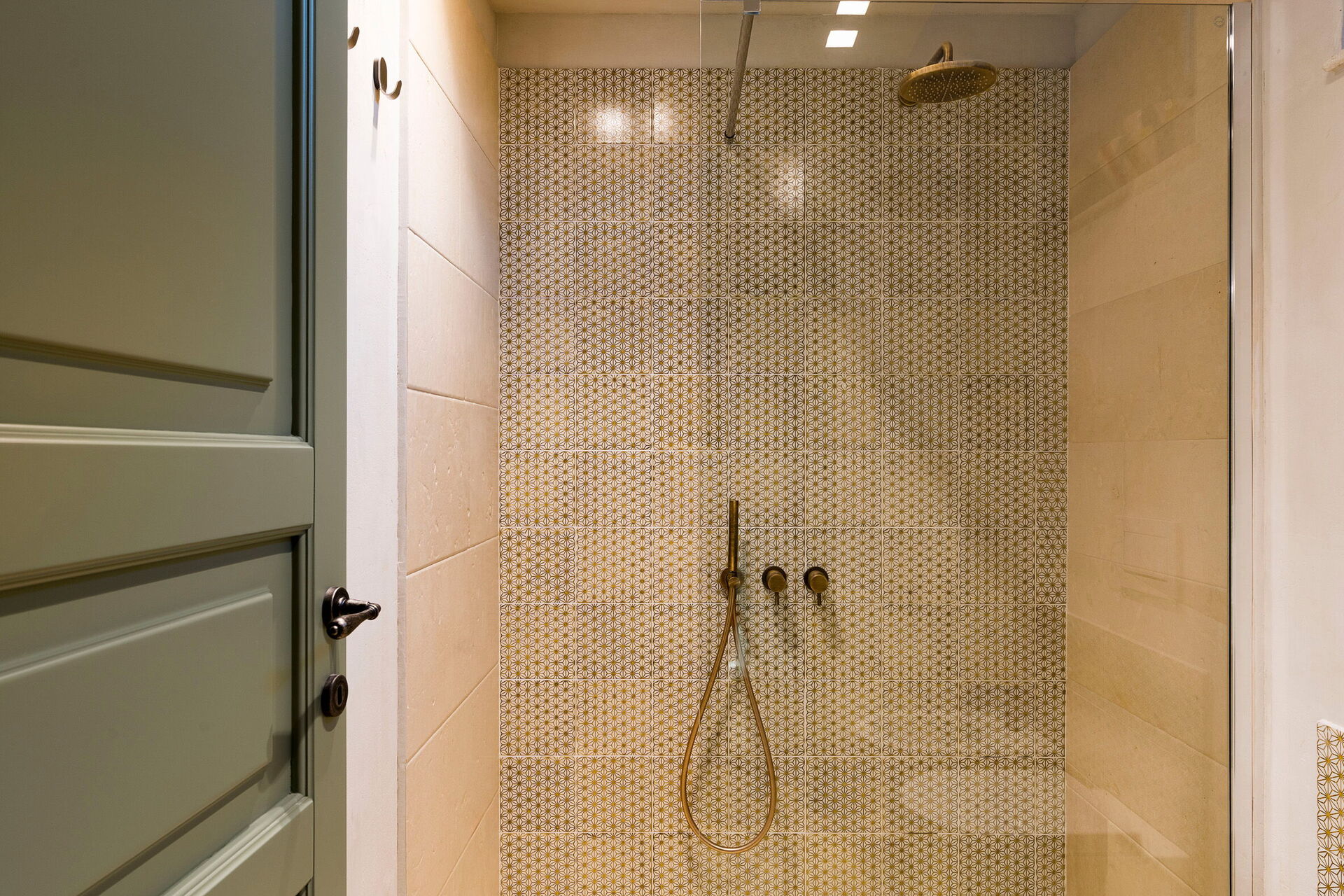 Primo piano: camera con letto matrimoniale (misure del letto: 160 x 200 cm) e con letto singolo e bagno privato con doccia.