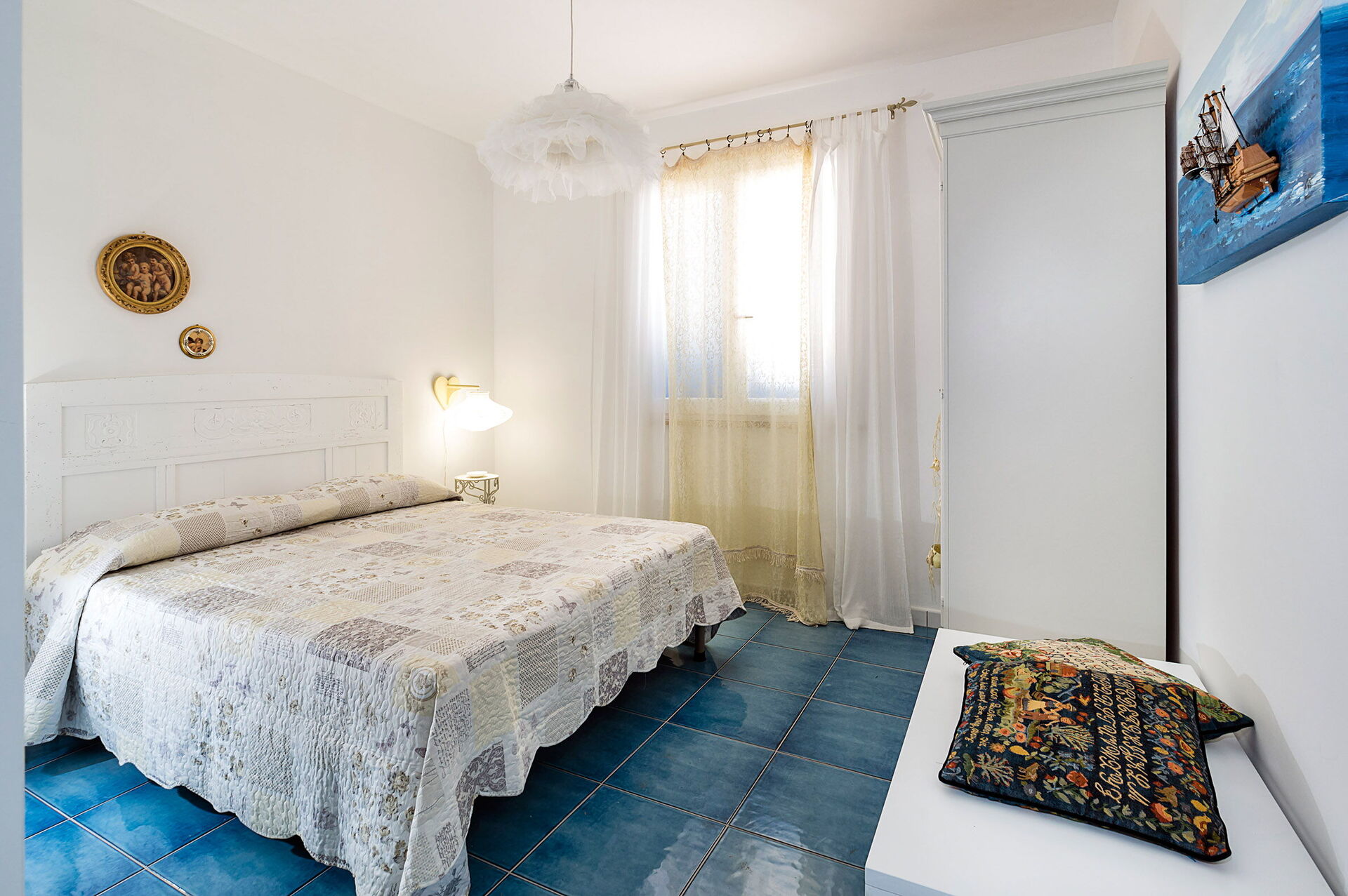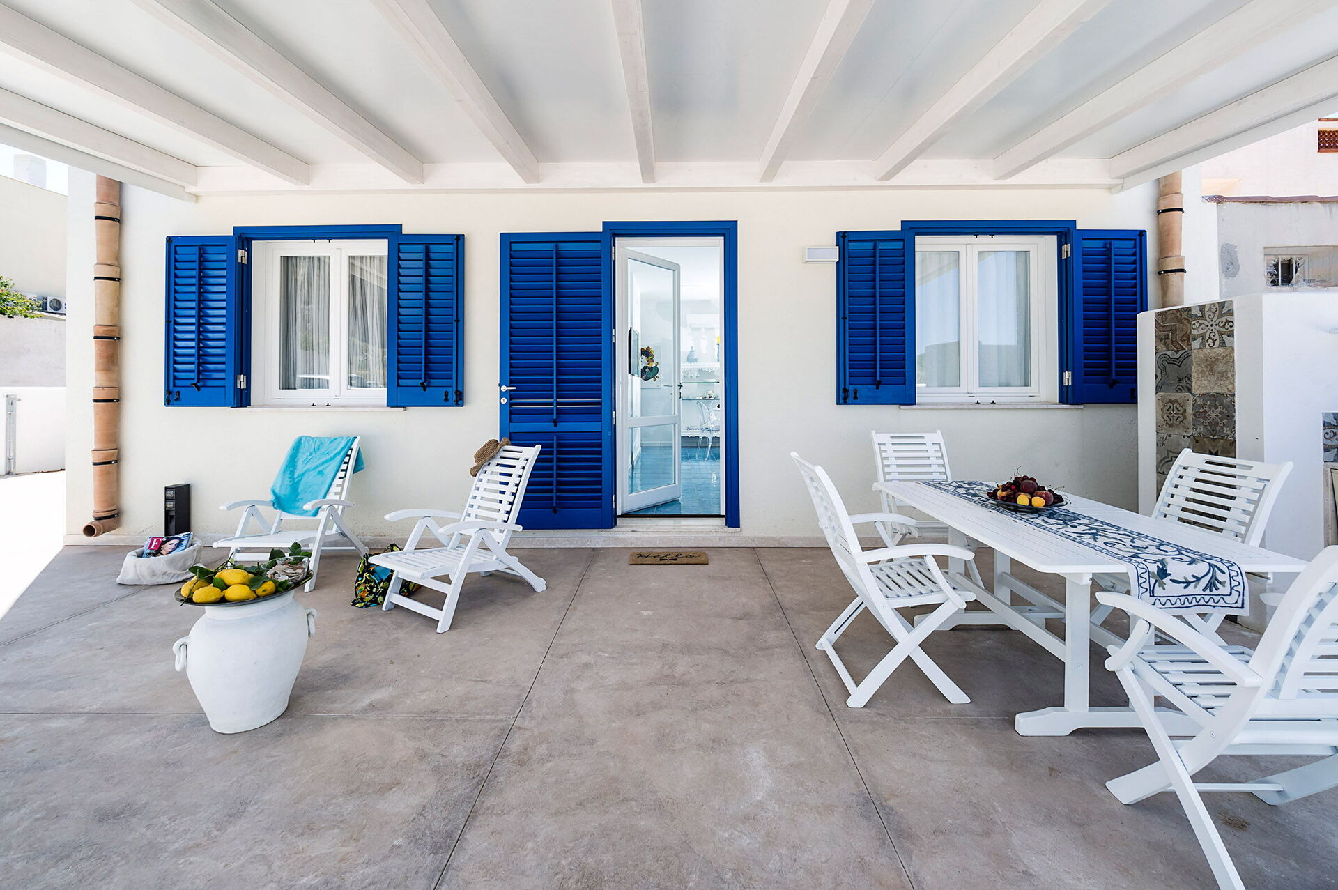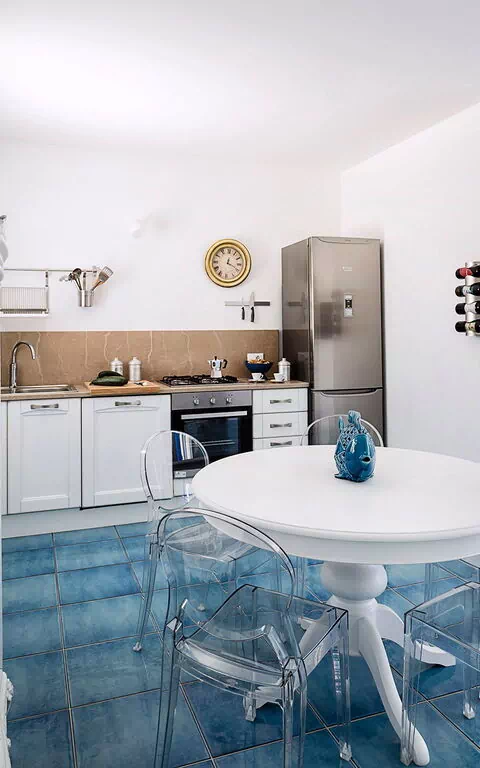 Piano terreno:ingresso su soggiorno con divano letto singolo (aria condizionata, tv) e cucina (piano cottura, forno, frigorifero, freezer, lavastoviglie, microonde, tostapane, macchina da caffè espresso) con zona pranzo, camera matrimoniale (aria condizionata, zanzariera) con bagno privato con doccia, camera con due letti singoli (aria condizionata, zanzariera), bagno con doccia.