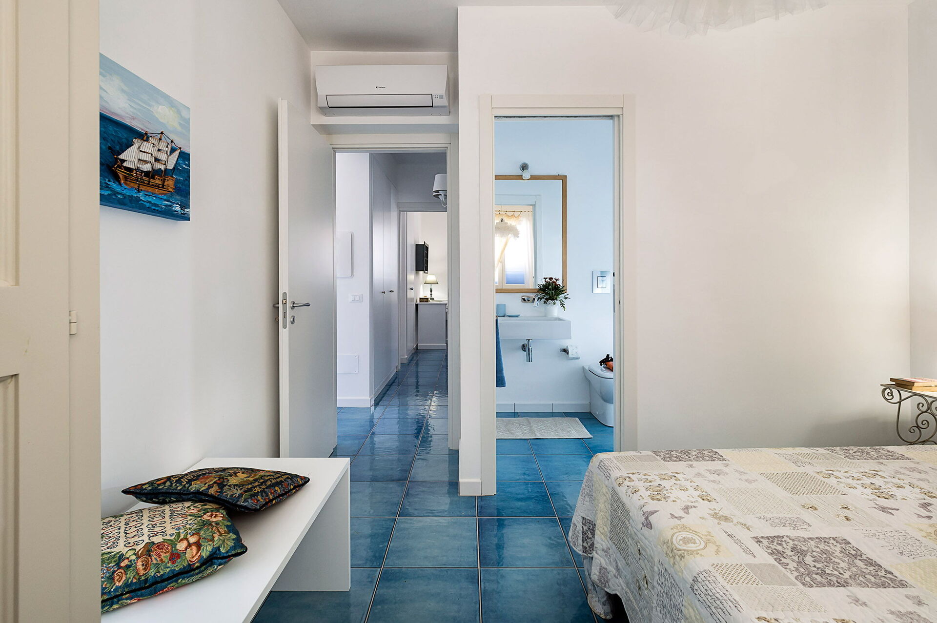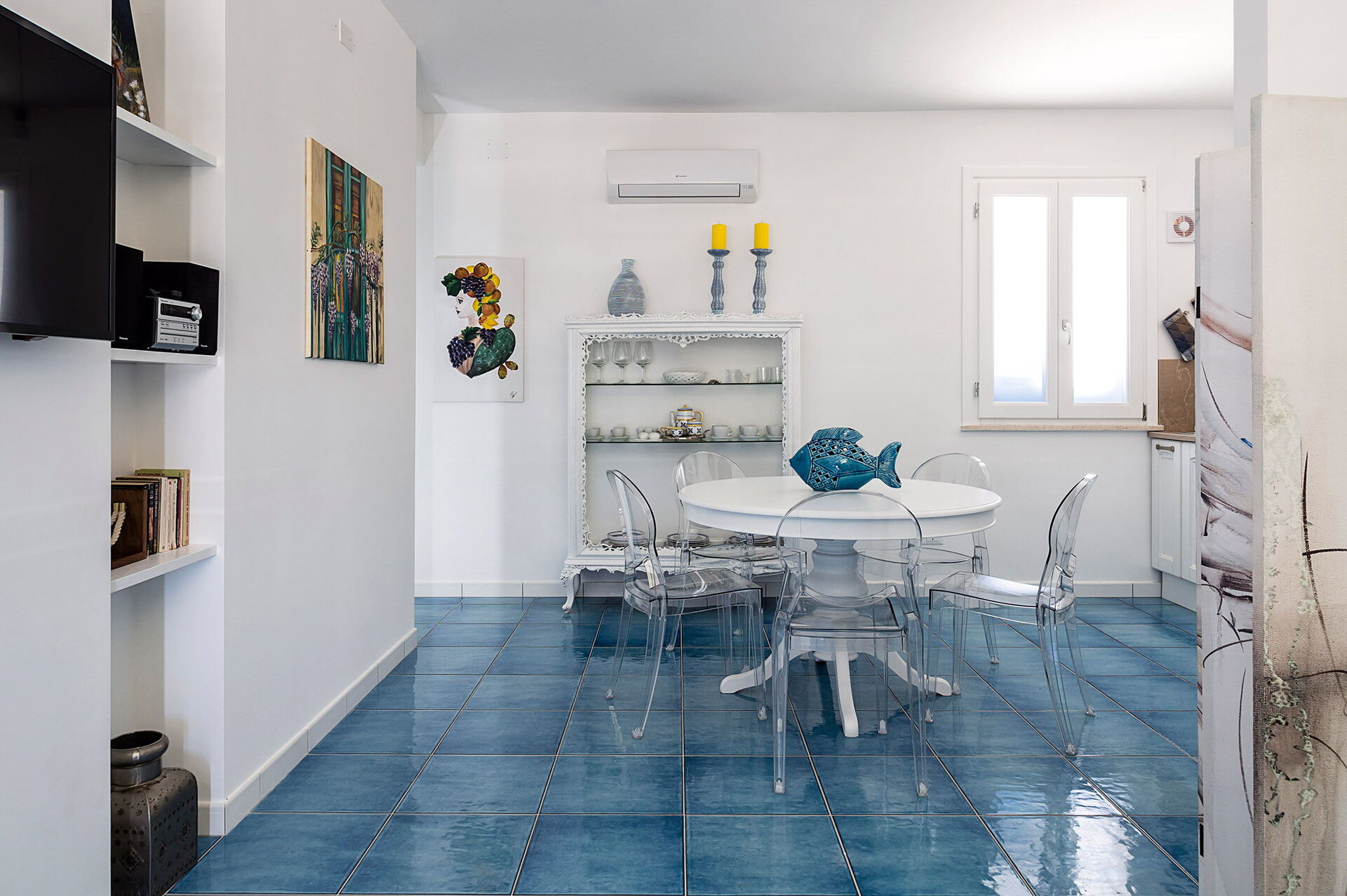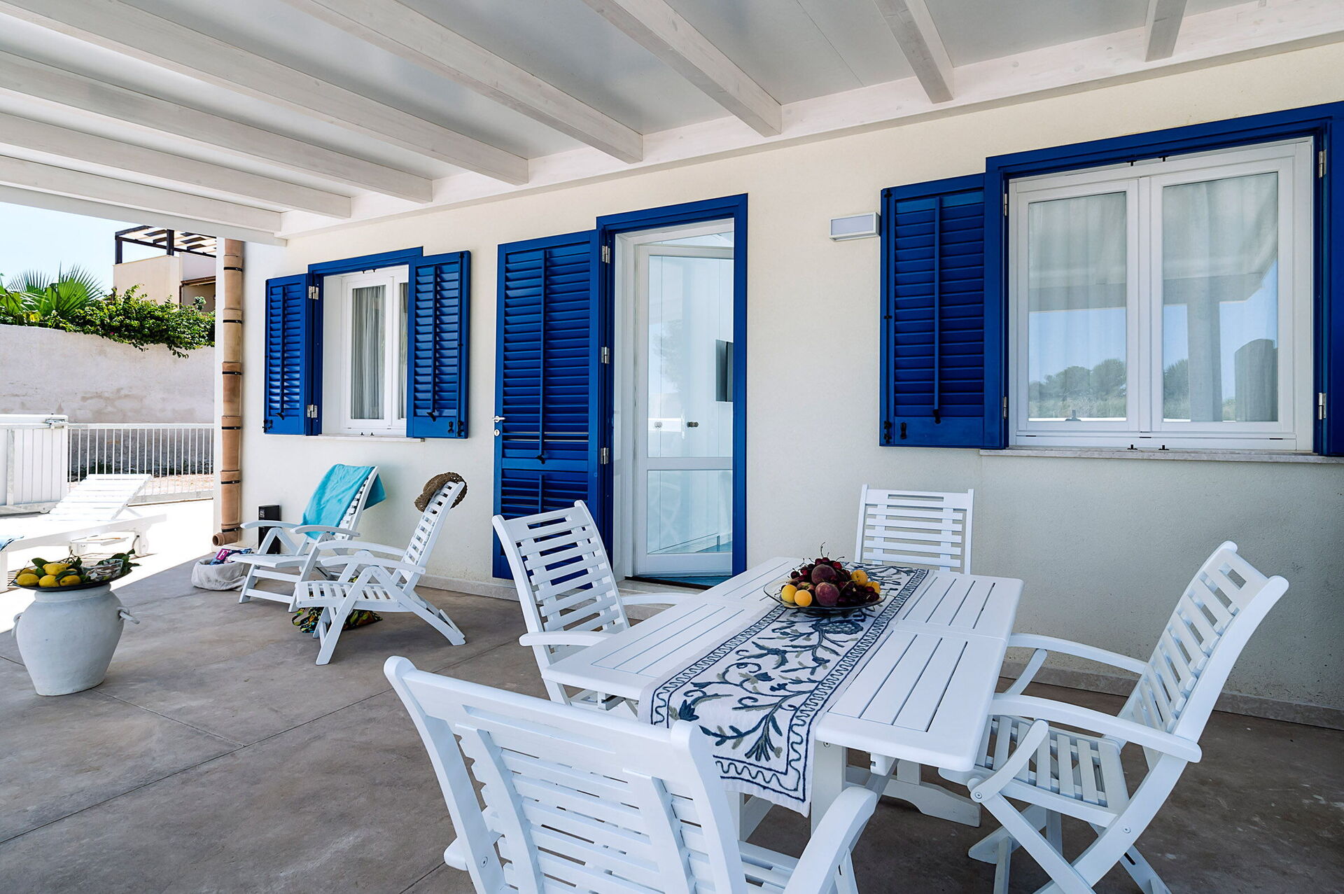 Piano terreno:ingresso su soggiorno con divano letto singolo (aria condizionata, tv) e cucina (piano cottura, forno, frigorifero, freezer, lavastoviglie, microonde, tostapane, macchina da caffè espresso) con zona pranzo, camera matrimoniale (aria condizionata, zanzariera) con bagno privato con doccia, camera con due letti singoli (aria condizionata, zanzariera), bagno con doccia.