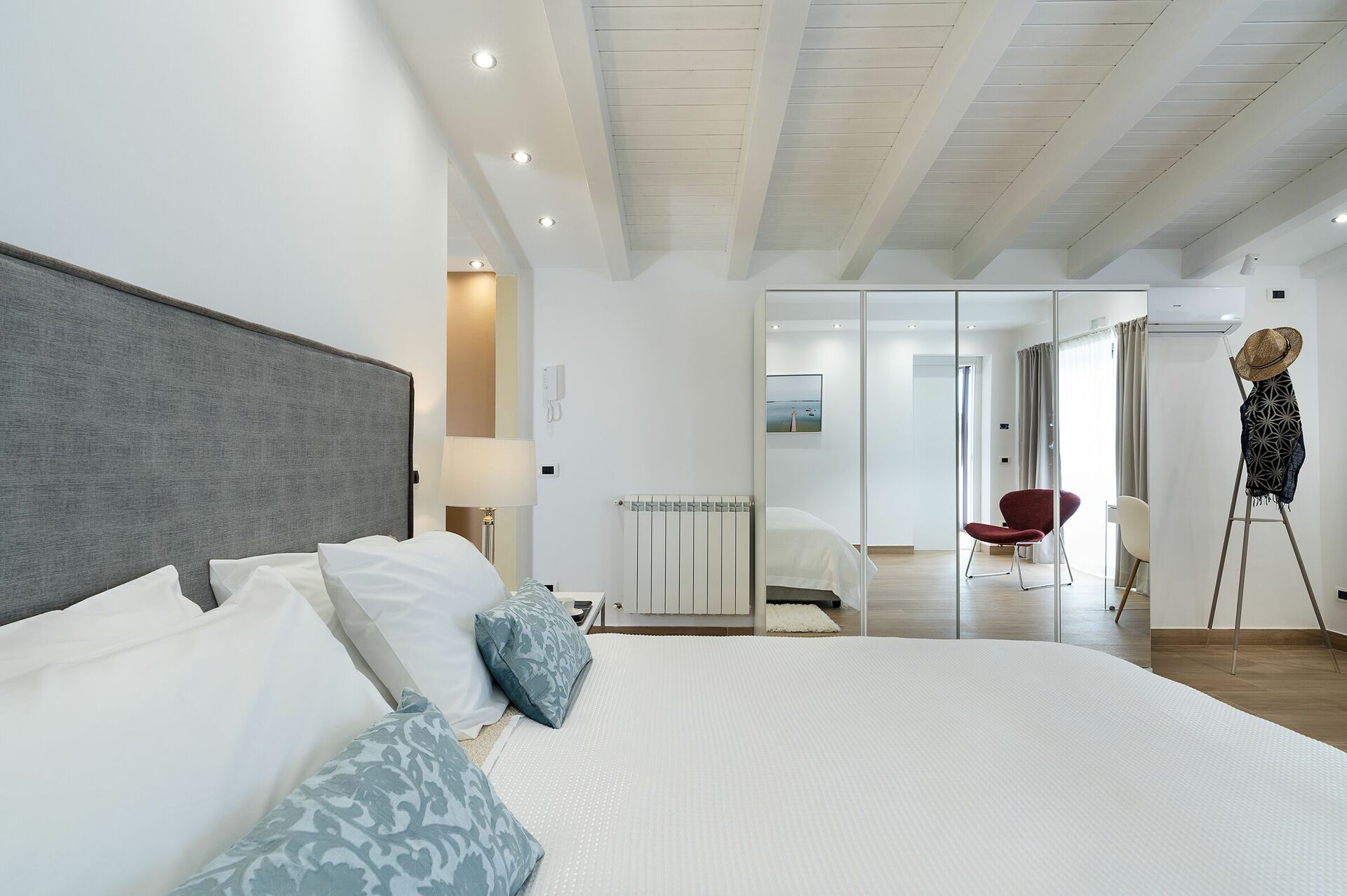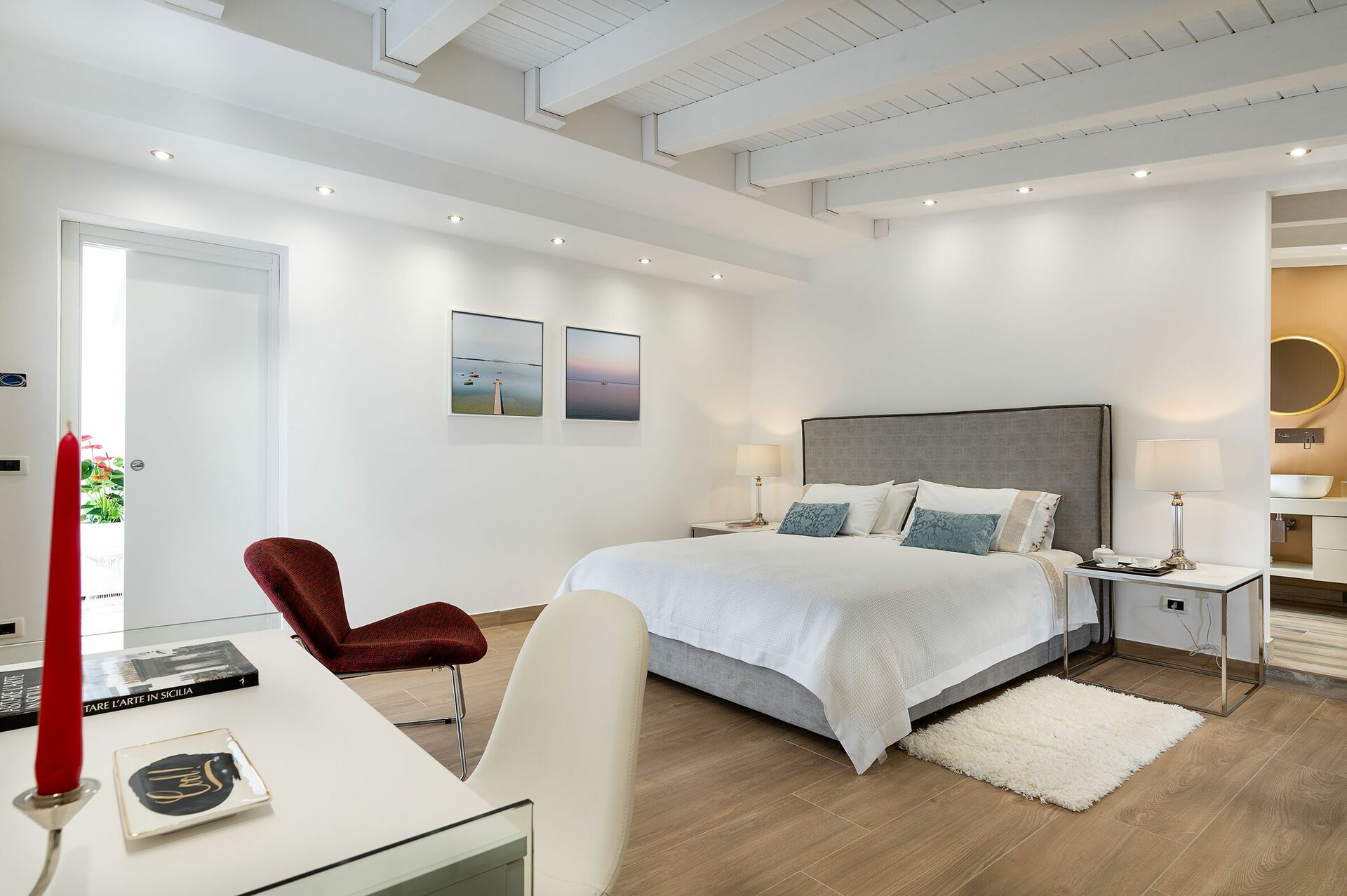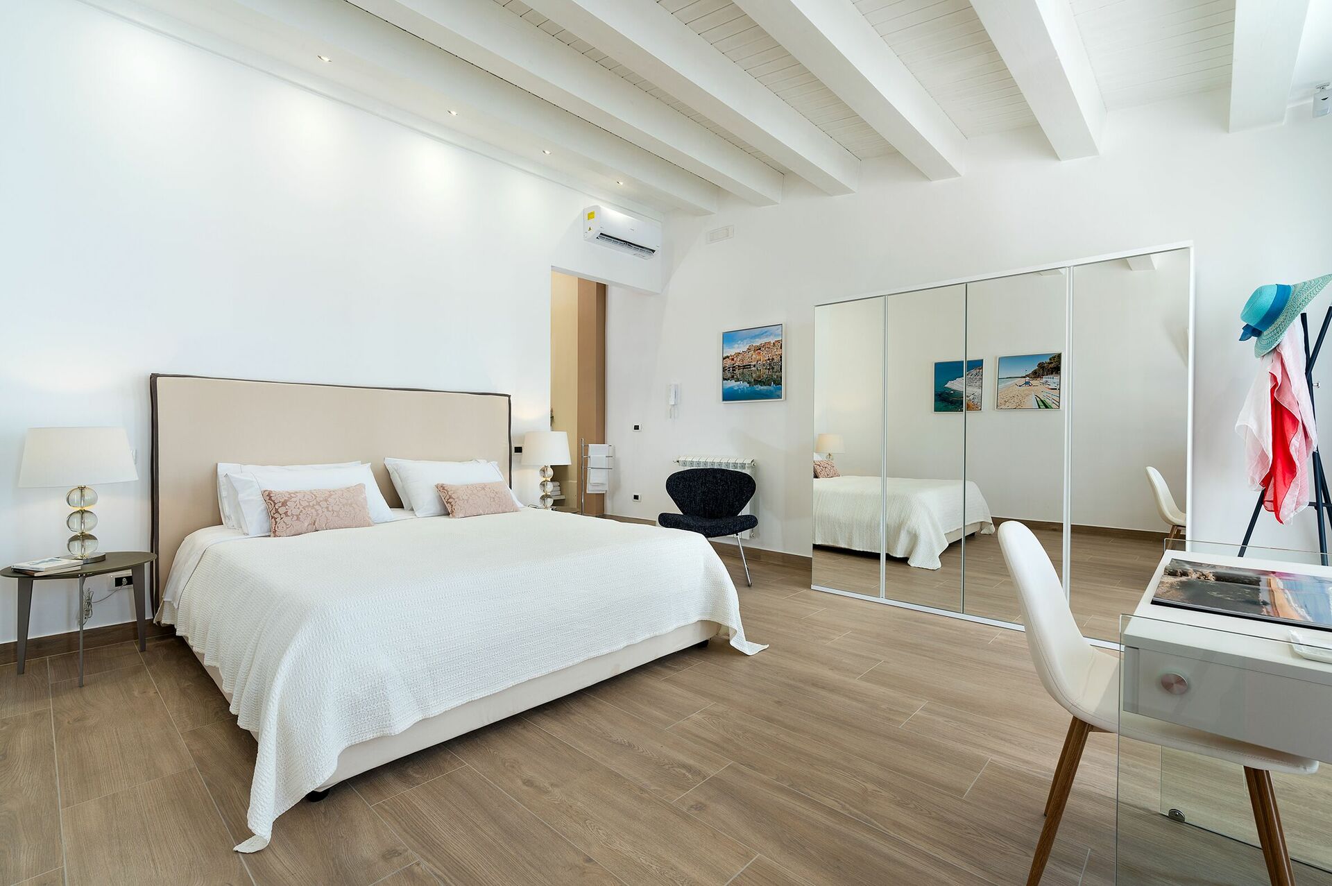 Primo piano: camera matrimoniale con bagno privato con doccia, dalla quale si può accedere ad una terrazza panoramica.