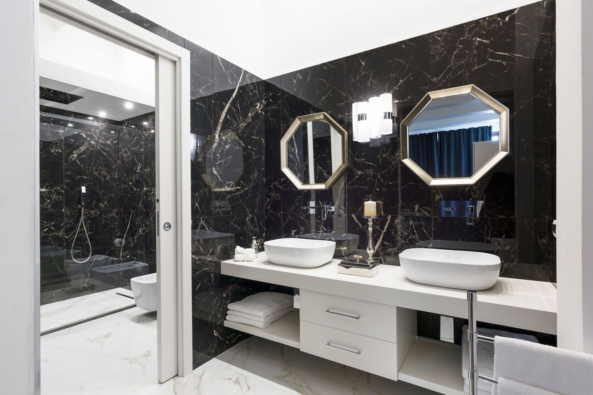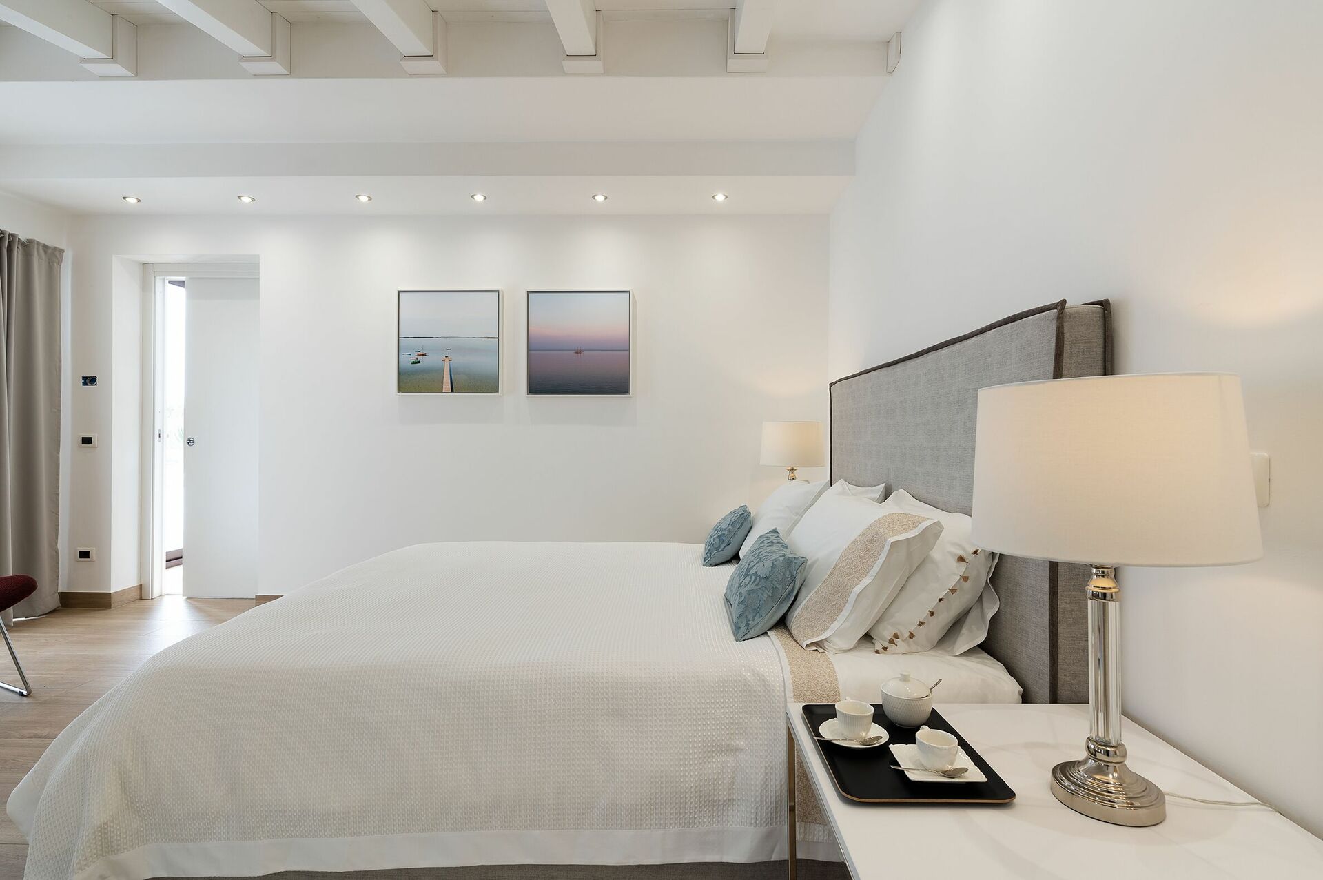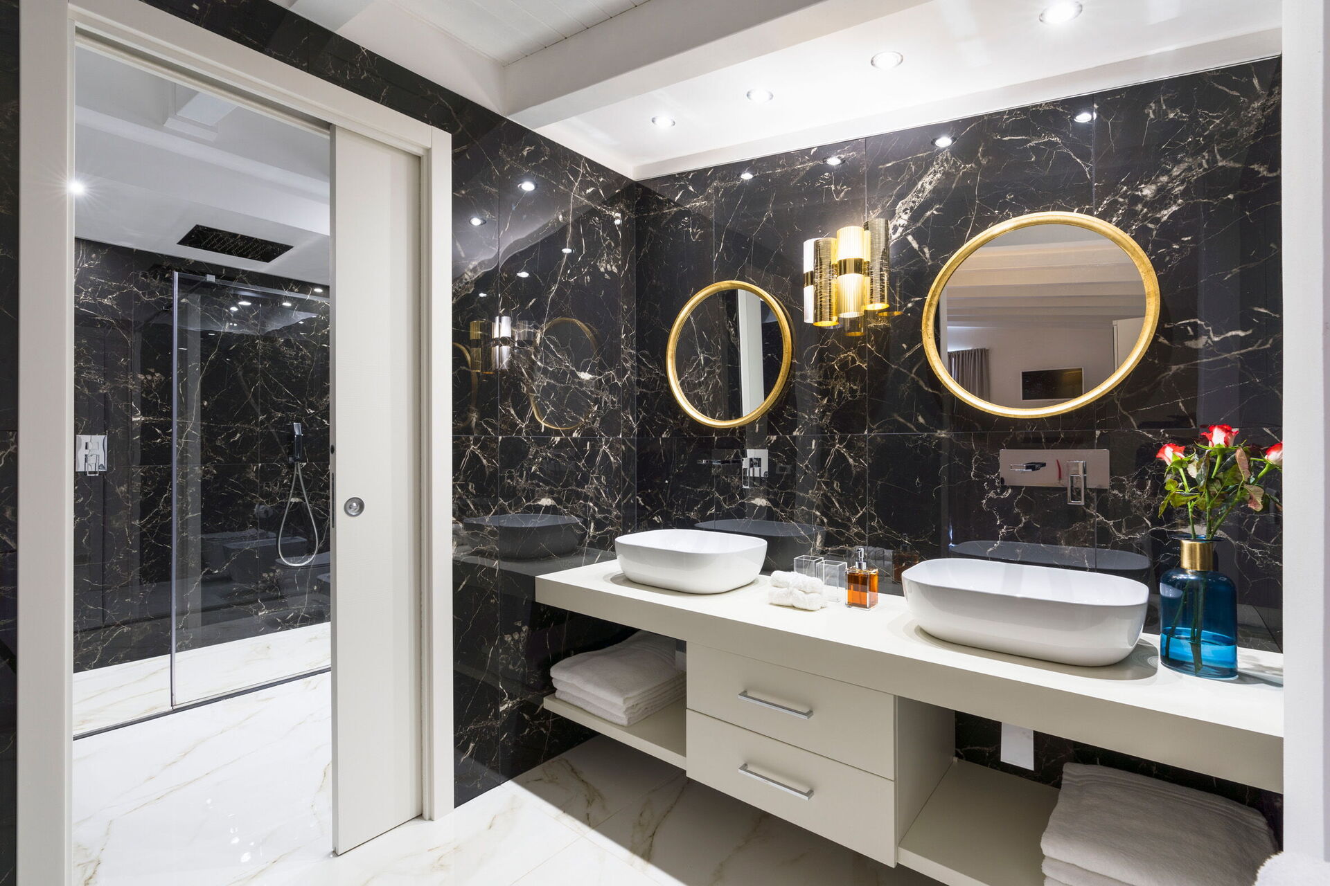 Primo piano: camera matrimoniale con bagno privato con doccia, dalla quale si può accedere ad una terrazza panoramica.