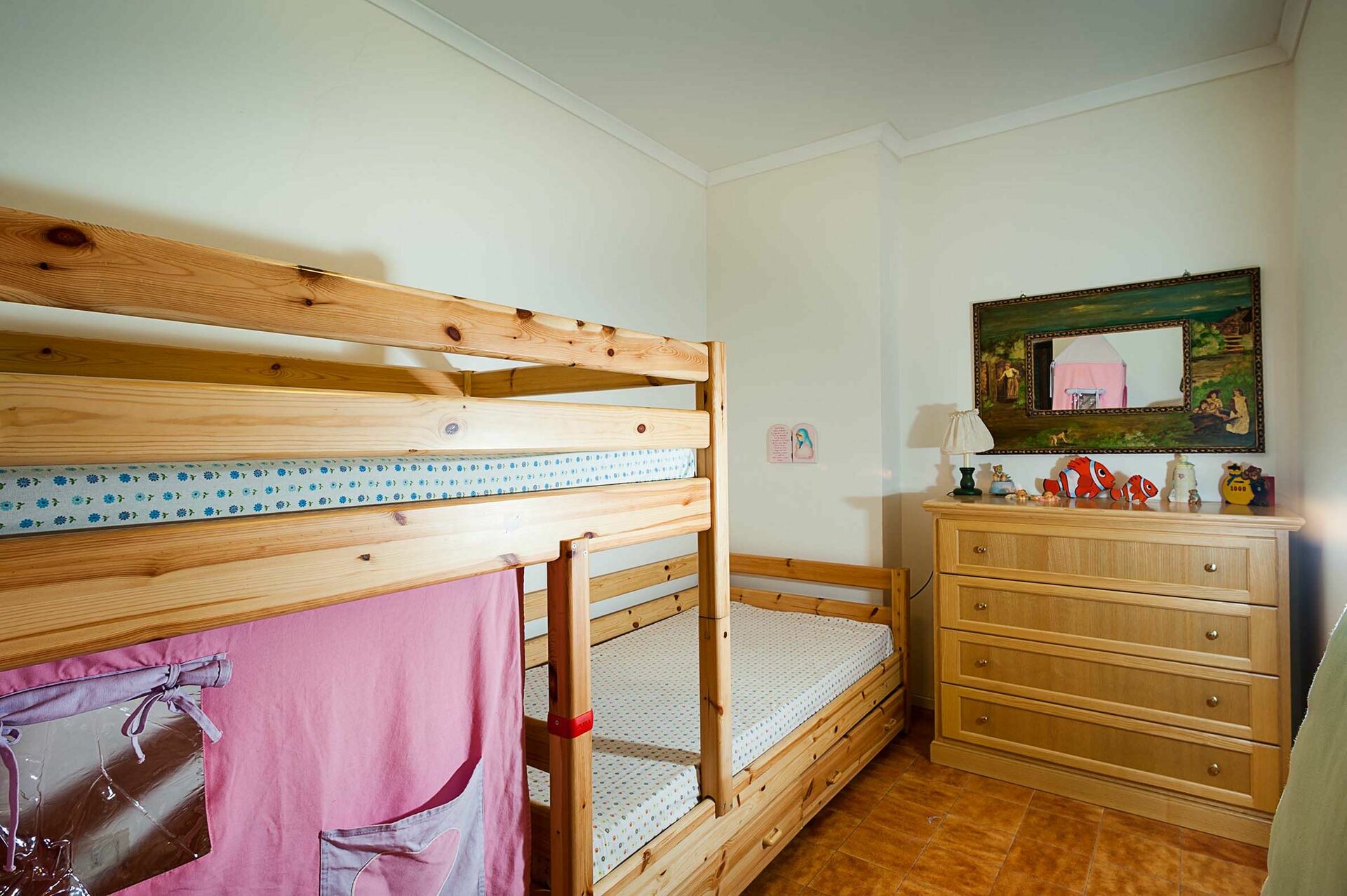 Piano terreno: soggiorno con zona pranzo e angolo cottura (forno, freezer), 1 camera matrimoniale, 1 camera con letto a castello, 1 bagno con doccia.
