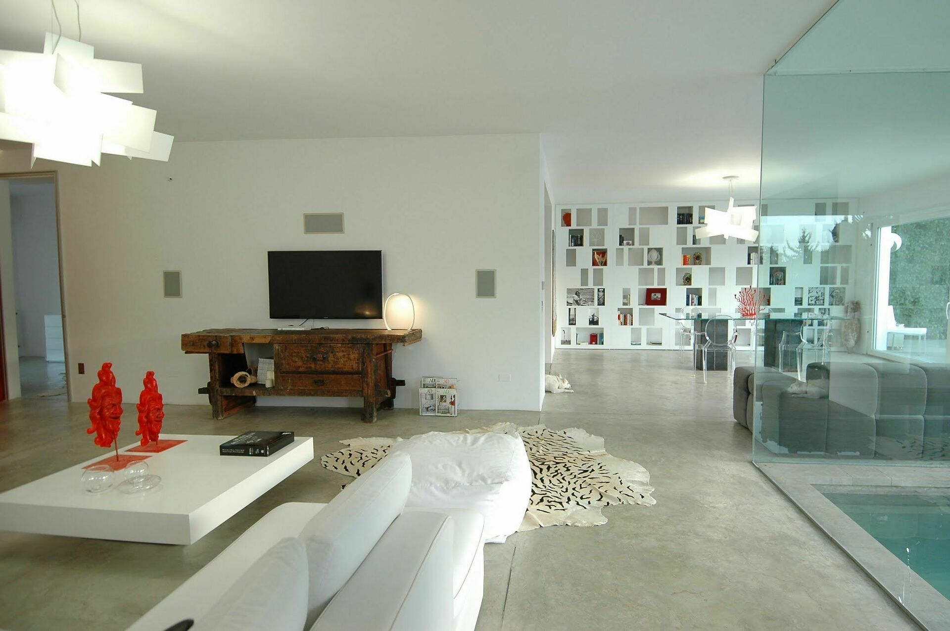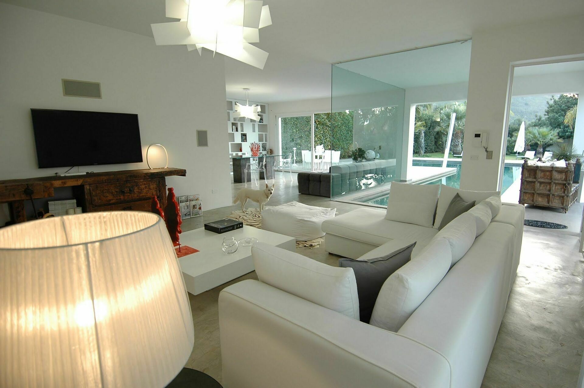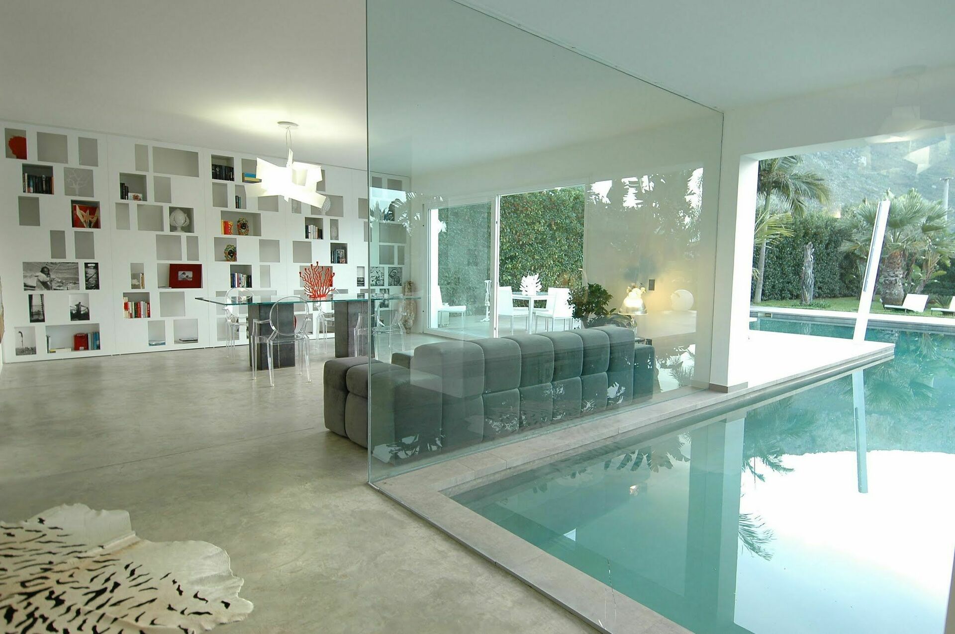 L’ampia zona giorno di questa casa per vacanze è composta da soggiorno, zona pranzo e cucina; le ampie vetrate consentono di godere della vista della piscina che si protende verso l’interno della zona giorno.