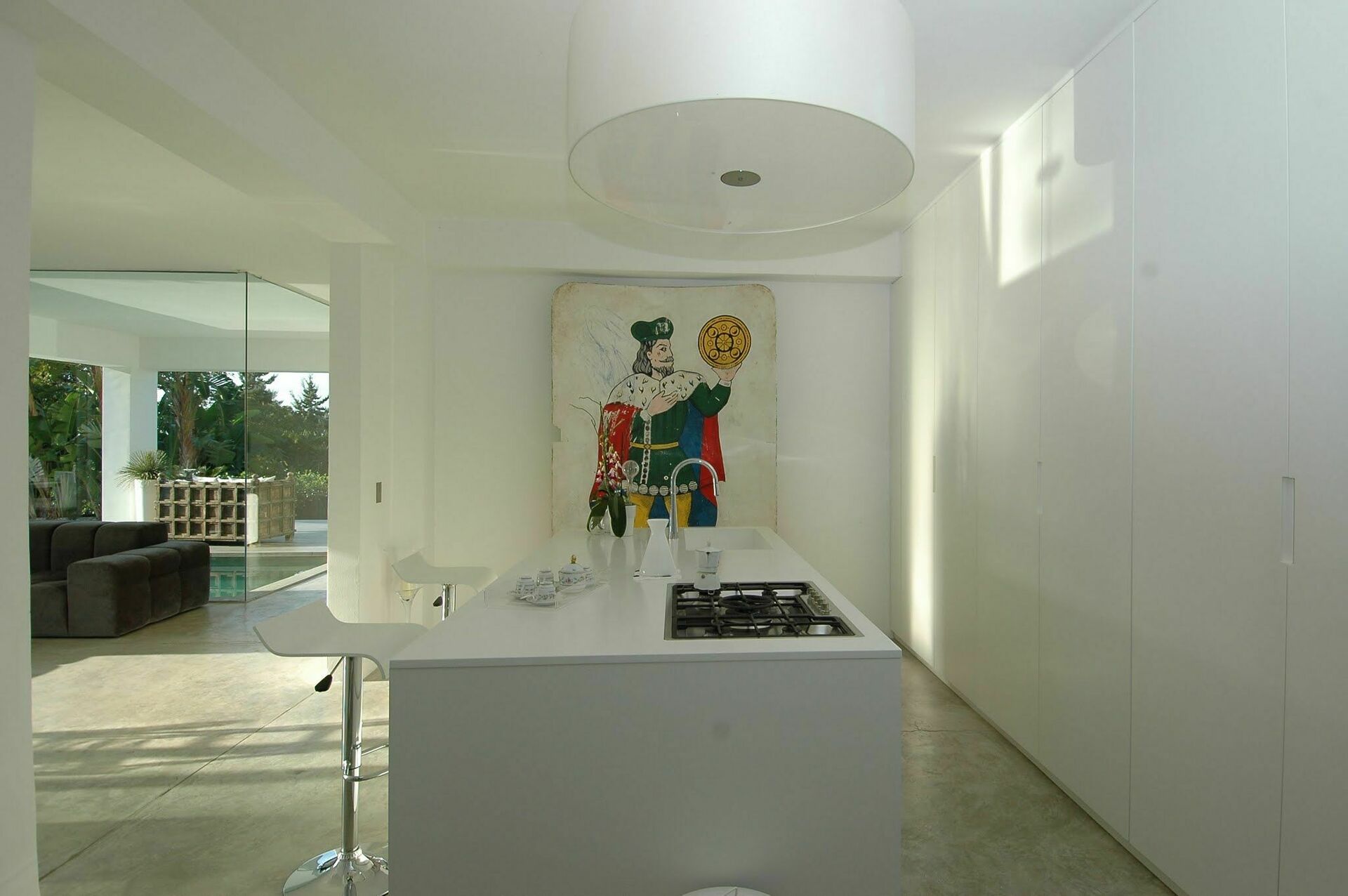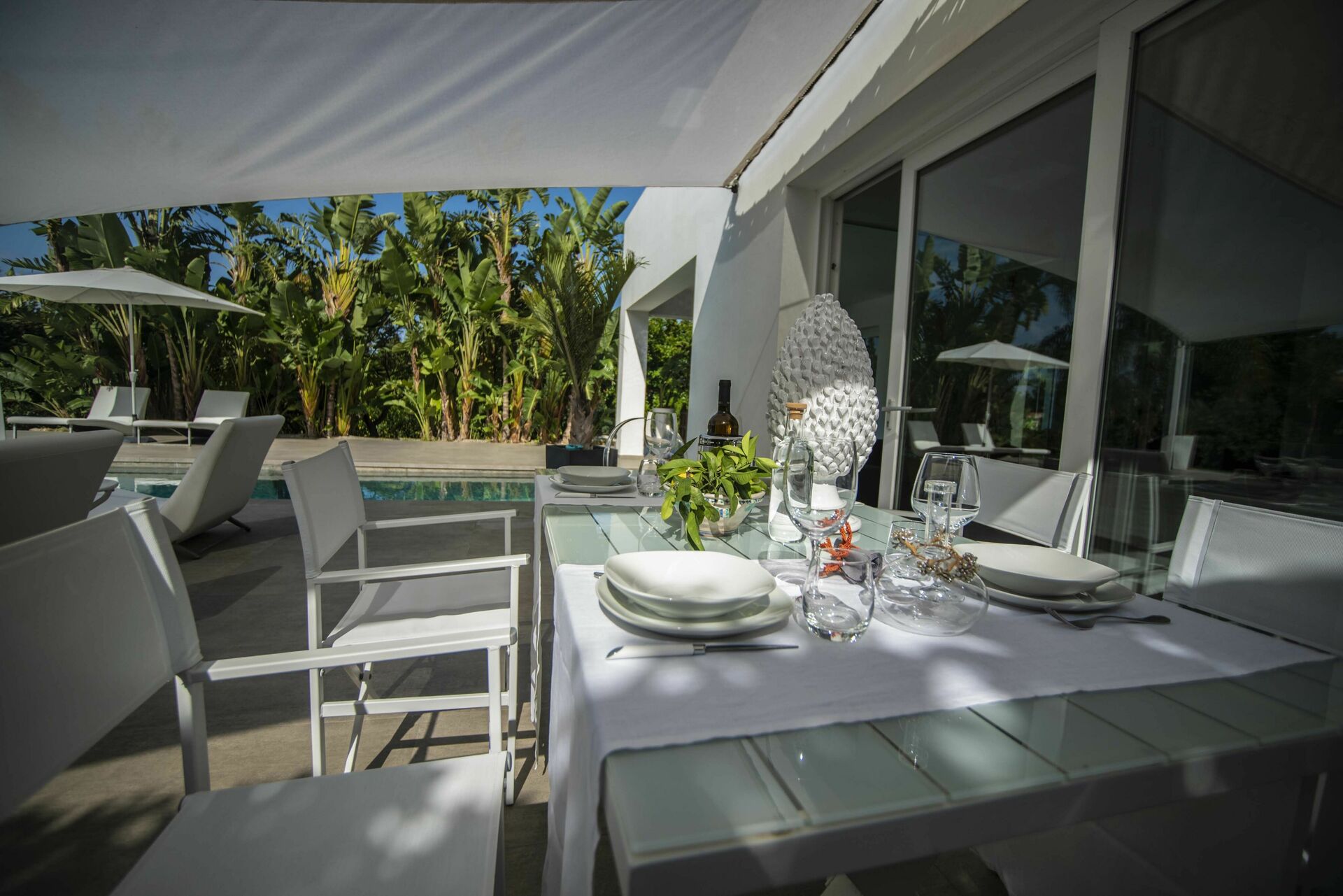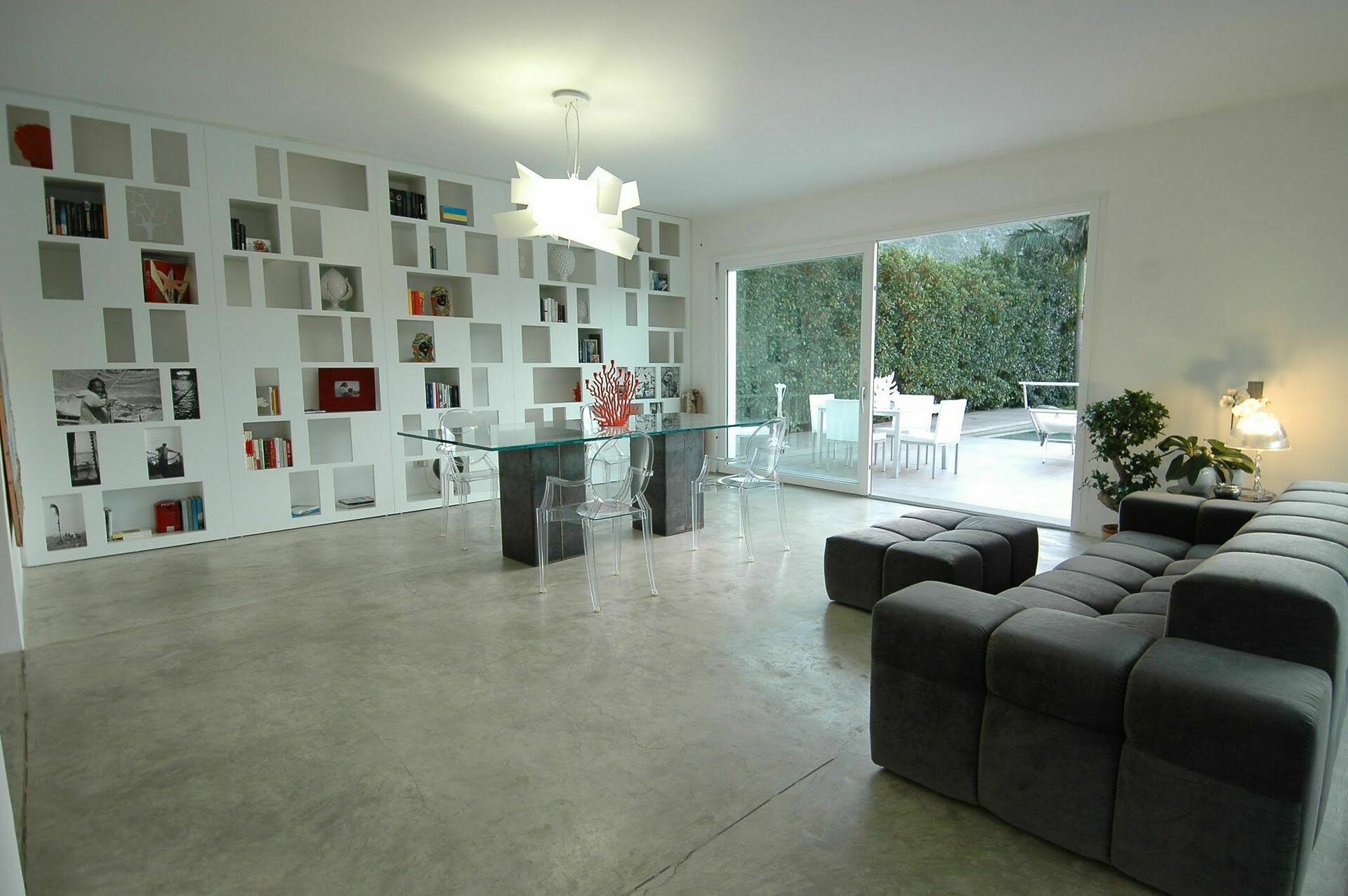 L’ampia zona giorno di questa casa per vacanze è composta da soggiorno, zona pranzo e cucina; le ampie vetrate consentono di godere della vista della piscina che si protende verso l’interno della zona giorno.