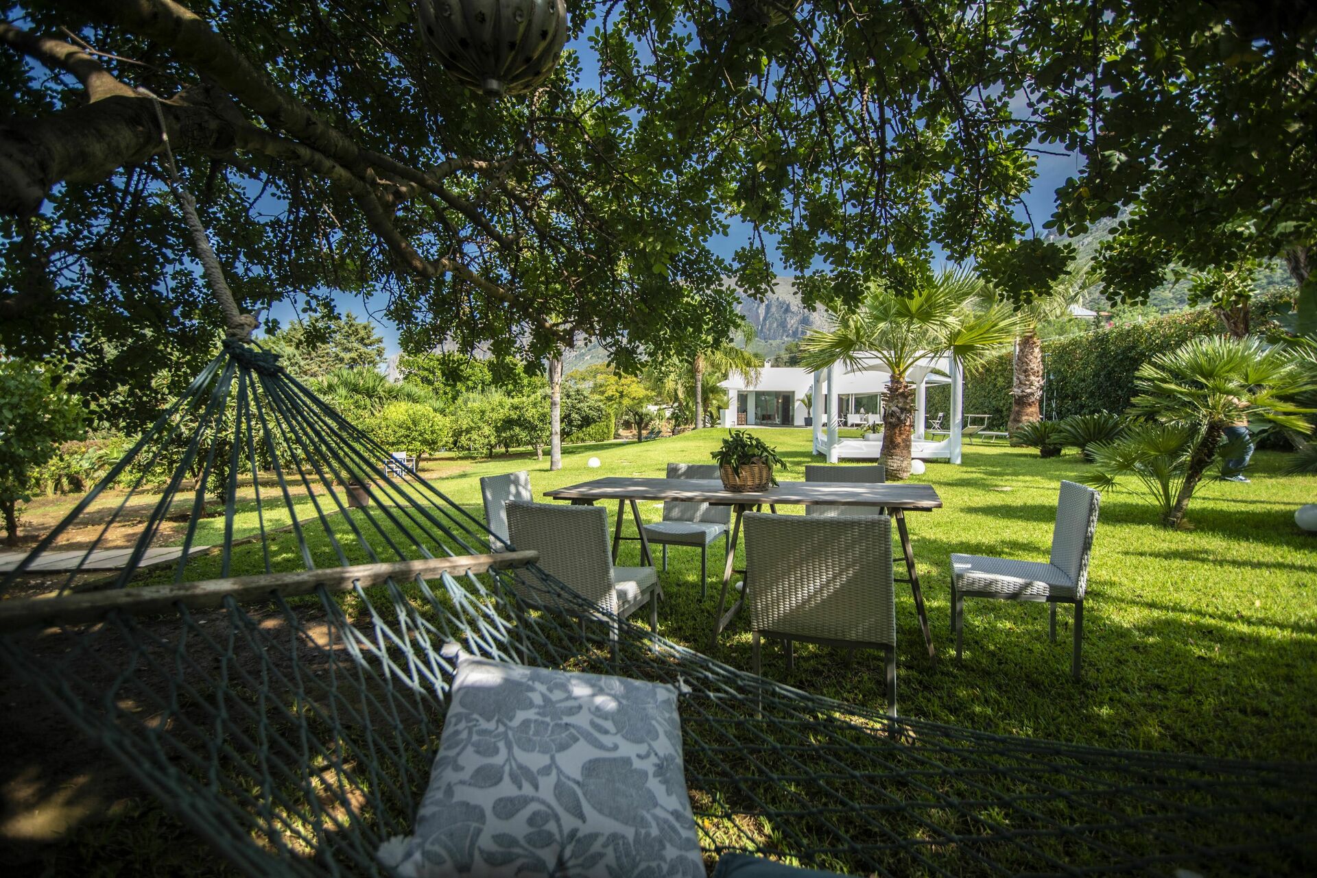 In un angolo del giardino, la macchia mediterranea avvolge la zona barbecue, con zona pranzo per assaporare a diretto contatto con la natura i deliziosi piatti della cucina siciliana.