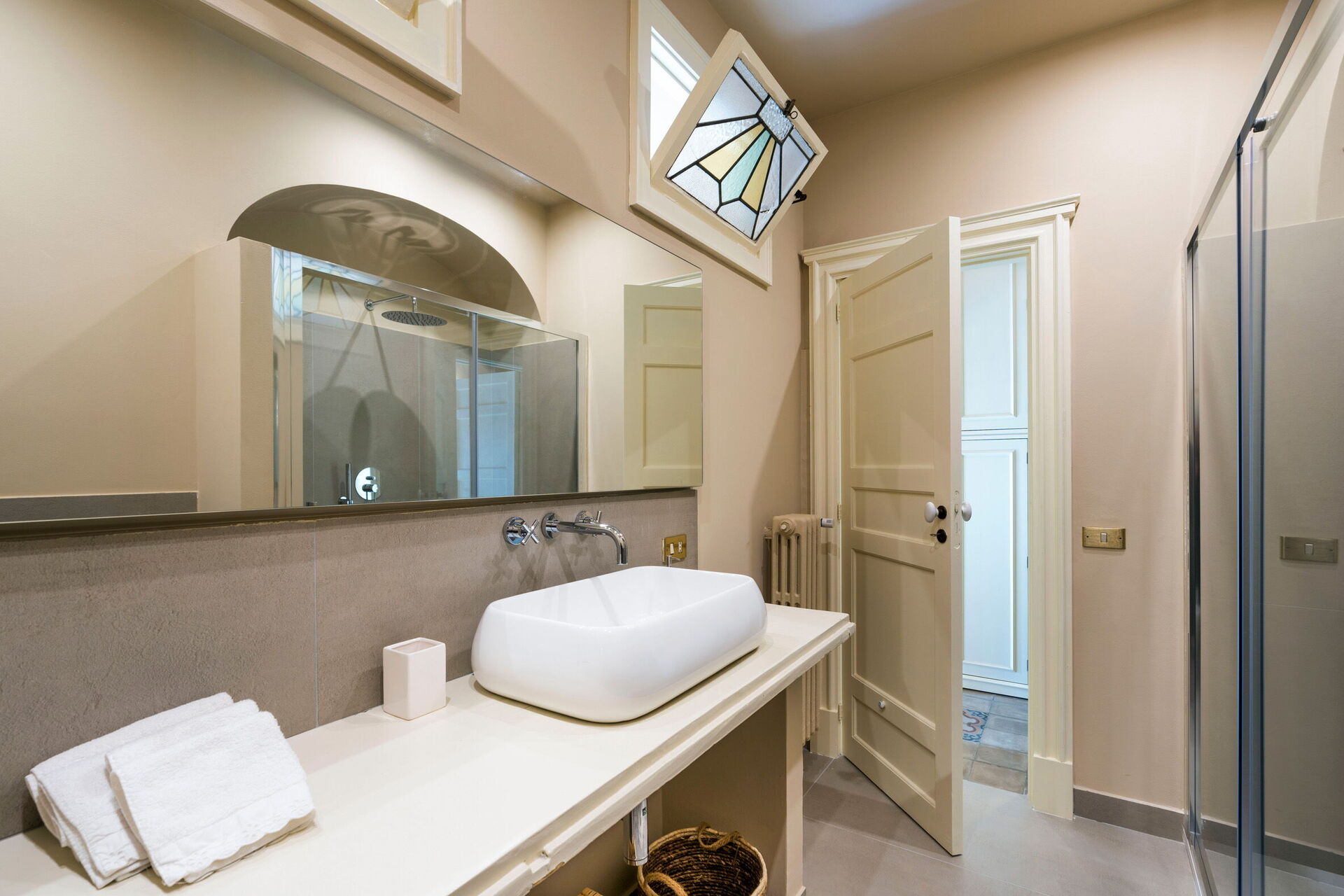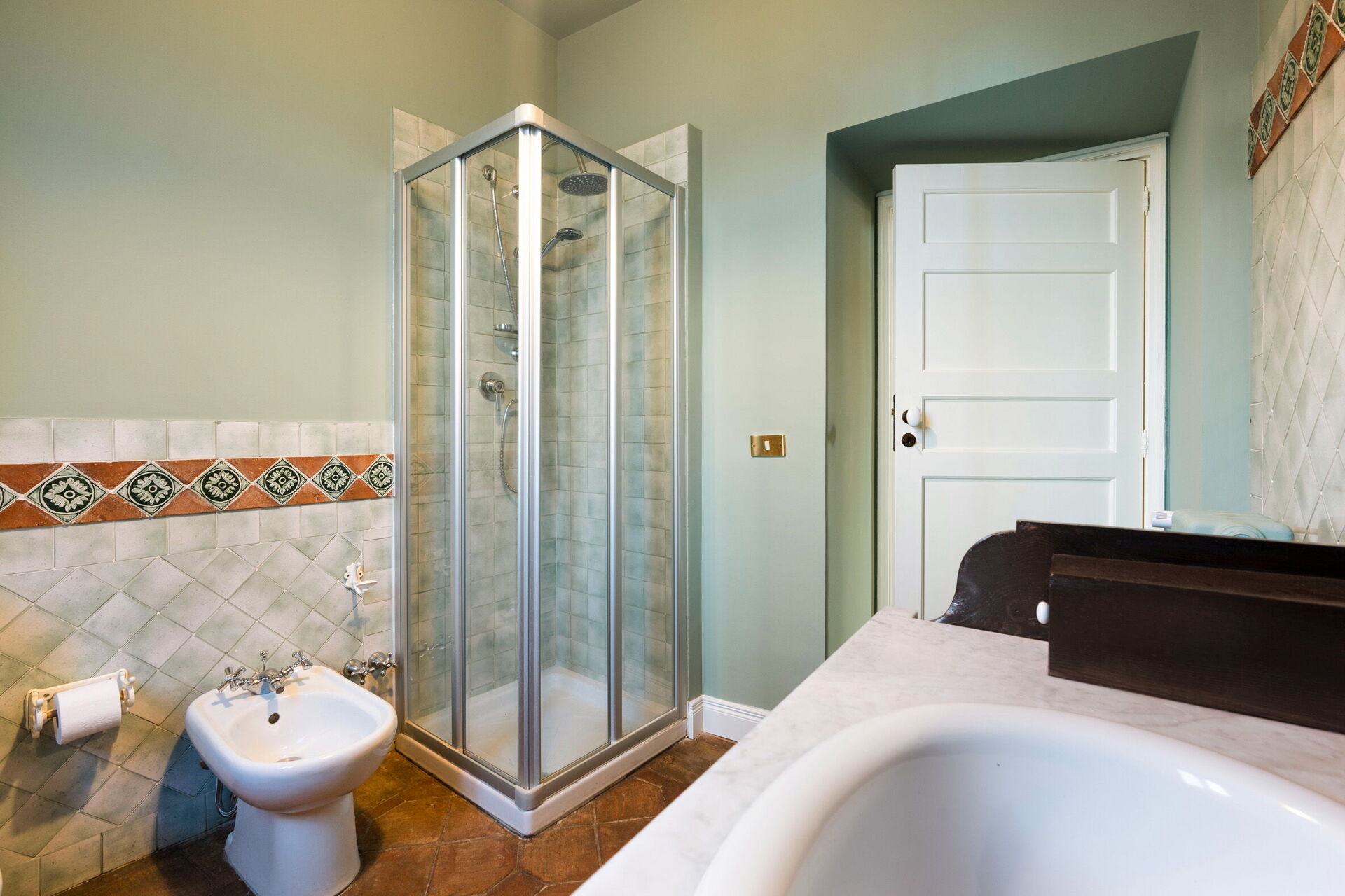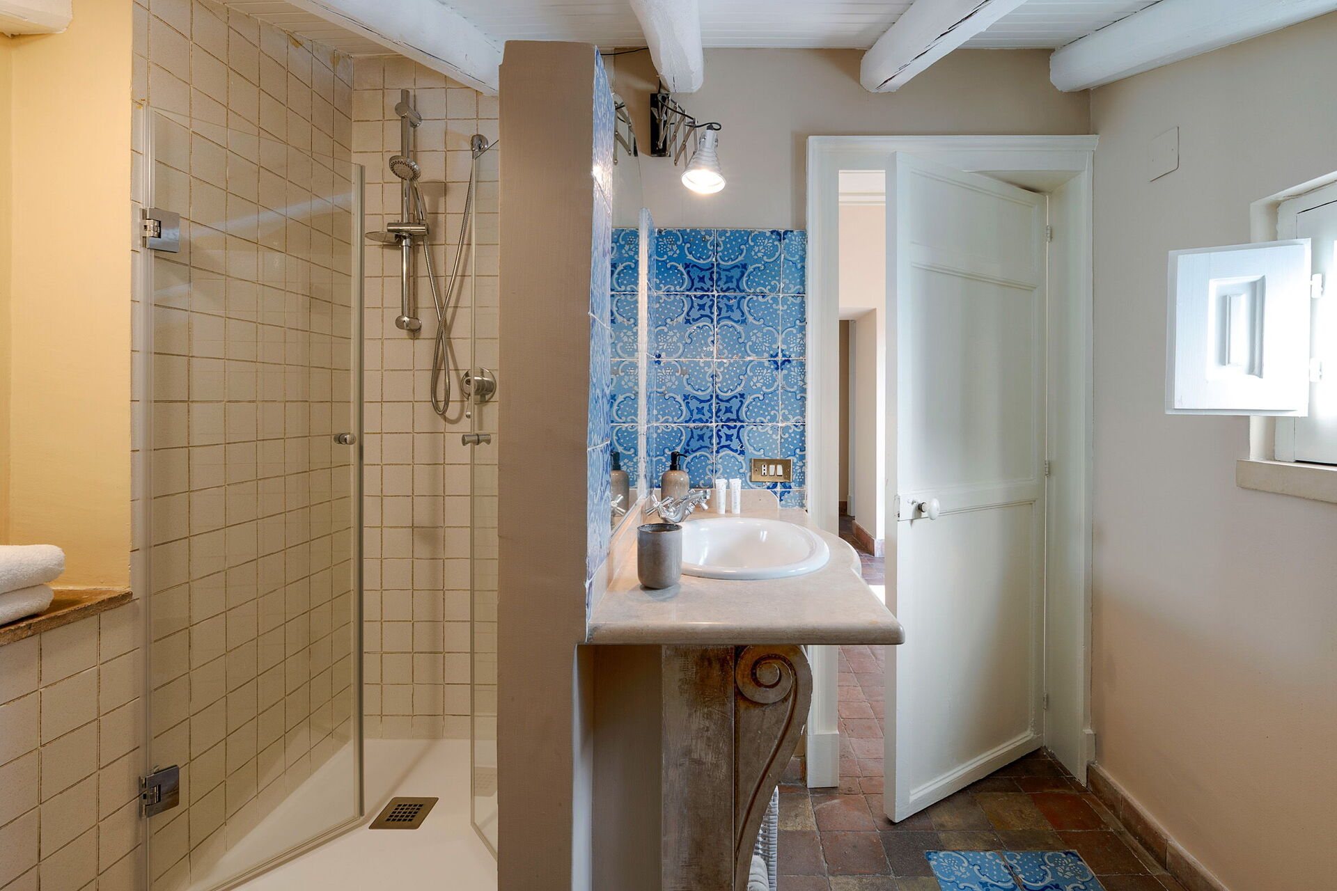Primo piano (ricavato in mansarda): camera matrimoniale (aria condizionata, misure del letto: 160 x 200 cm), bagno con doccia, camera con letto alla francese (aria condizionata).