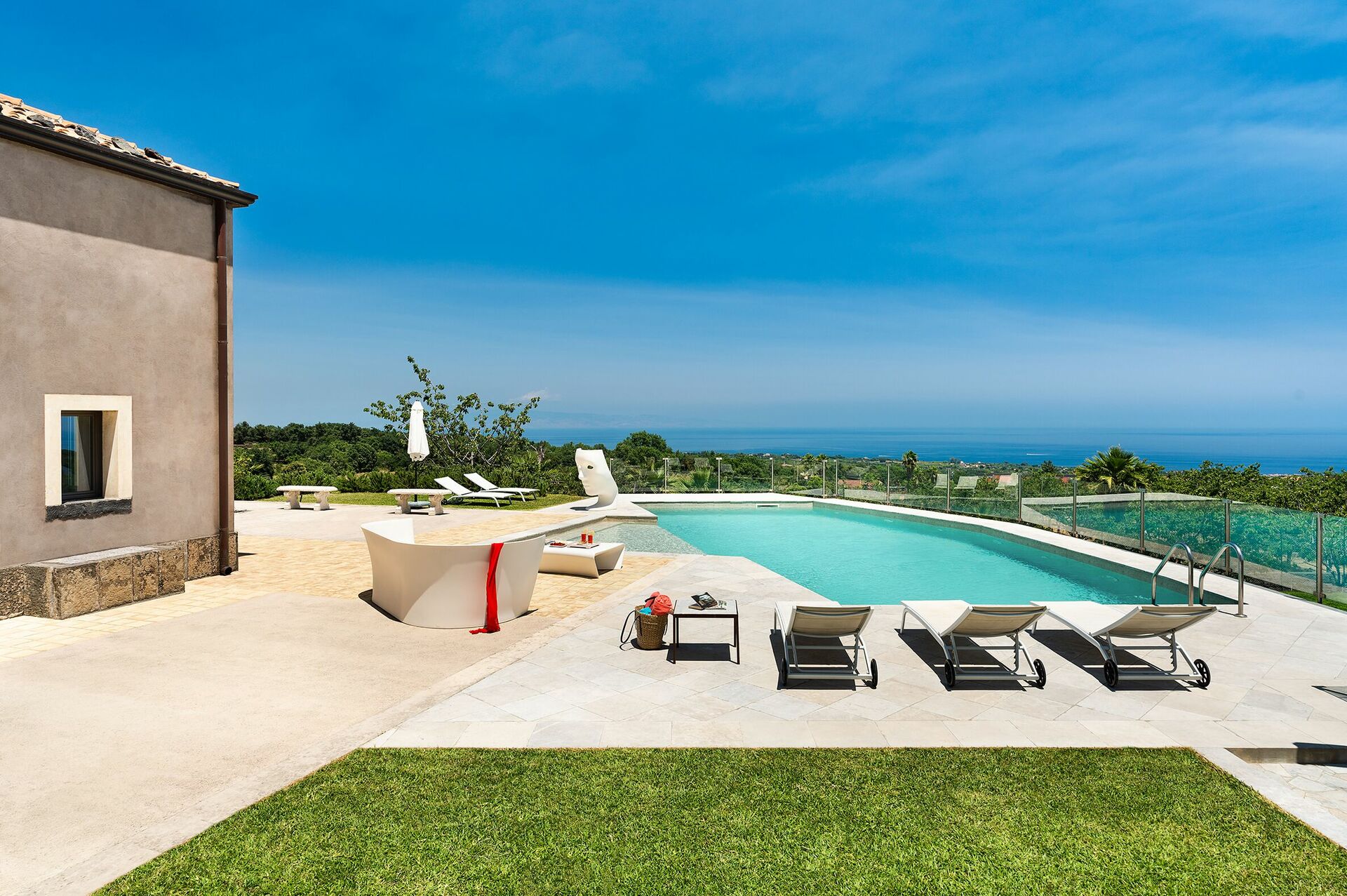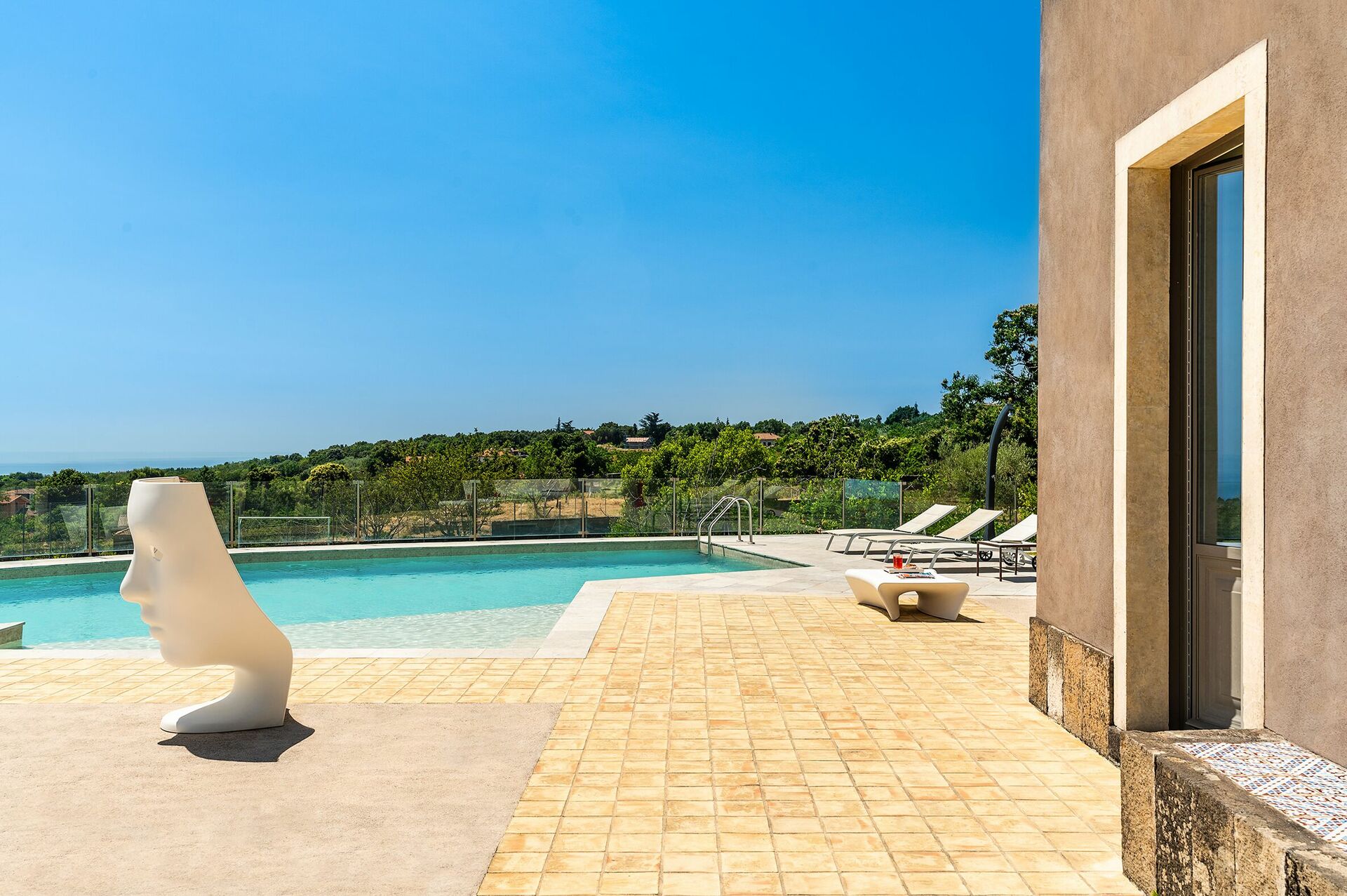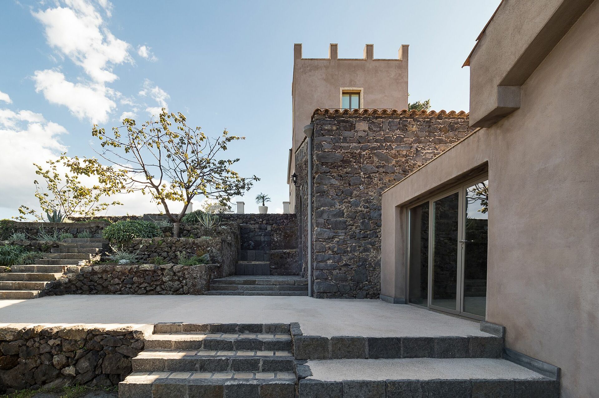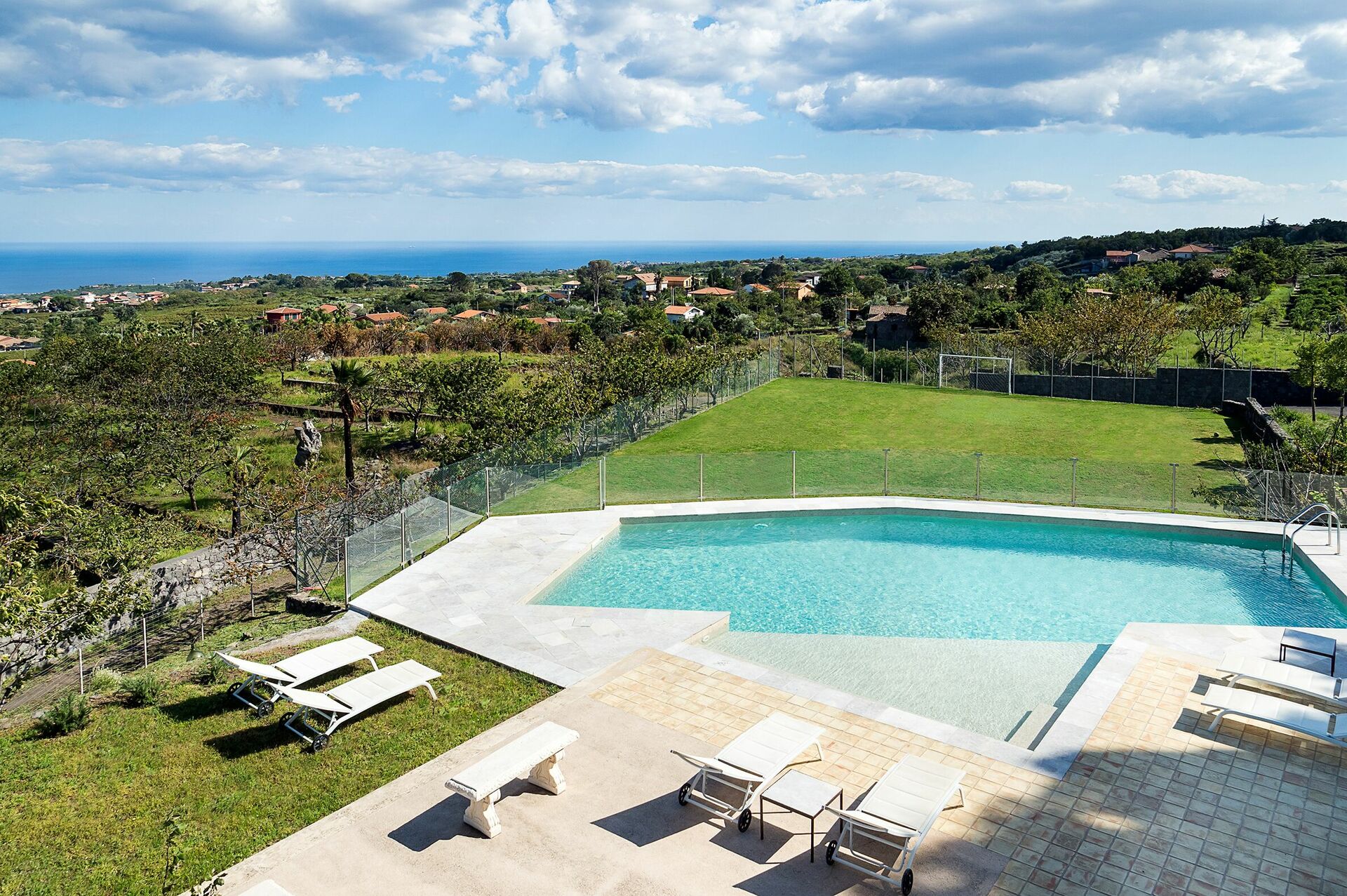 Immerso nel caratteristico paesaggio etneo, profilato da vigneti, frutteti e muretti a secco, il casale vanta una scenografica piscina panoramica, depurata al sale, ampie e ben attrezzate terrazze, un curato giardino ricco di piante aromatiche ed una straordinaria zona benessere con vasca idromassaggio, bagno turco, sauna, doccia emozionale e grotta del sale.