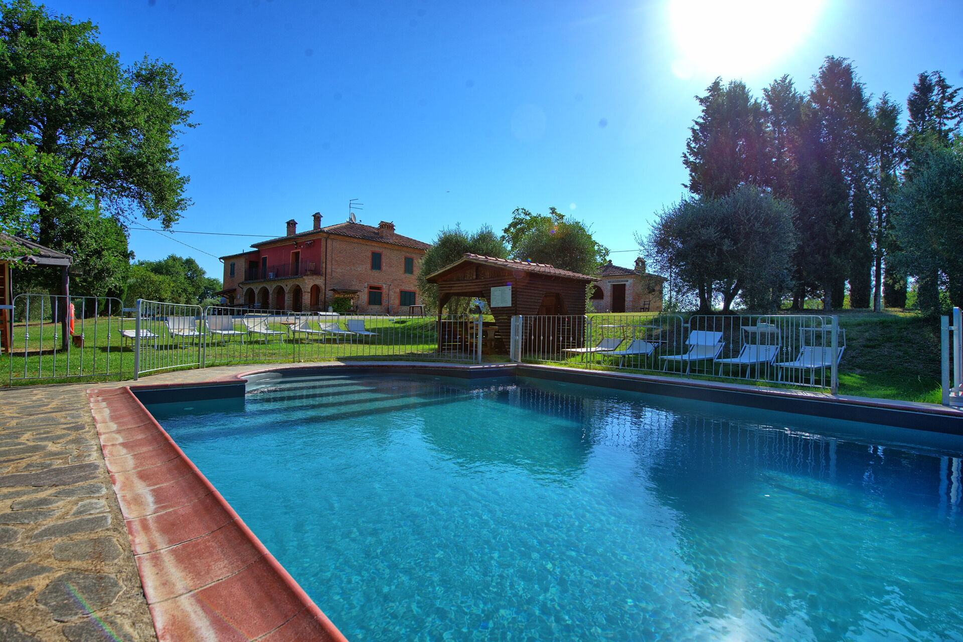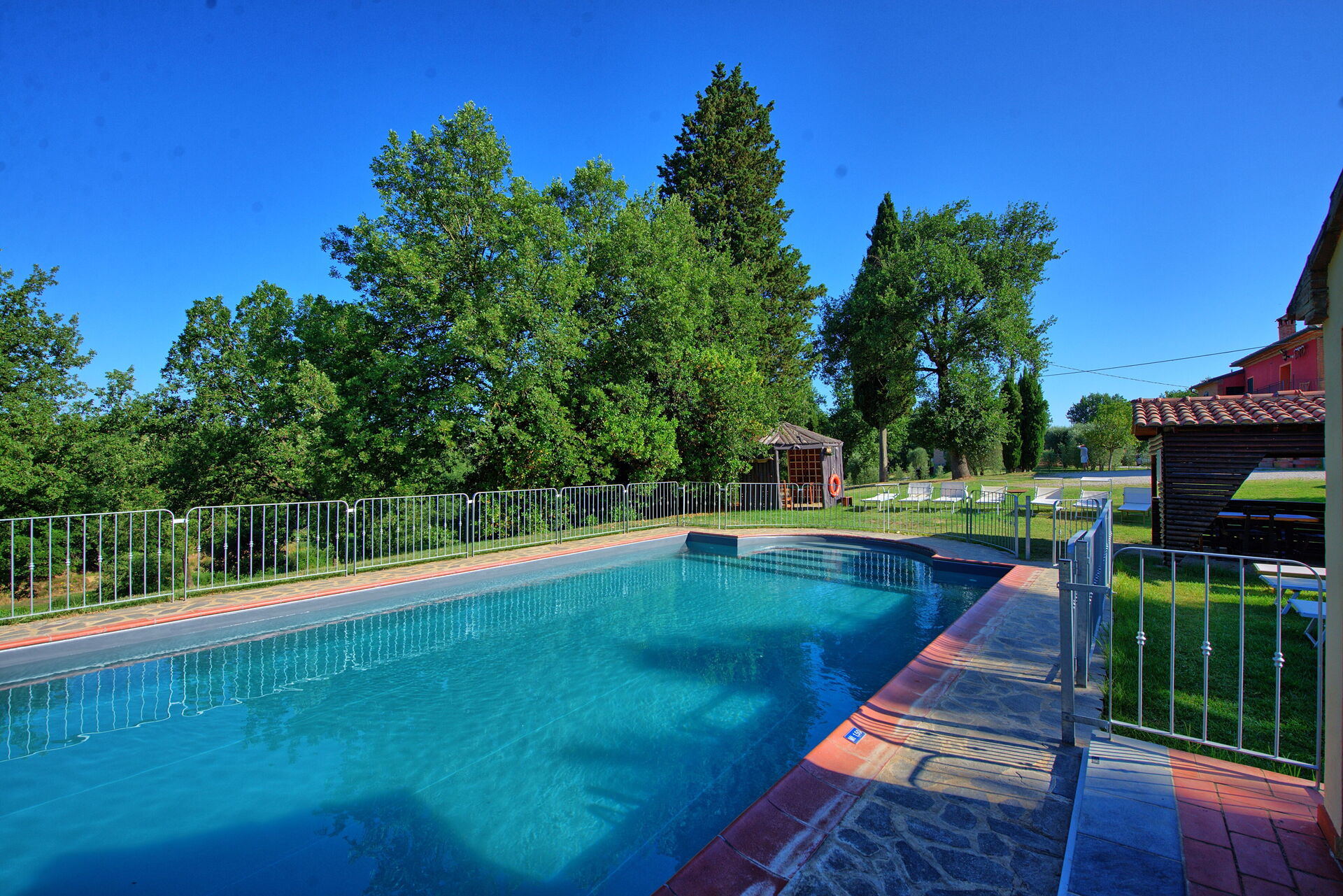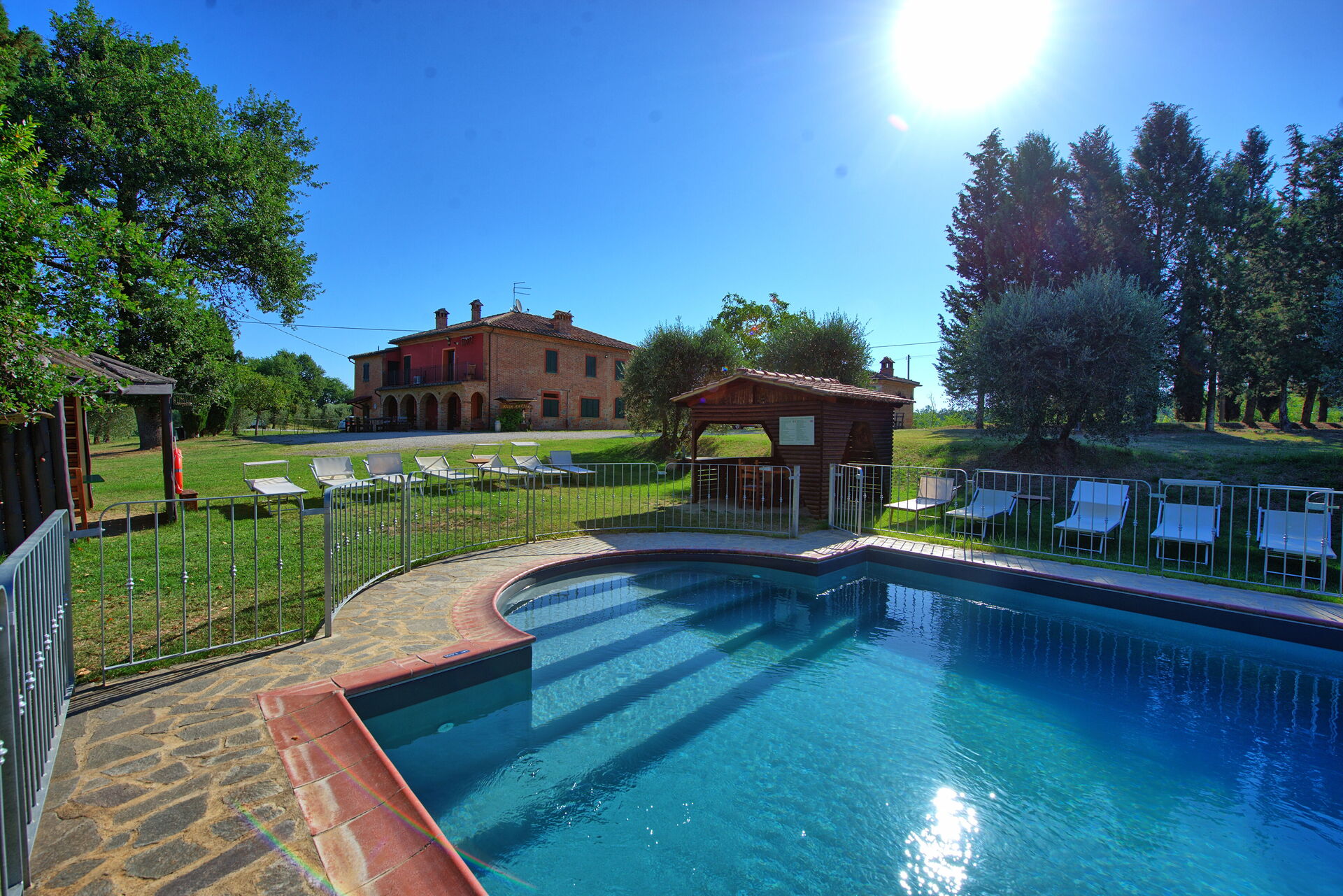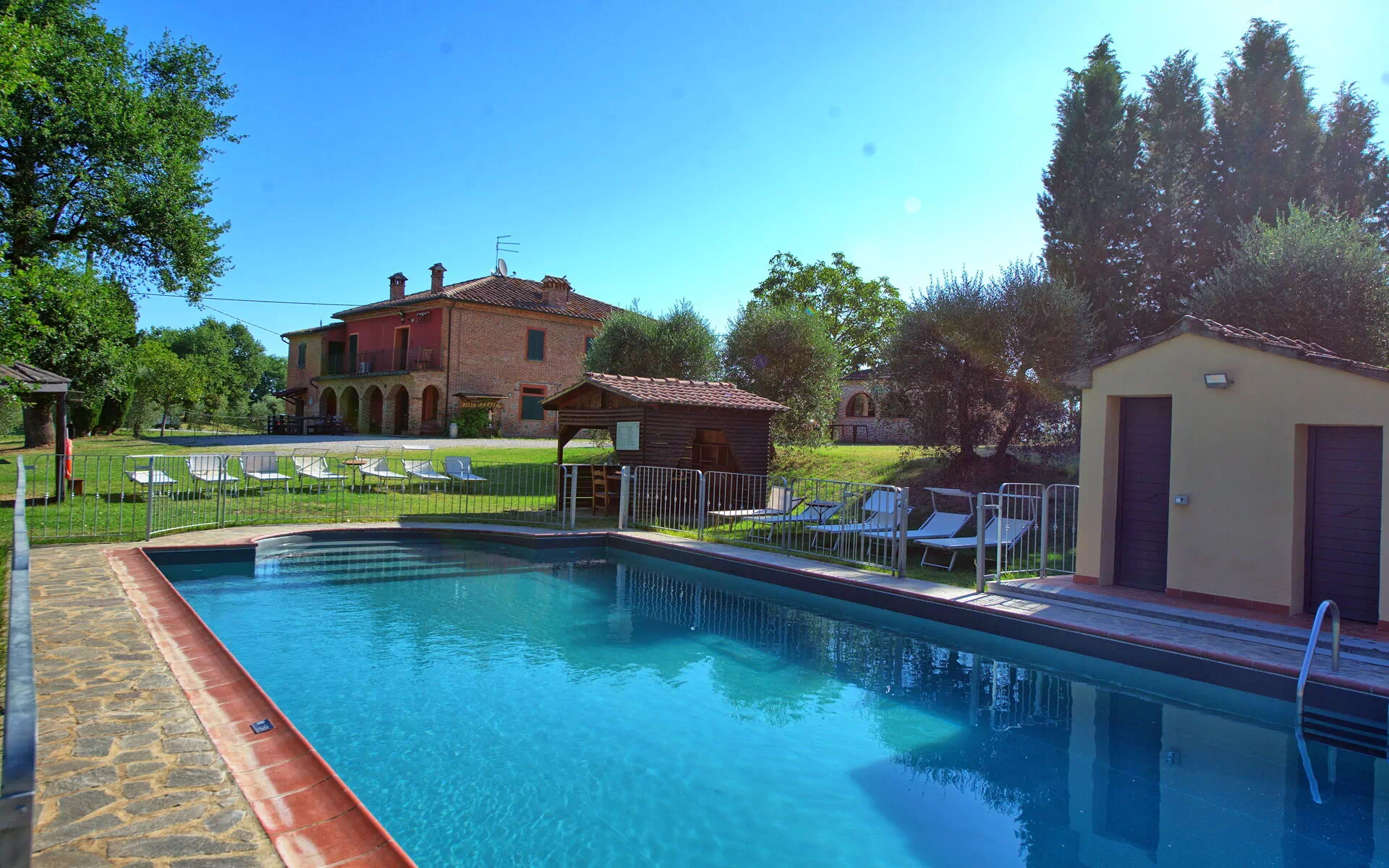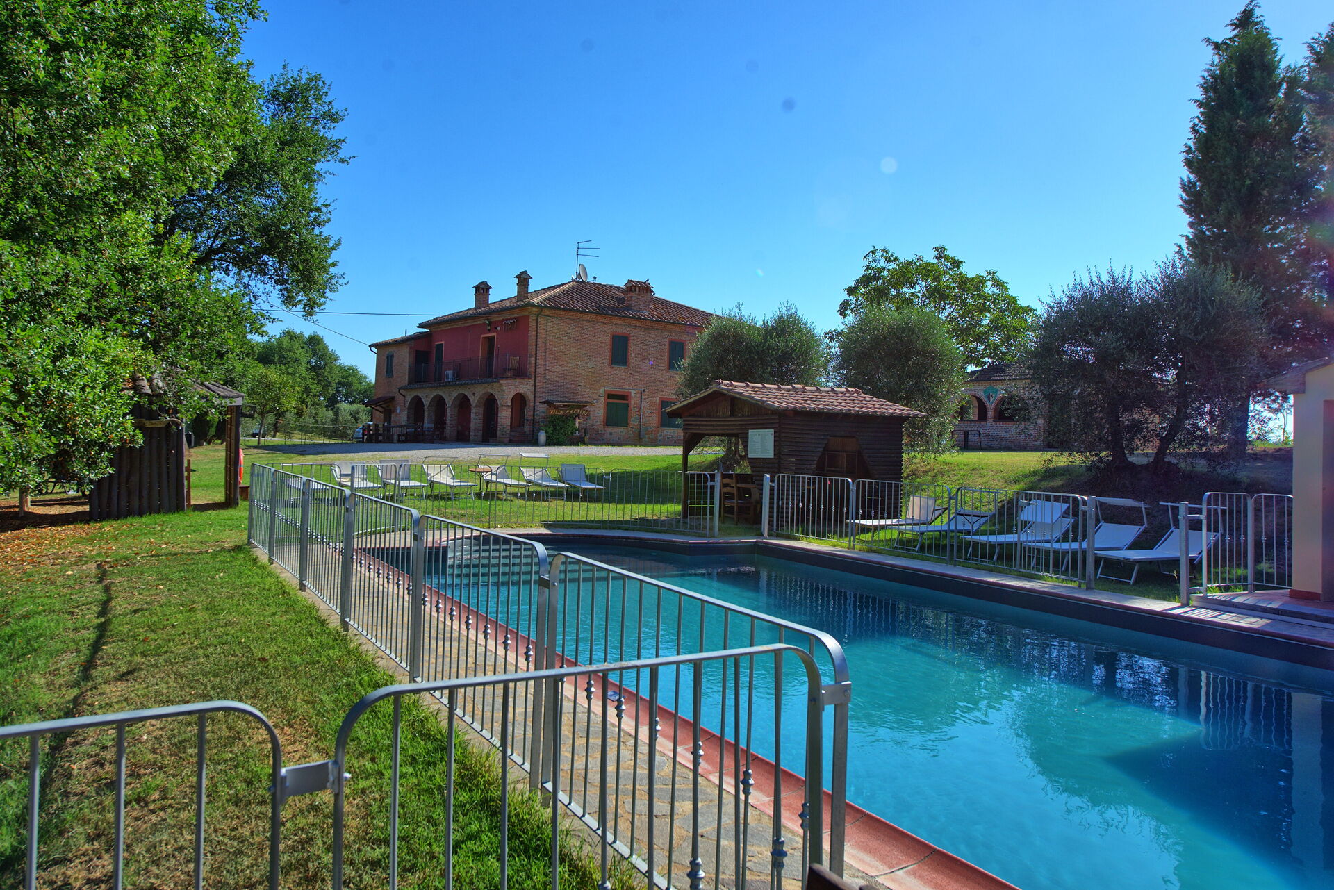 All'esterno, il casale in affitto è avvolto dalle bellissime colline della Valdichiana. Il giardino, ampio e curato, offre meravigliose viste panoramiche ed ospita una bella piscina privata dotata di lettini, un luogo ideale per trascorrere le calde giornate estive rinfrescandosi e rilassandosi in compagnia di amici e familiari. Una bella area attrezzata per mangiare all'aperto vi permetterà di allestire le vostre cene sotto le stelle.