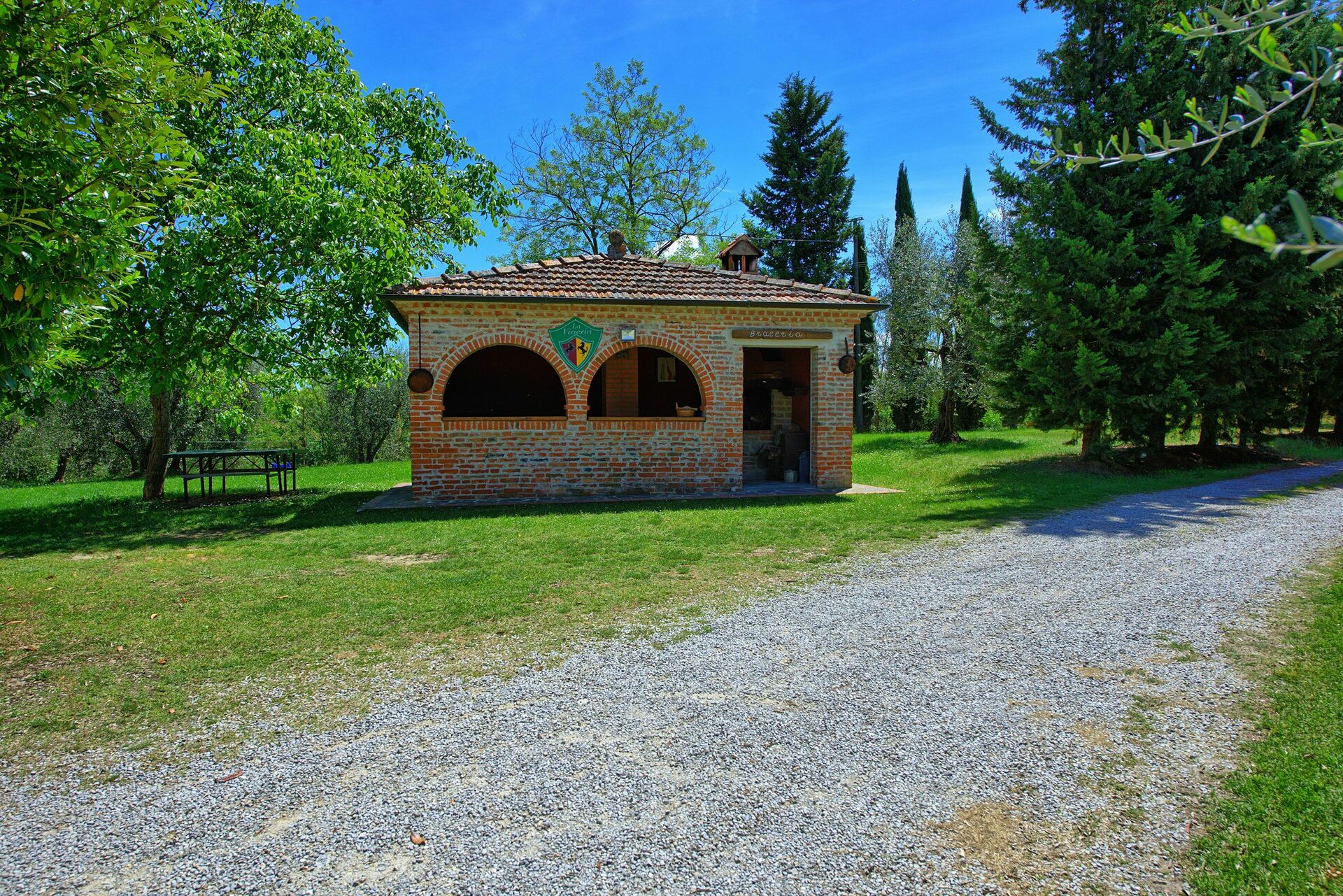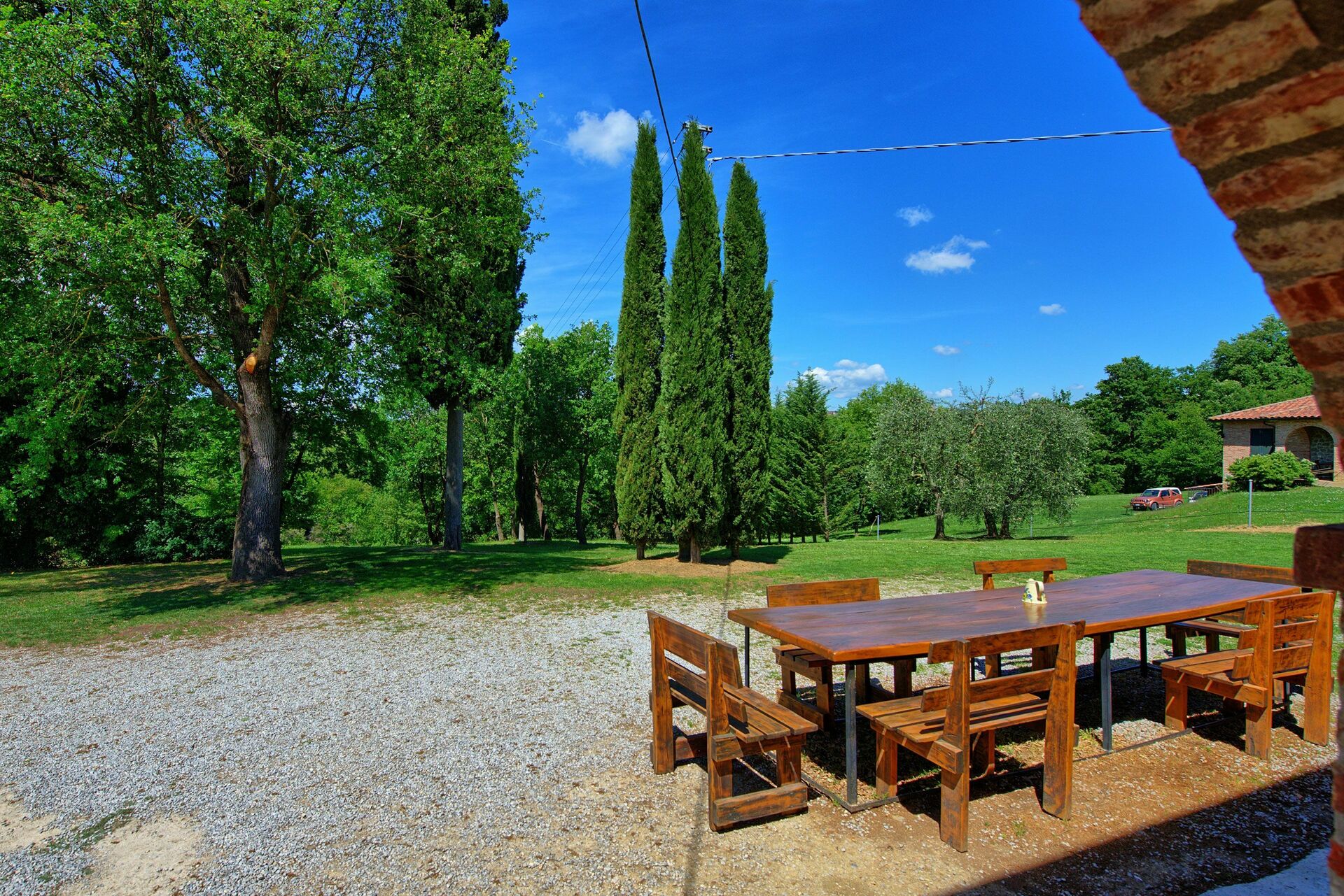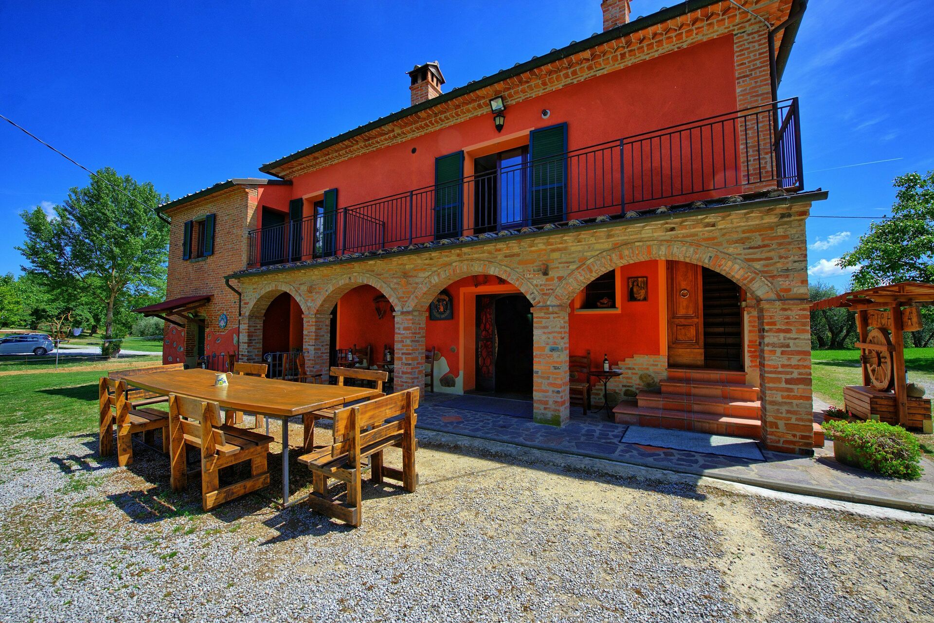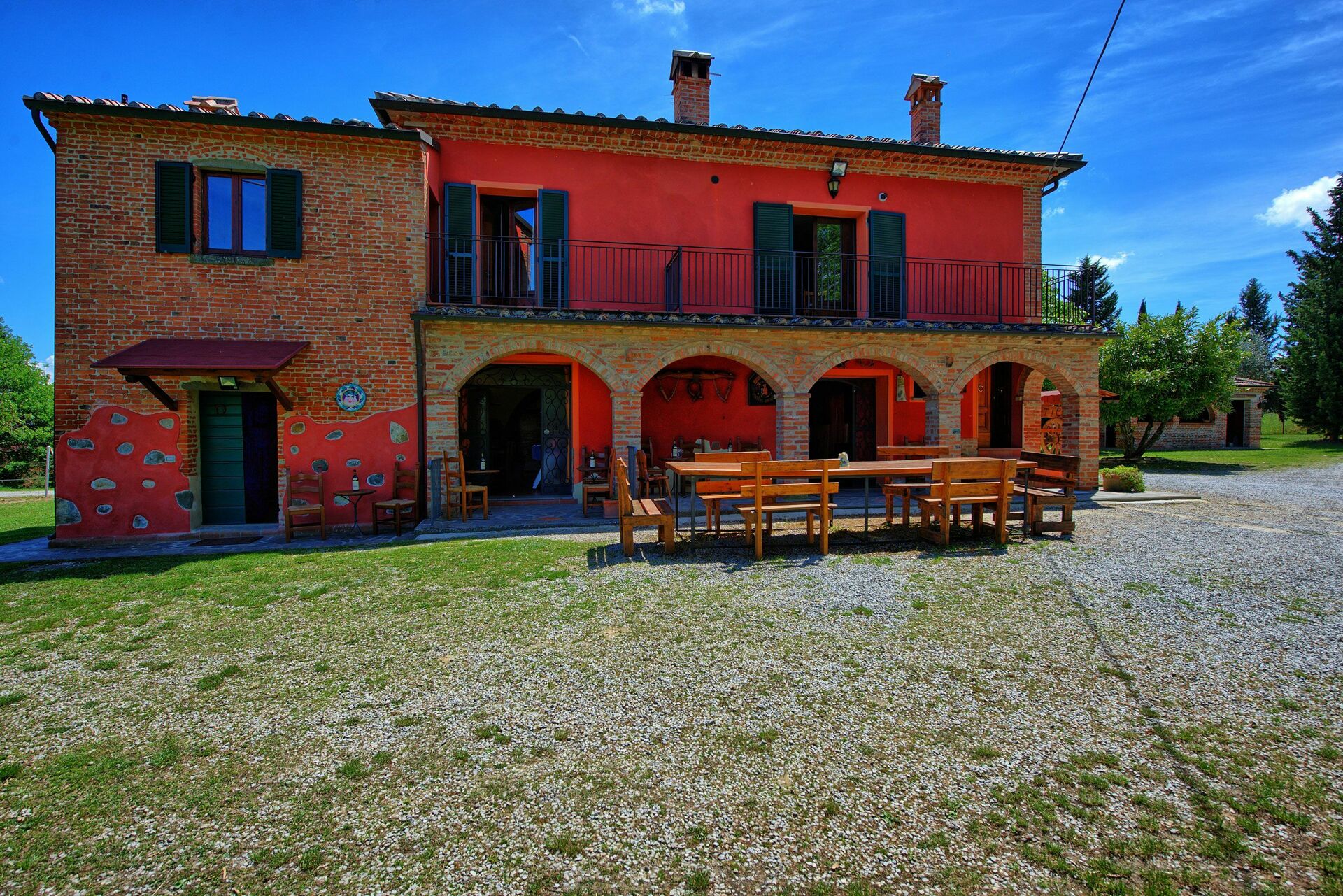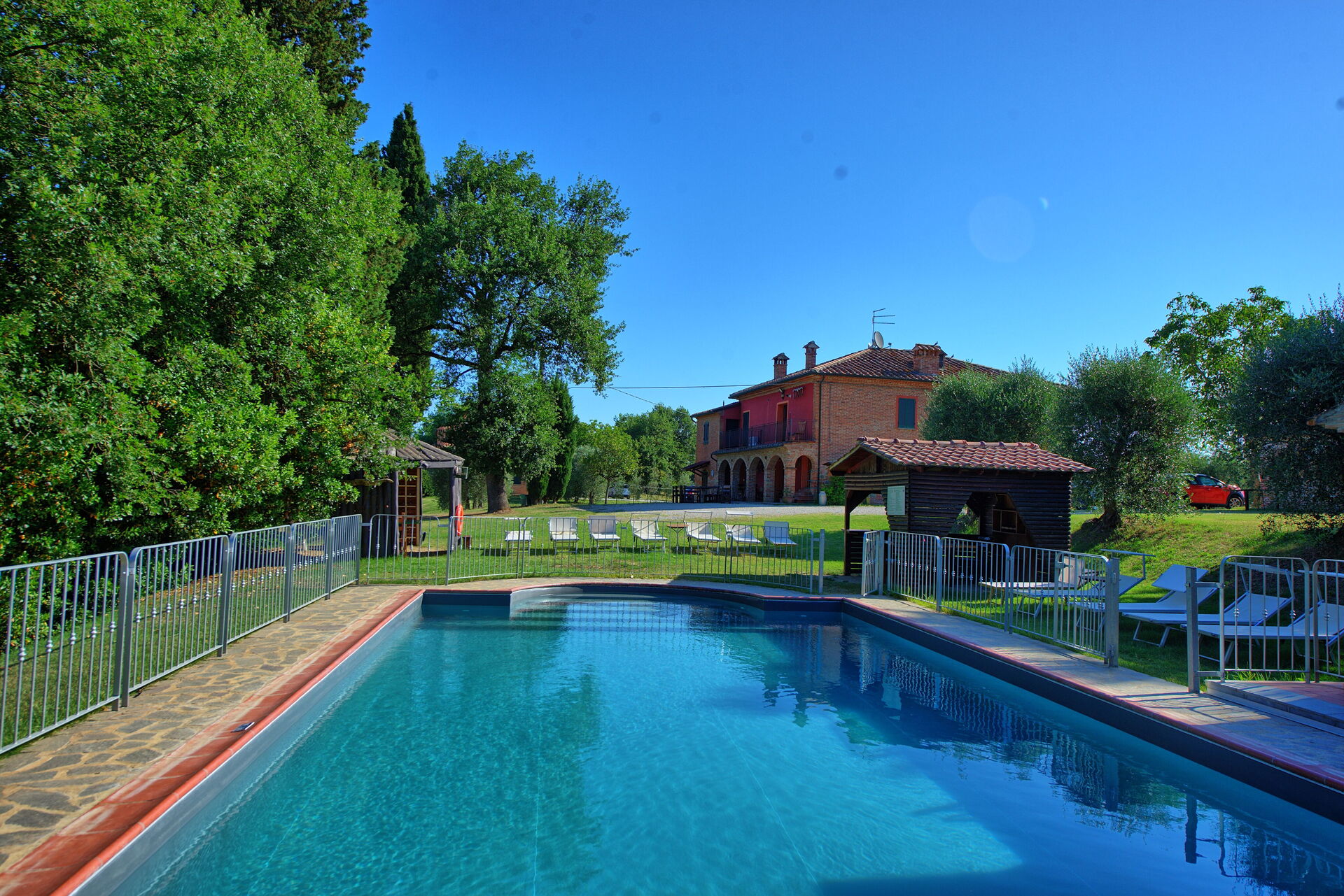 All'esterno, il casale in affitto è avvolto dalle bellissime colline della Valdichiana. Il giardino, ampio e curato, offre meravigliose viste panoramiche ed ospita una bella piscina privata dotata di lettini, un luogo ideale per trascorrere le calde giornate estive rinfrescandosi e rilassandosi in compagnia di amici e familiari. Una bella area attrezzata per mangiare all'aperto vi permetterà di allestire le vostre cene sotto le stelle.