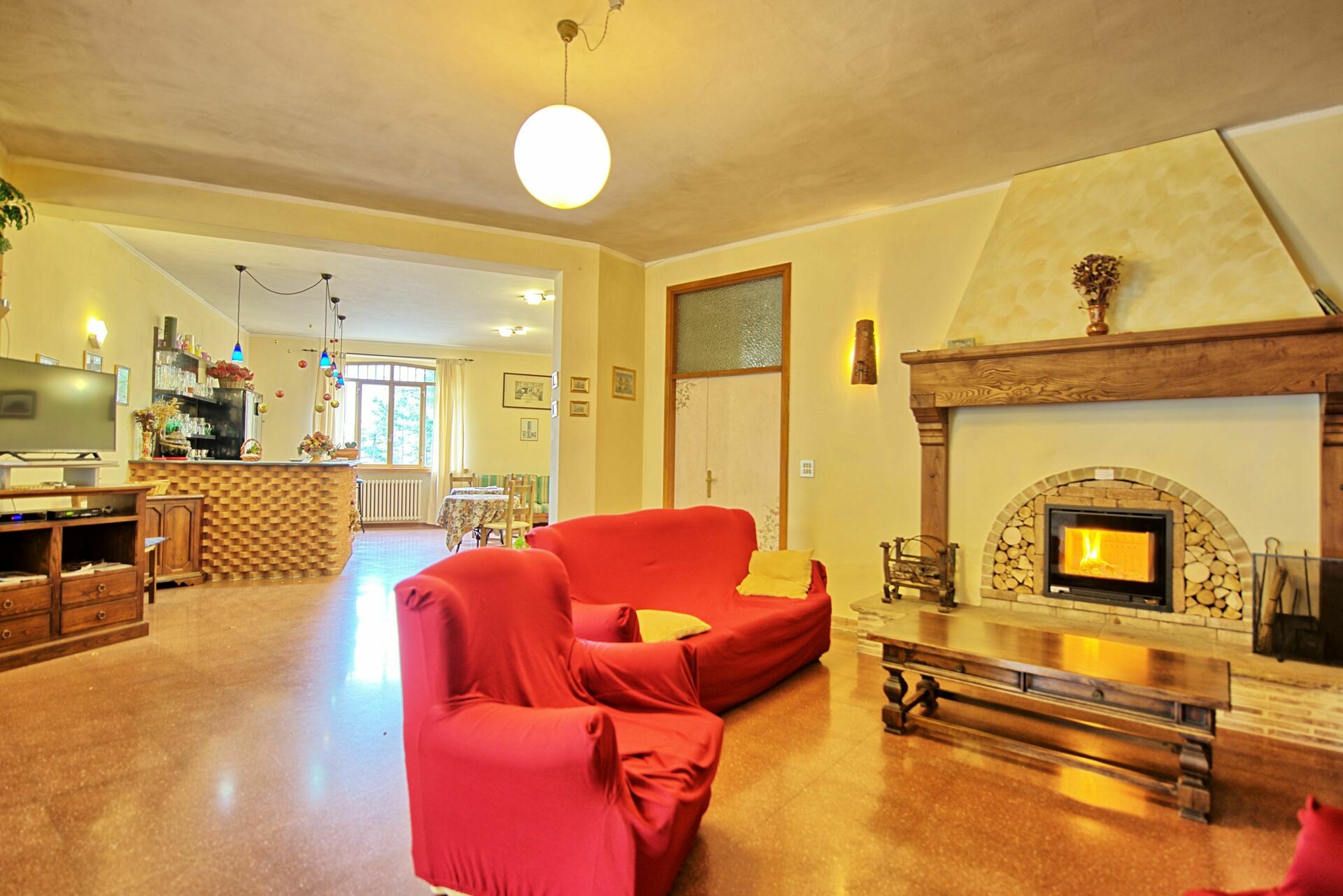 Piano terreno rialzato: ingresso su soggiorno (TV satellitare e DVD) con camino e ampia zona pranzo con stufa a pellet da cui si accede ad una terrazza, cucina (barbecue, microonde, forno, freezer, lavastoviglie), 2 WC.