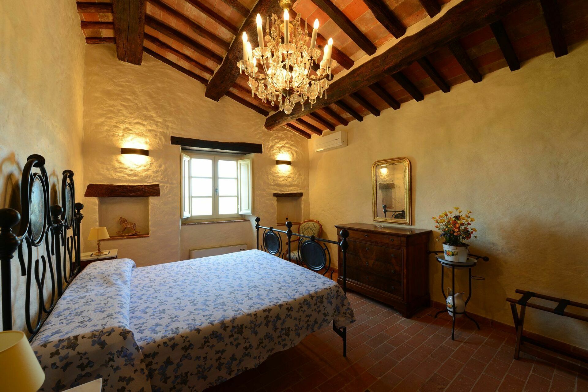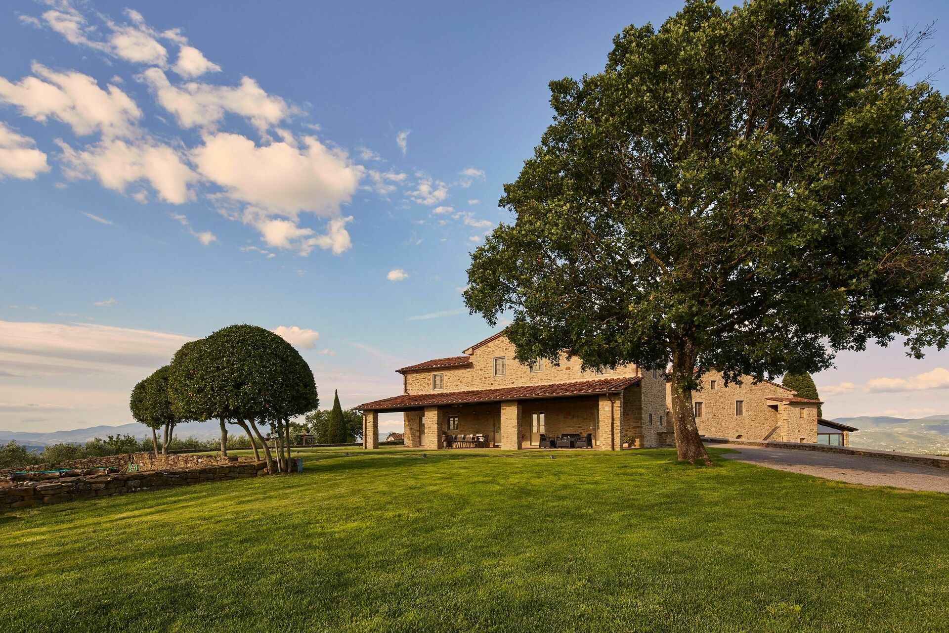 Bella villa ricavata dall’attenta ristrutturazione di un nucleo di case situate sulla sommità di una collina che domina tutta la Valdichiana e la città di Arezzo. All’interno della proprietà (completamente recintata) è presente (oltre alla villa in affitto) la casa dei proprietari e una bellissima chiesetta risalente al VII secolo. Il giardino che circonda la casa è molto curato e ampio ed offre una splendida e panoramica piscina è riservata all’uso esclusivo degli ospiti. La villa è stata suddivisa in 4 appartamenti ma tramite l’apertura di porte interne viene affittata come un’unica abitazione. Gli interni sono confortevoli e arredati con gusto. Al pian terreno gli ospiti possono disporre di un ampio porticato attrezzato ideale per mangiare all’aperto.