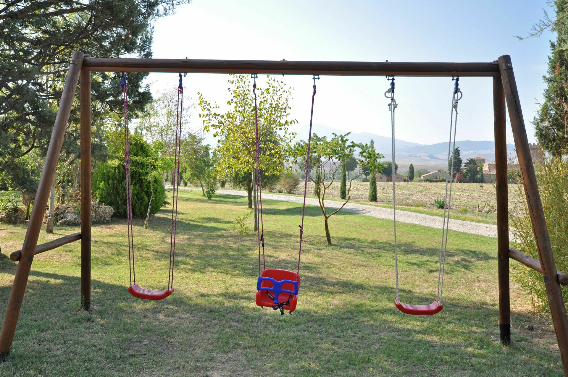 A disposizione degli ospiti: ampio giardino attrezzato con tavolo, sedie, barbecue, altalena per bambini, piscina riservata all’uso esclusivo degli ospiti (12 x 6 m - profondità minima 1,1 m - profondità massima 1,3 m - aperta dal 01/05 al 30/09), doccia esterna (solo acqua fredda) in prossimità della piscina. Parcheggio all’interno della proprietà.