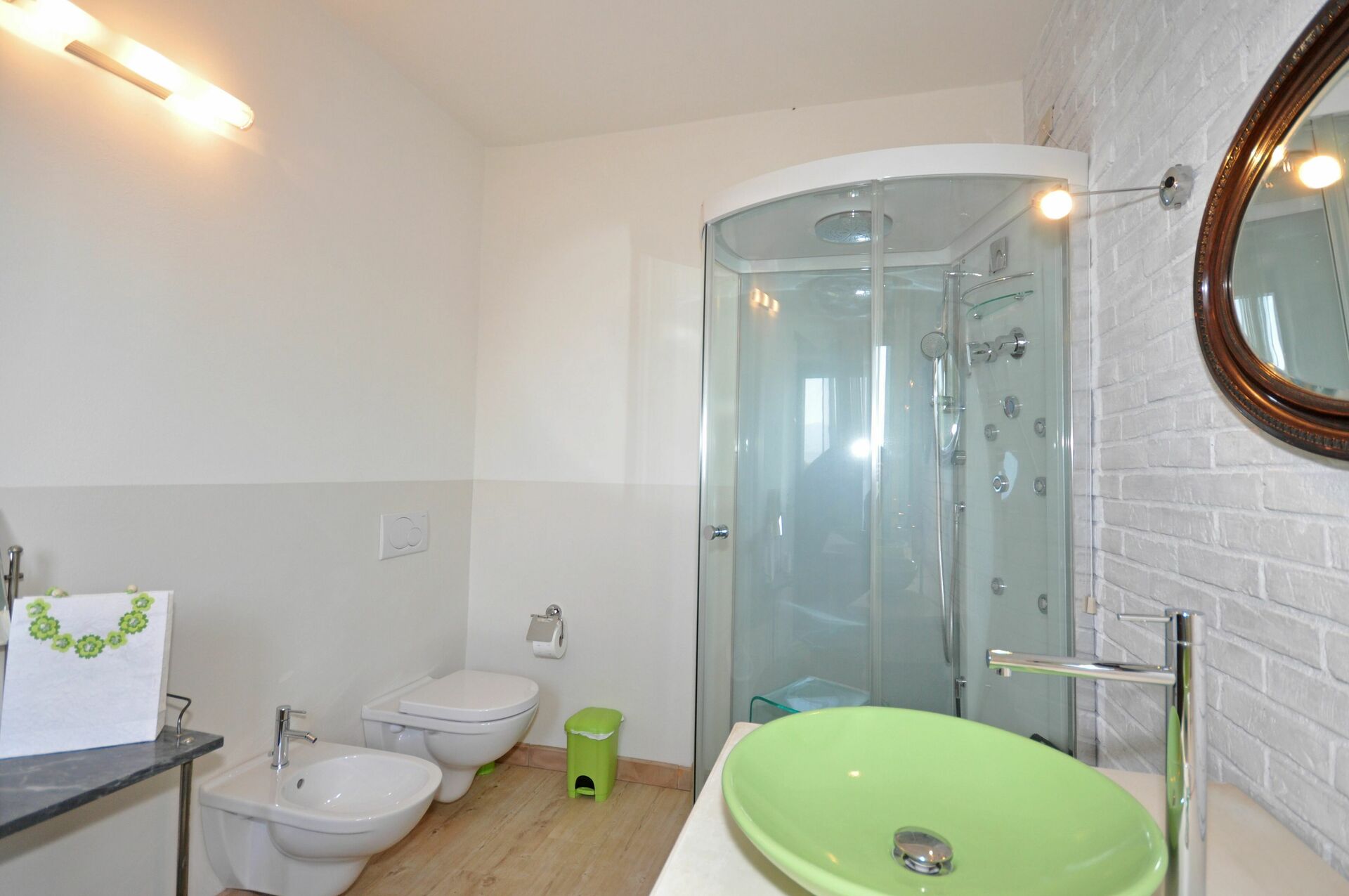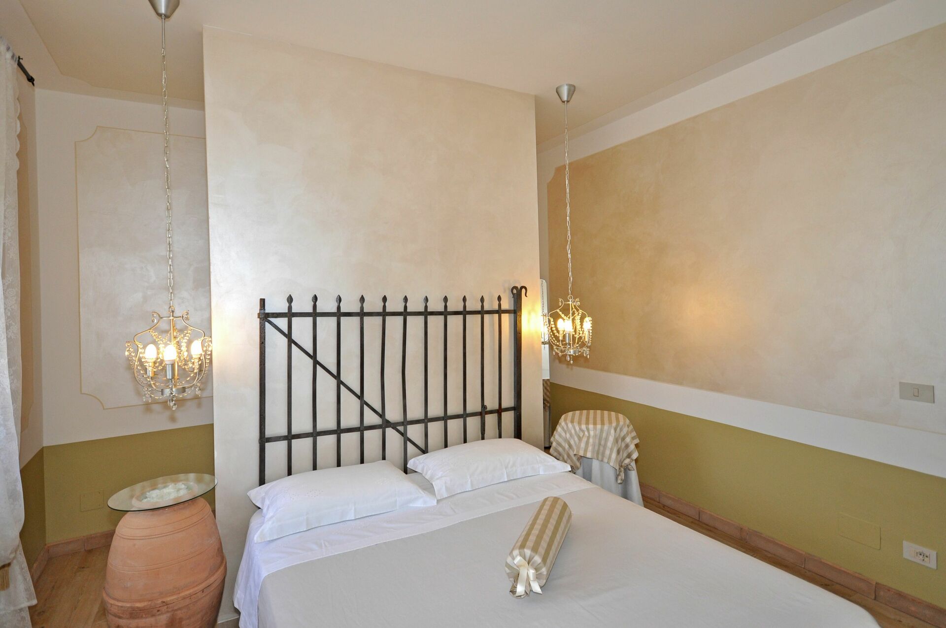Piano terreno: camera matrimoniale con bagno privato con doccia (senza finestra). Questa camera è accessibile solo dall’esterno. Stanza adibita a lavanderia con lavatrice, asse e ferro da stiro.