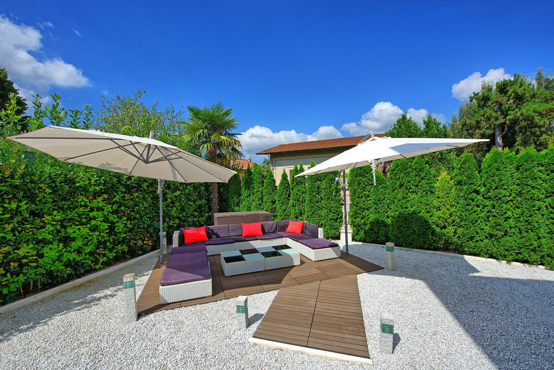Esternamente un perfetto giardino circonda la casa offrendo comodi spazi attrezzati (barbecue, poltrone, divani, tavoli e sedie per mangiare all’aperto) e una bella piscina privata.