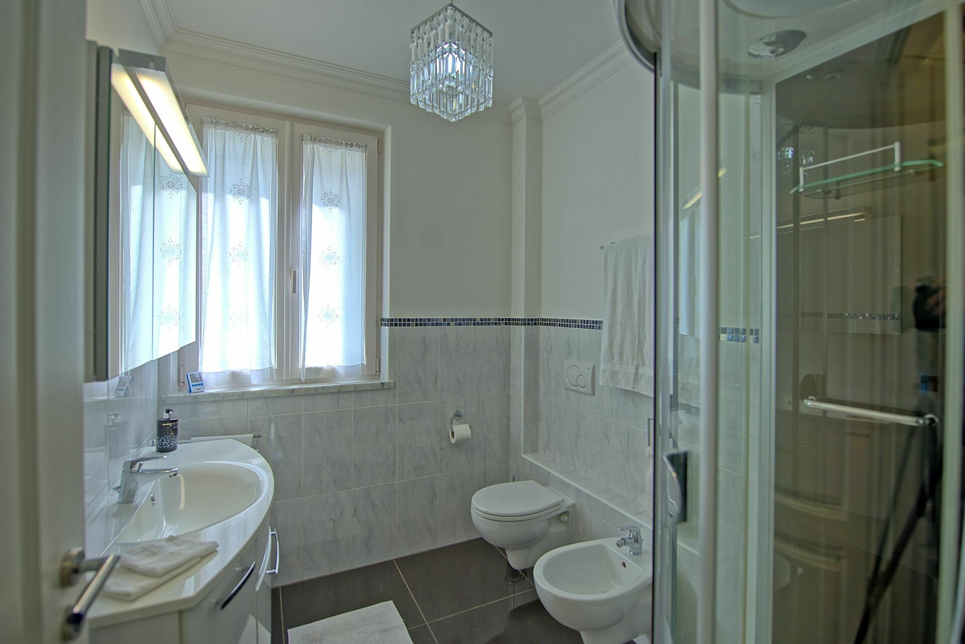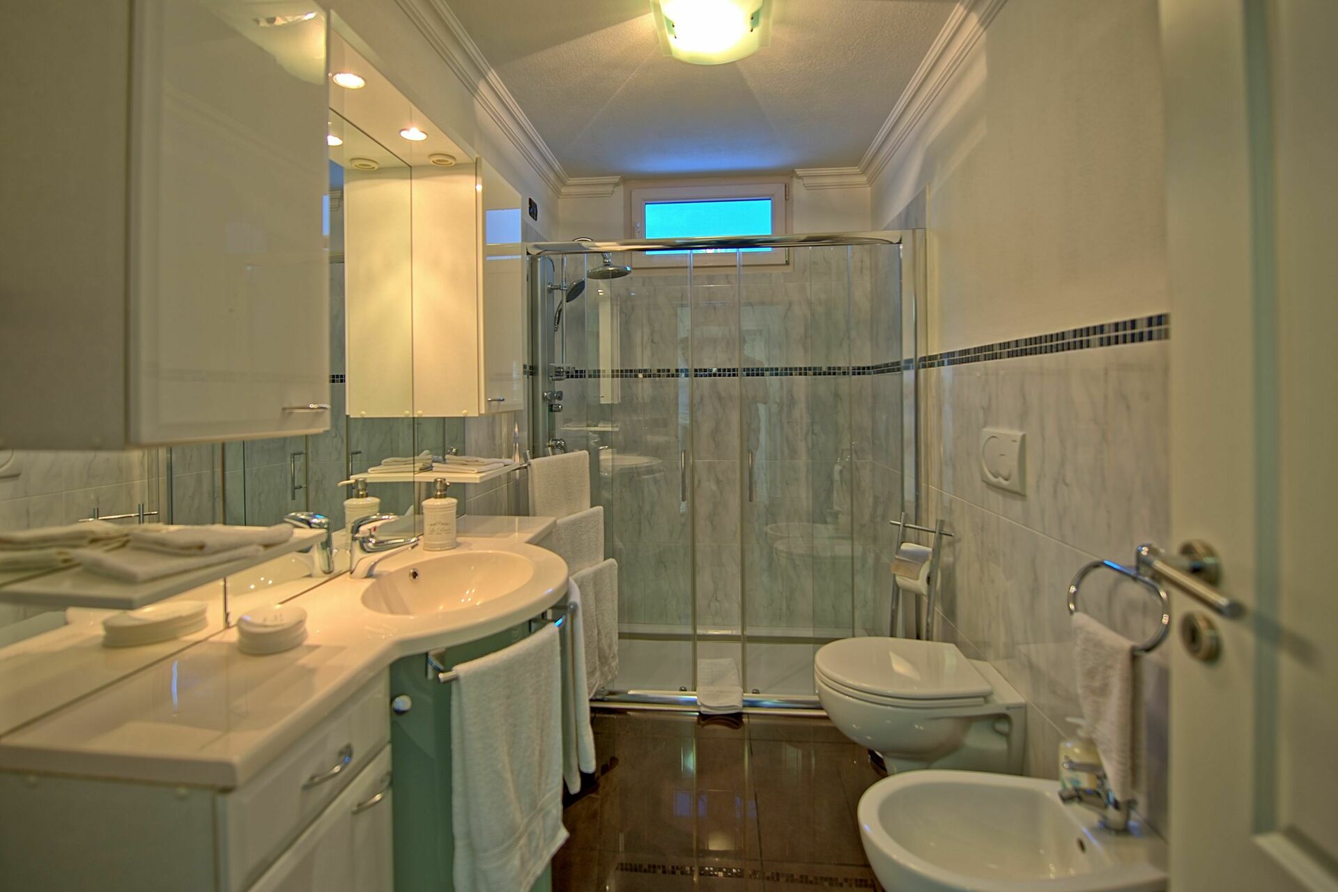 Primo piano: 2 camere ognuna con 2 letti singoli e con bagno privato con doccia idromassaggio + bagno turco, grande suite con camino, letto matrimoniale e bagno con doccia e vasca idromassaggio.
