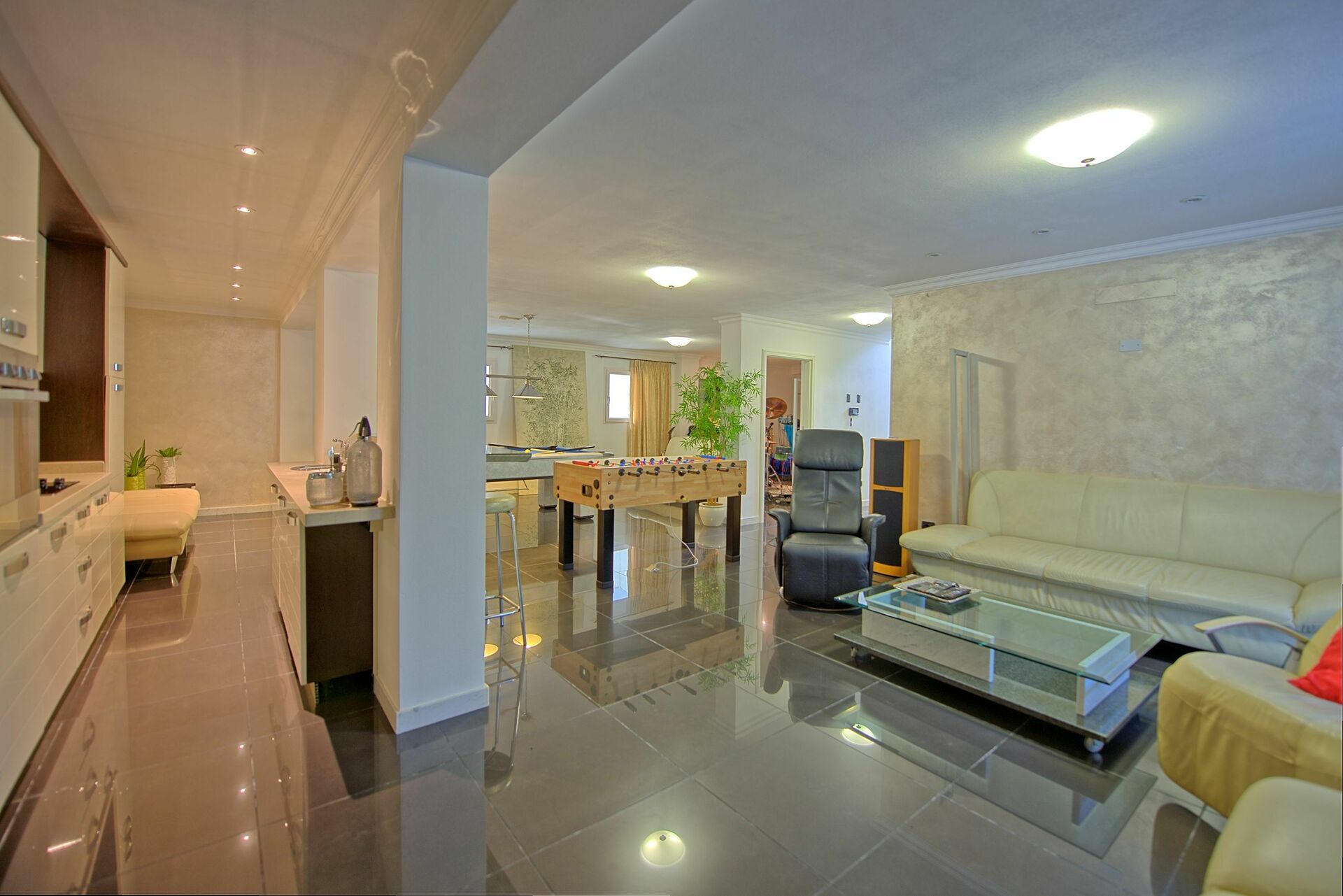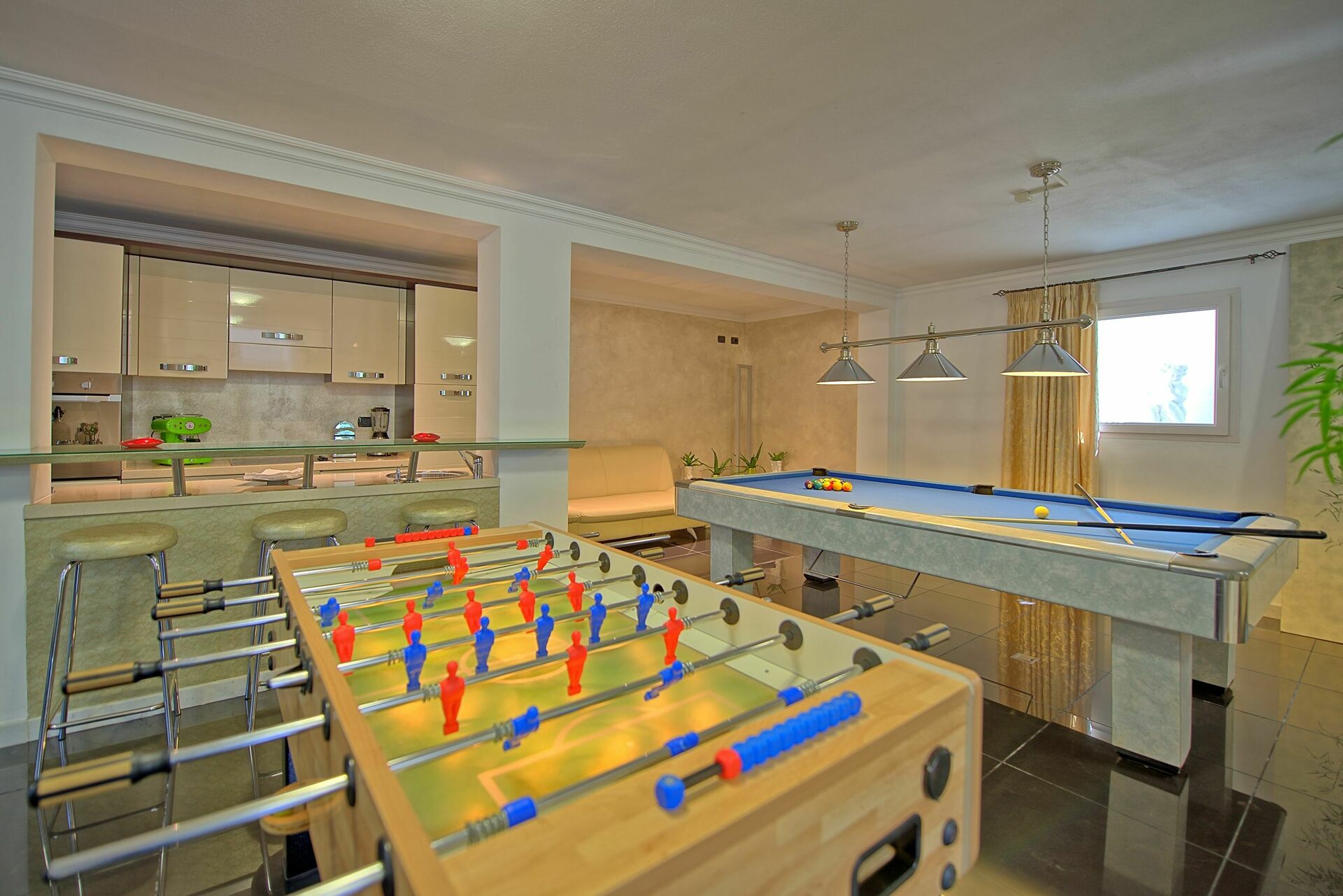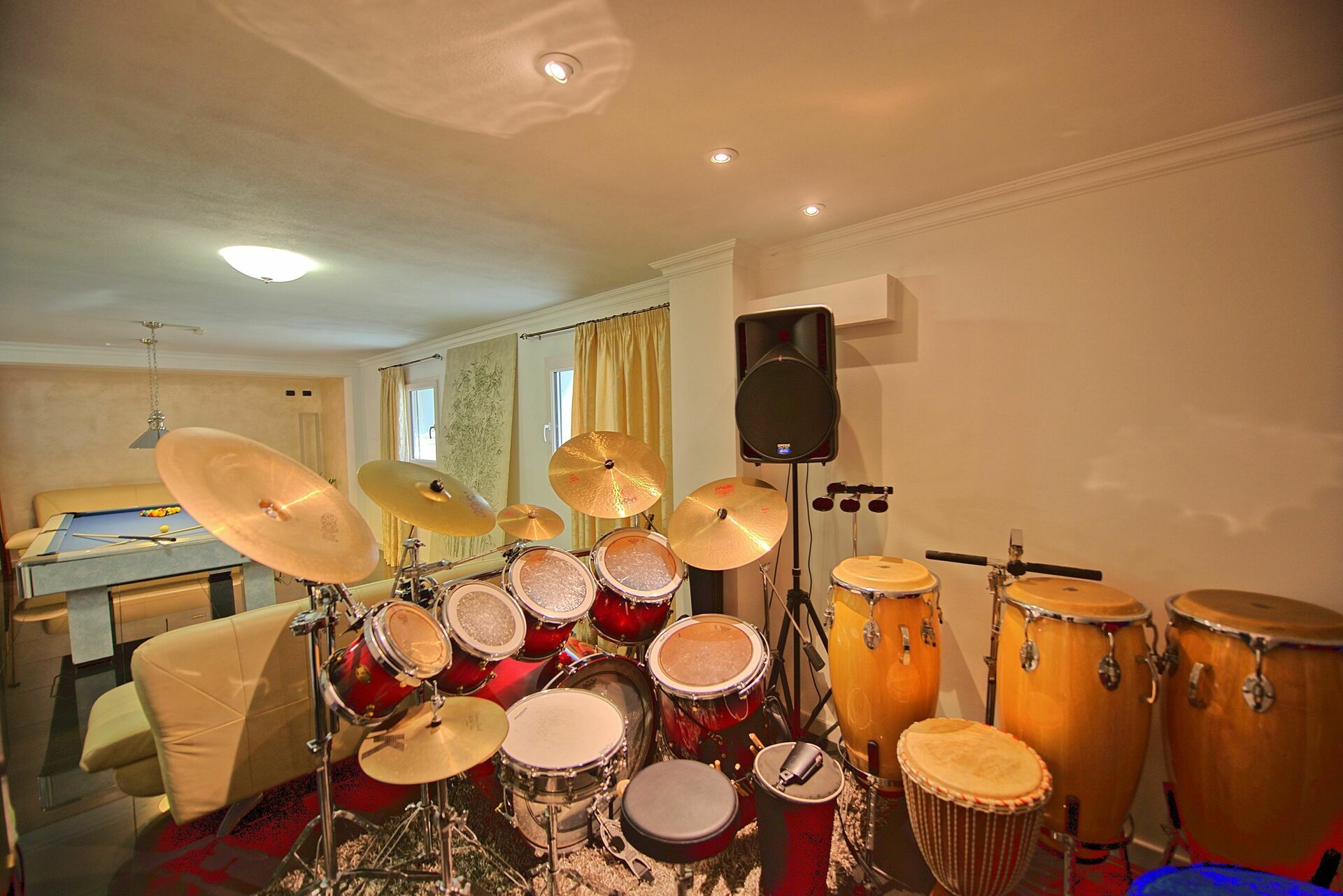 Oltre alla cura dell’arredamento è stata posta molta attenzione alla tecnologia e allo svago degli ospiti: oltre ad un impianto di filodiffusione (collegabile con bluetooth al vostro smartphone o tablet o pc) gli ospiti della villa possono usufruire di un intero piano della casa dedicato al divertimento. Una bella area cinema con impianto stereo vi farà guardare i film come al cinema e un’attrezzata sala prove vi metterà a disposizione batteria, tastiera, microfoni e impianto karaoke. Un biliardo e un calcio balilla sono nella stessa sala.