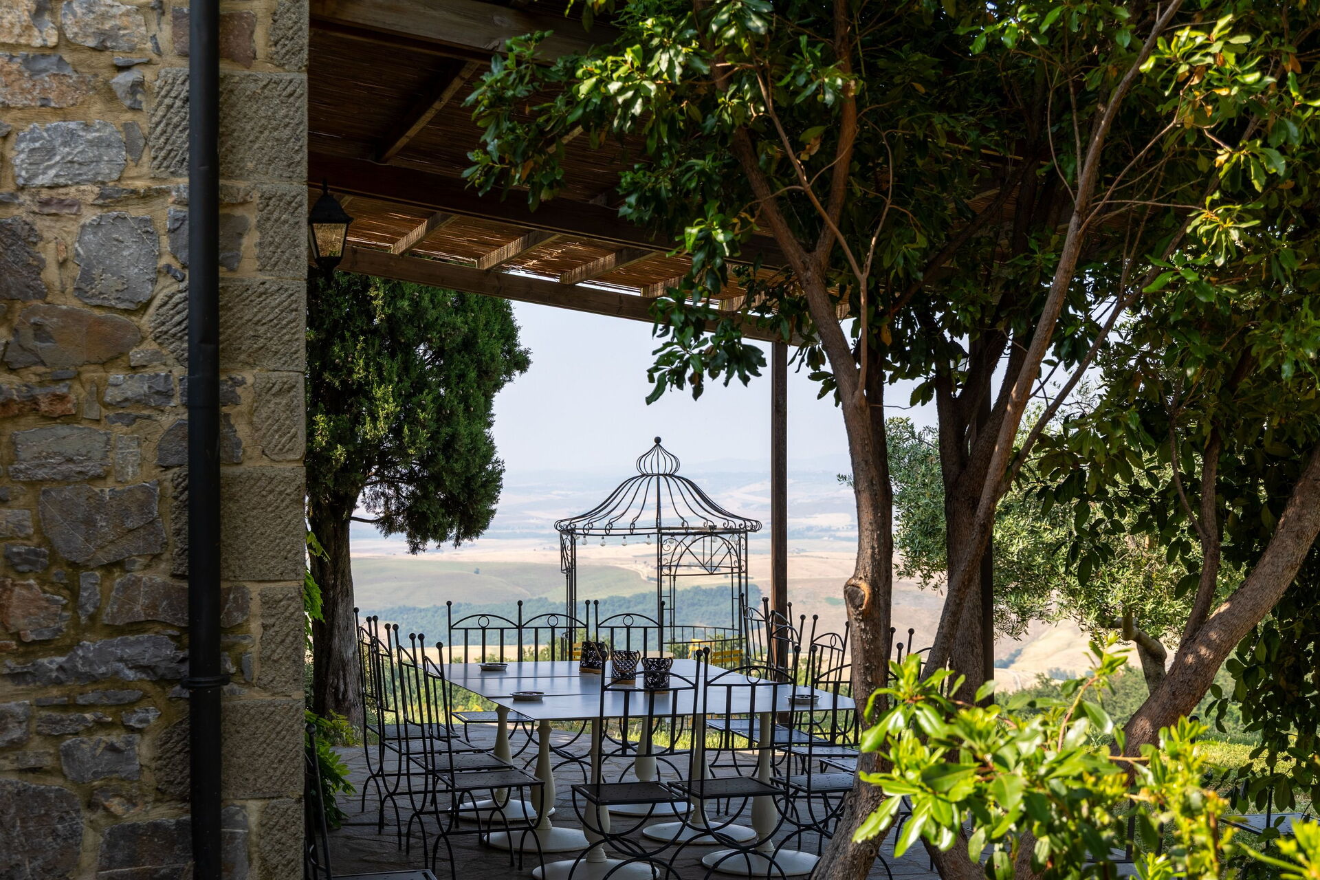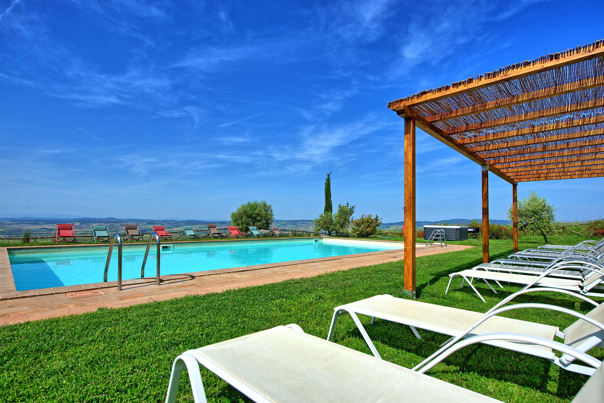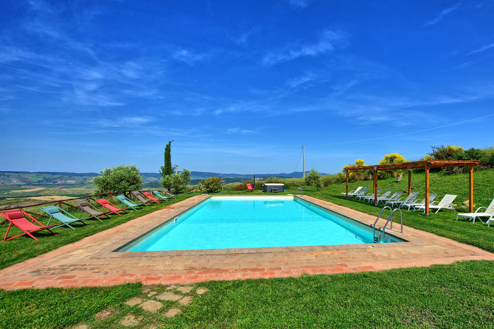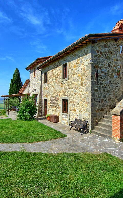 Il Casale è avvolto da un meraviglioso paesaggio collinare, caratteristico della Val d'Orcia e della Toscana. Un bel giardino curato, ricco di alberi e piante, circonda la casa vacanze ed ospita un'ampia piscina privata dotata di solarium con lettini ed ombrelloni e una vasca idromassaggio Jacuzzi: il luogo perfetto dove trascorrere lunghe giornate di sole, rilassandosi e rinfrescandosi a bordo vasca. A disposizione degli ospiti vi è anche un'area barbecue e numerose aree attrezzate con tavoli e sedie, perfette per mangiare tutti insieme all'aperto, ammirando la vista panoramica che si estende sulle colline circostanti.