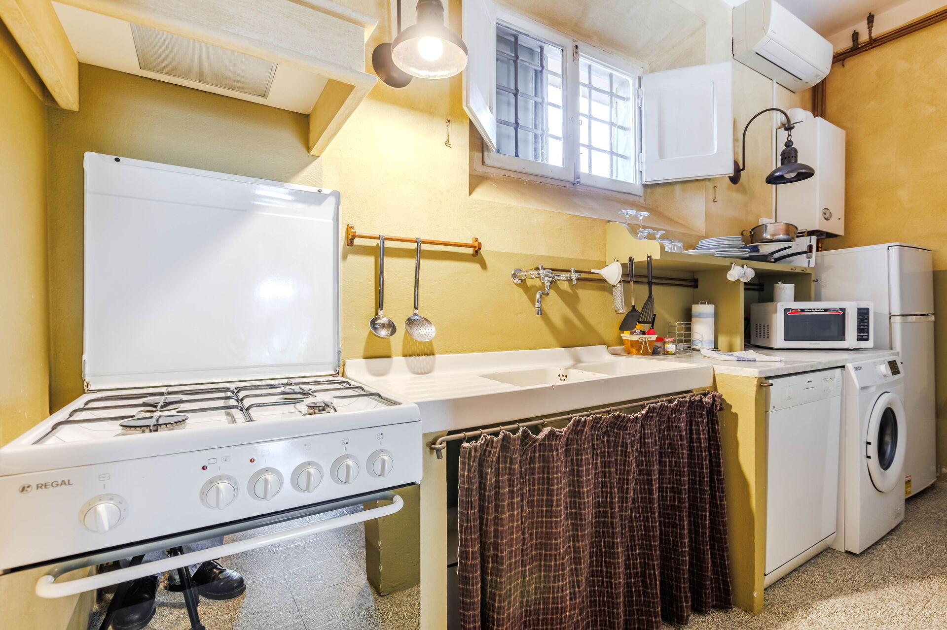 Piano terreno: monolocale con letto matrimoniale (aria condizionata) e zona pranzo con angolo cottura (piano cottura, frigo, forno, microonde, macchina da caffè, lavastoviglie), bagno con doccia.