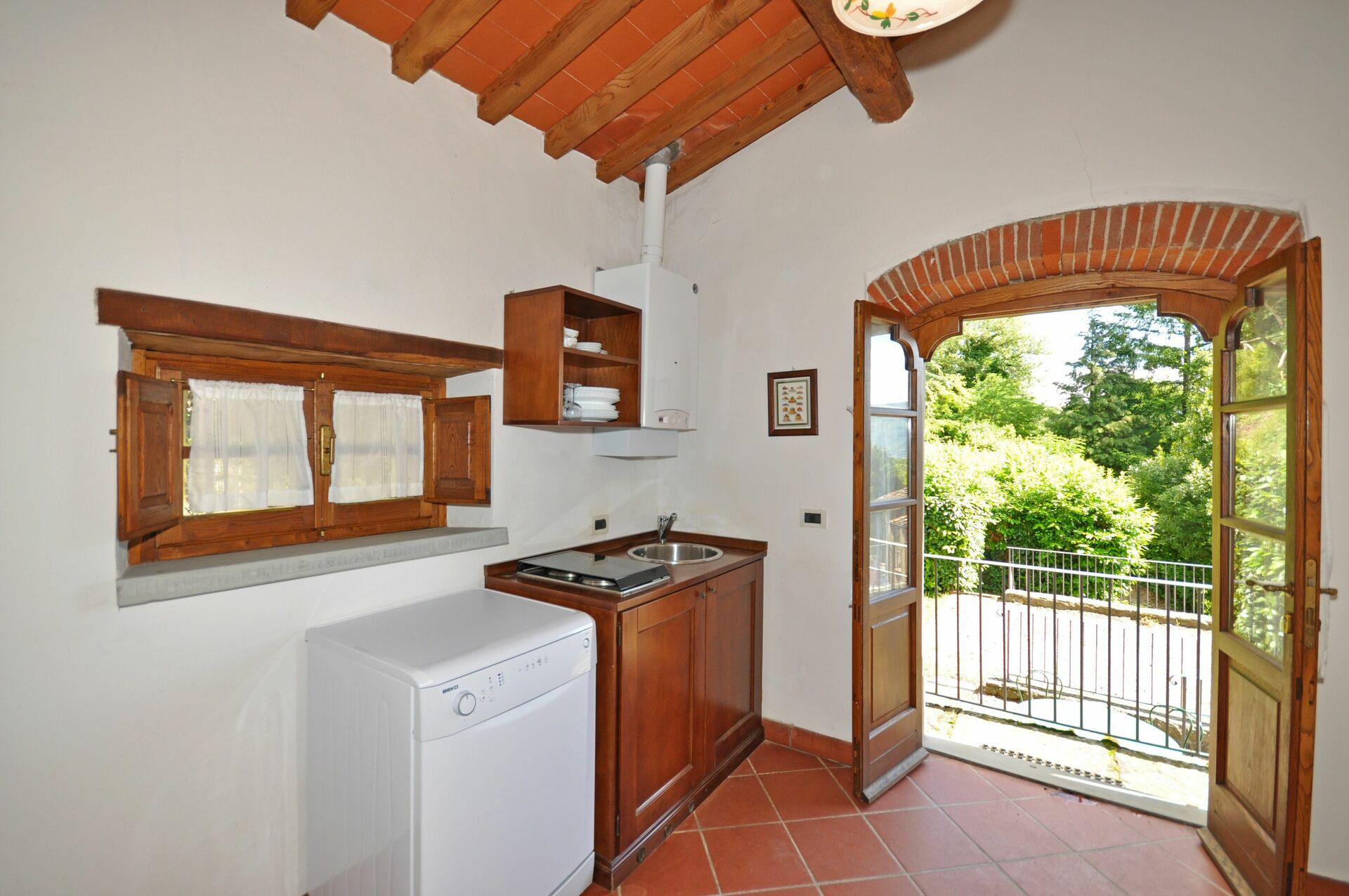 1° Piano (accesso tramite terrazza privata ed attrezzata con tavolo e sedie): angolo cottura (lavastoviglie, freezer, 2 piastre elettriche), bagno con vasca (asciugacapelli).