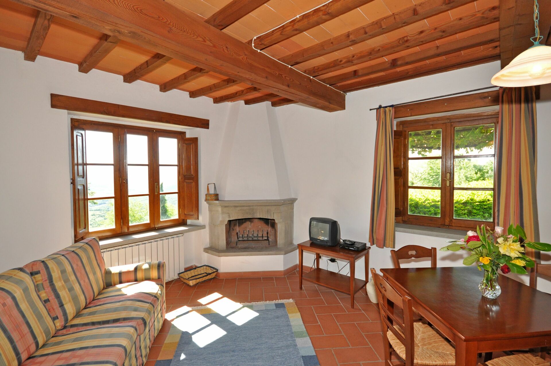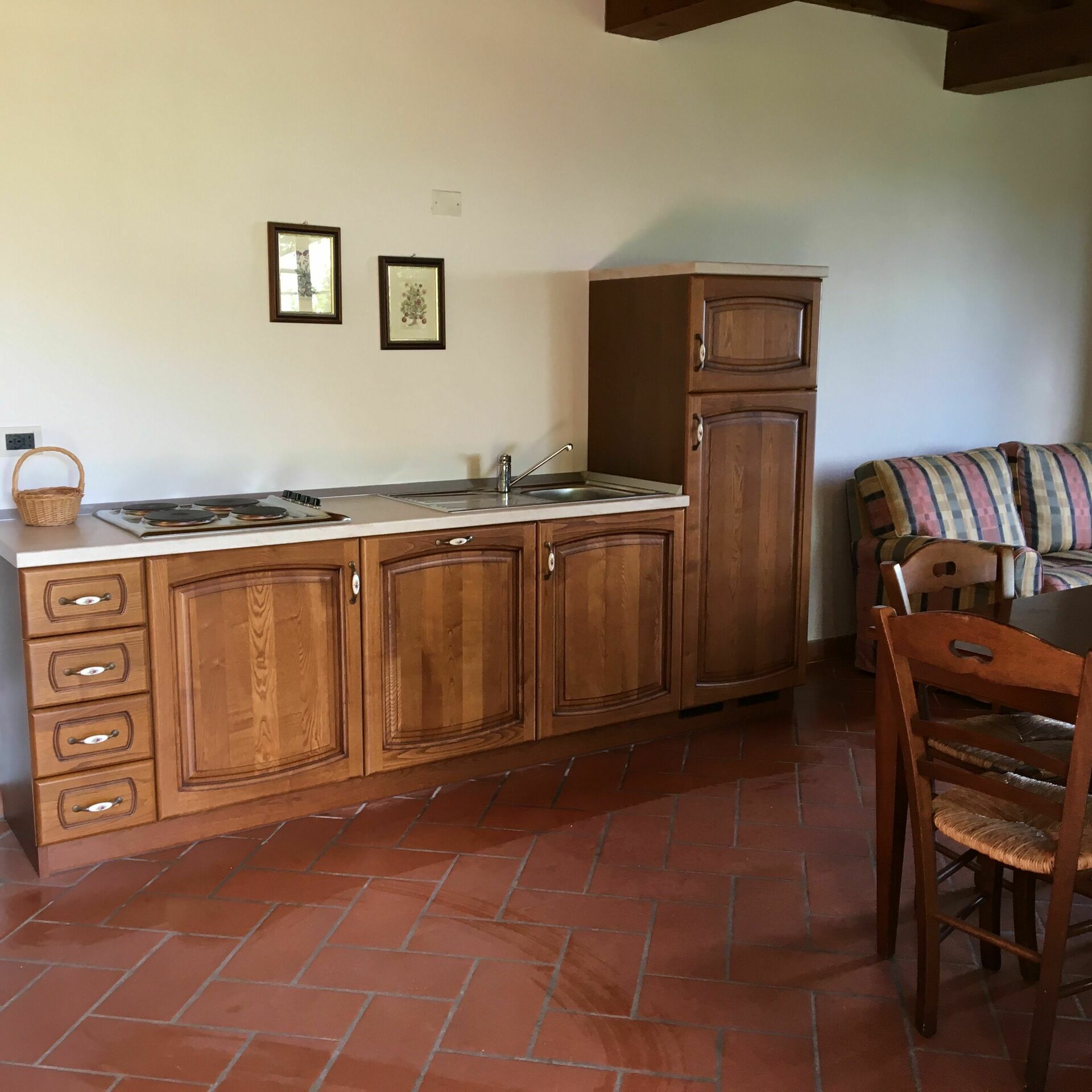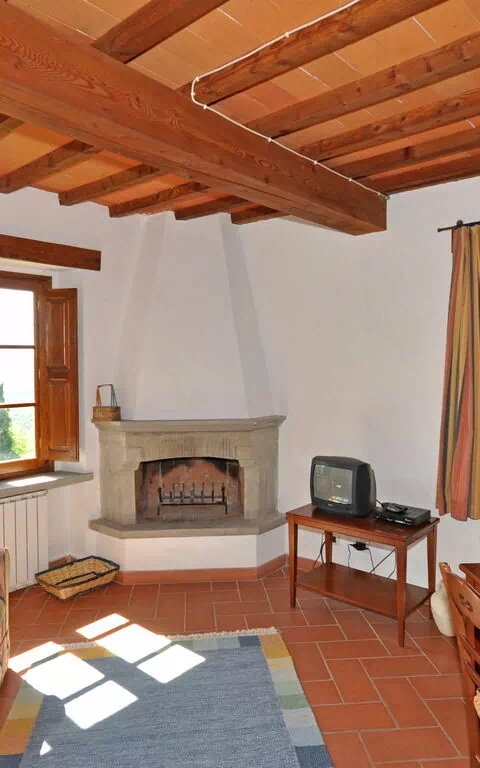 Piano terreno: soggiorno con camino (TV satellitare), angolo cottura (4 piastre elettriche) e zona pranzo con accesso ad una veranda coperta, privata ed attrezzata con tavolo e sedie.