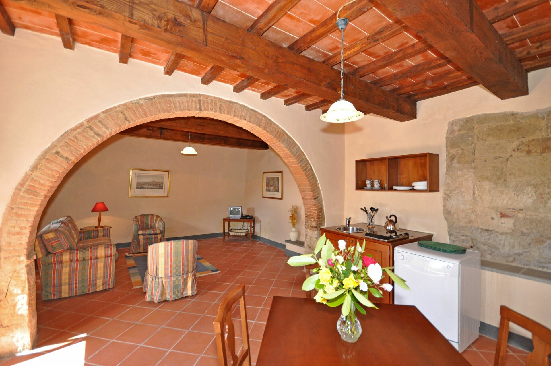 Piano terreno: soggiorno (TV satellitare), angolo cottura (lavastoviglie, 4 piastre elettriche), zona pranzo e accesso diretto al giardino con spazio esterno privato e attrezzato.