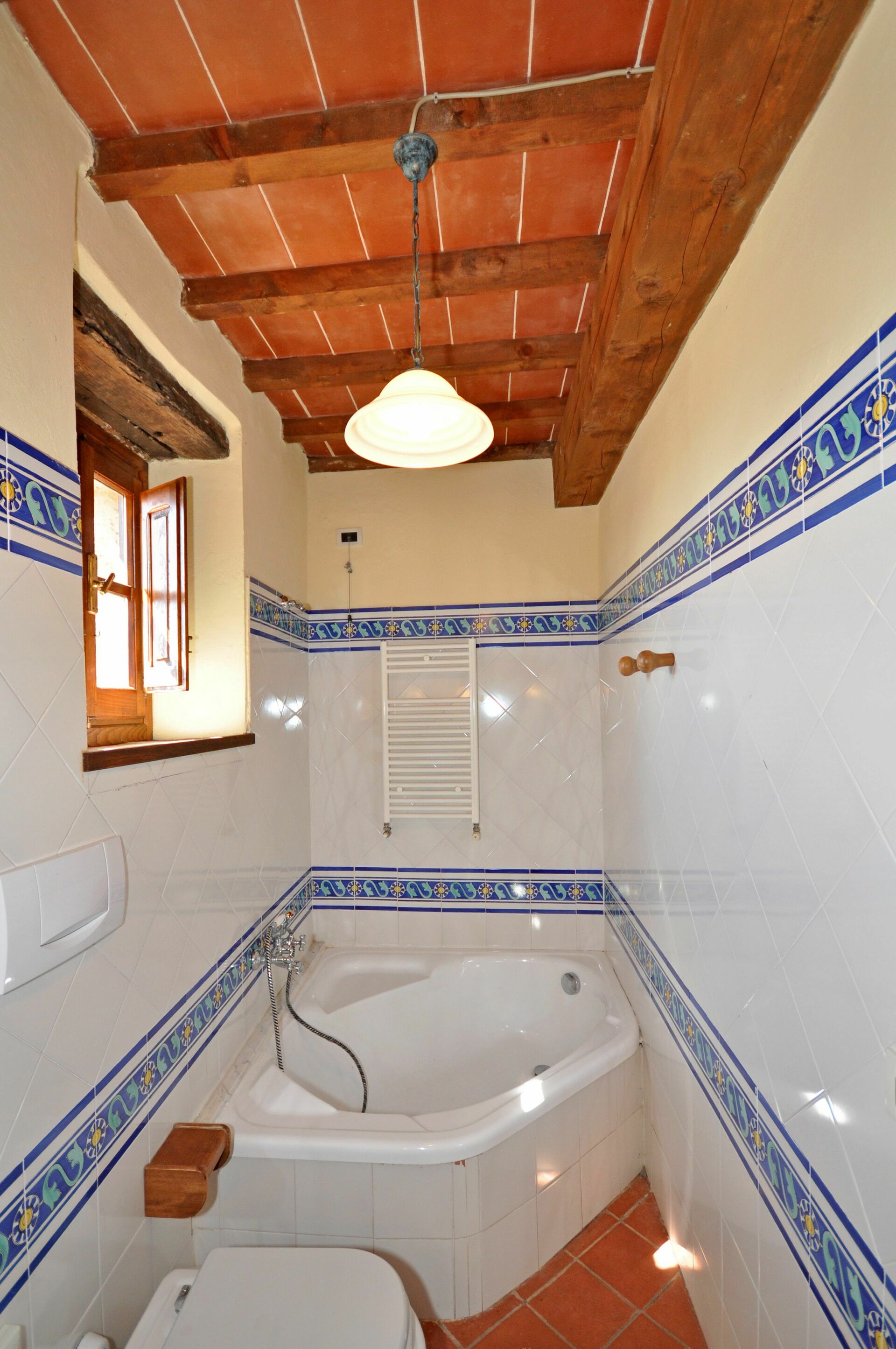 2 gradini più in basso: camera matrimoniale, bagno con vasca.